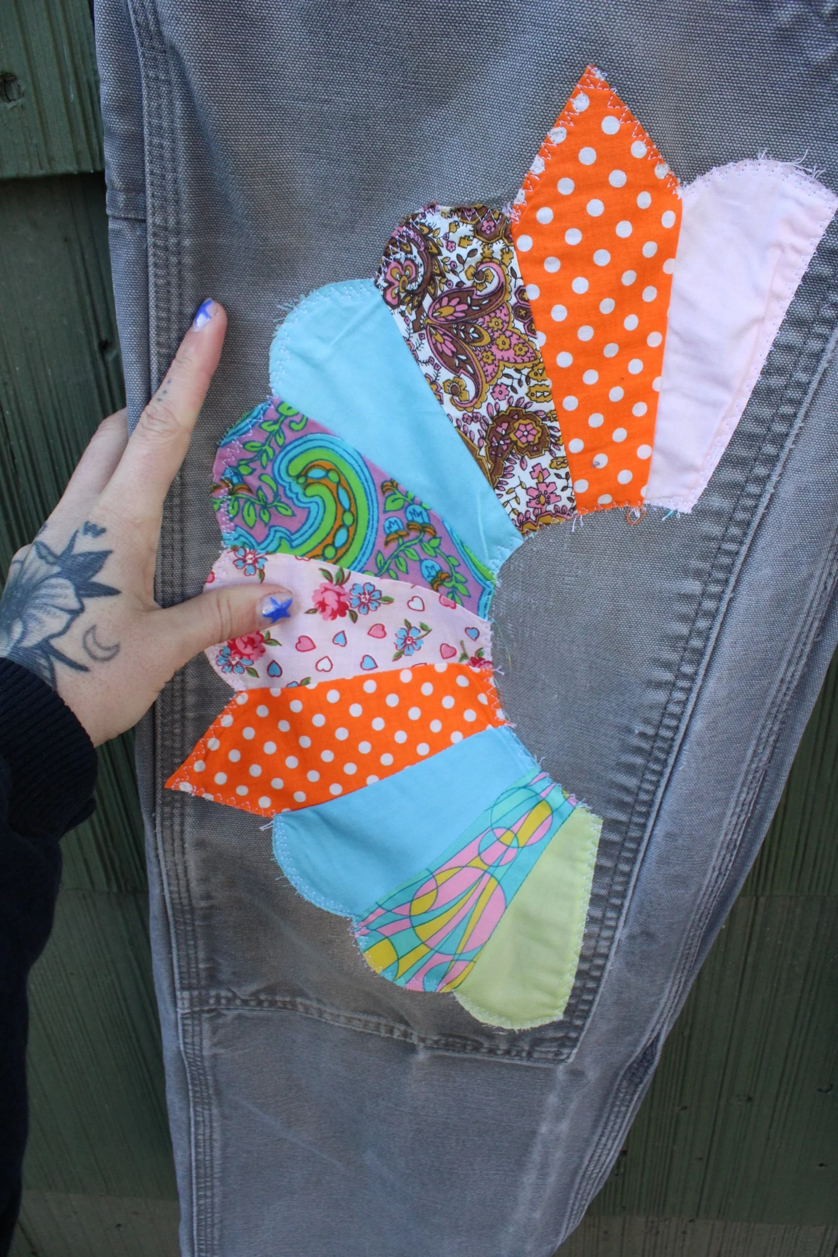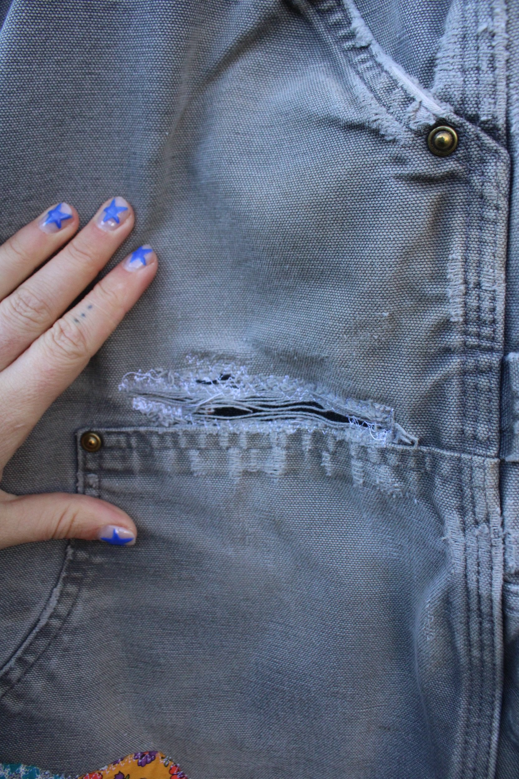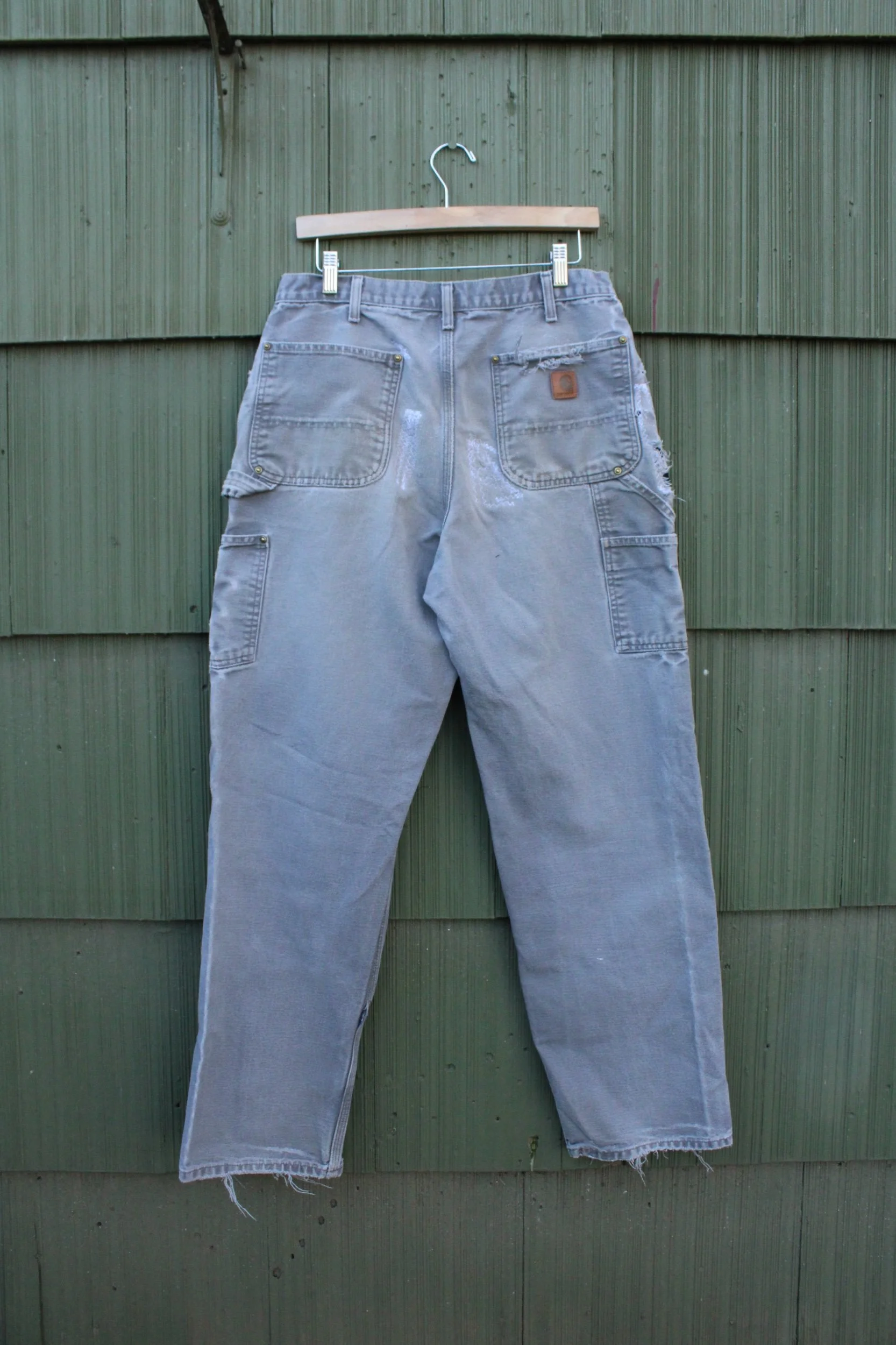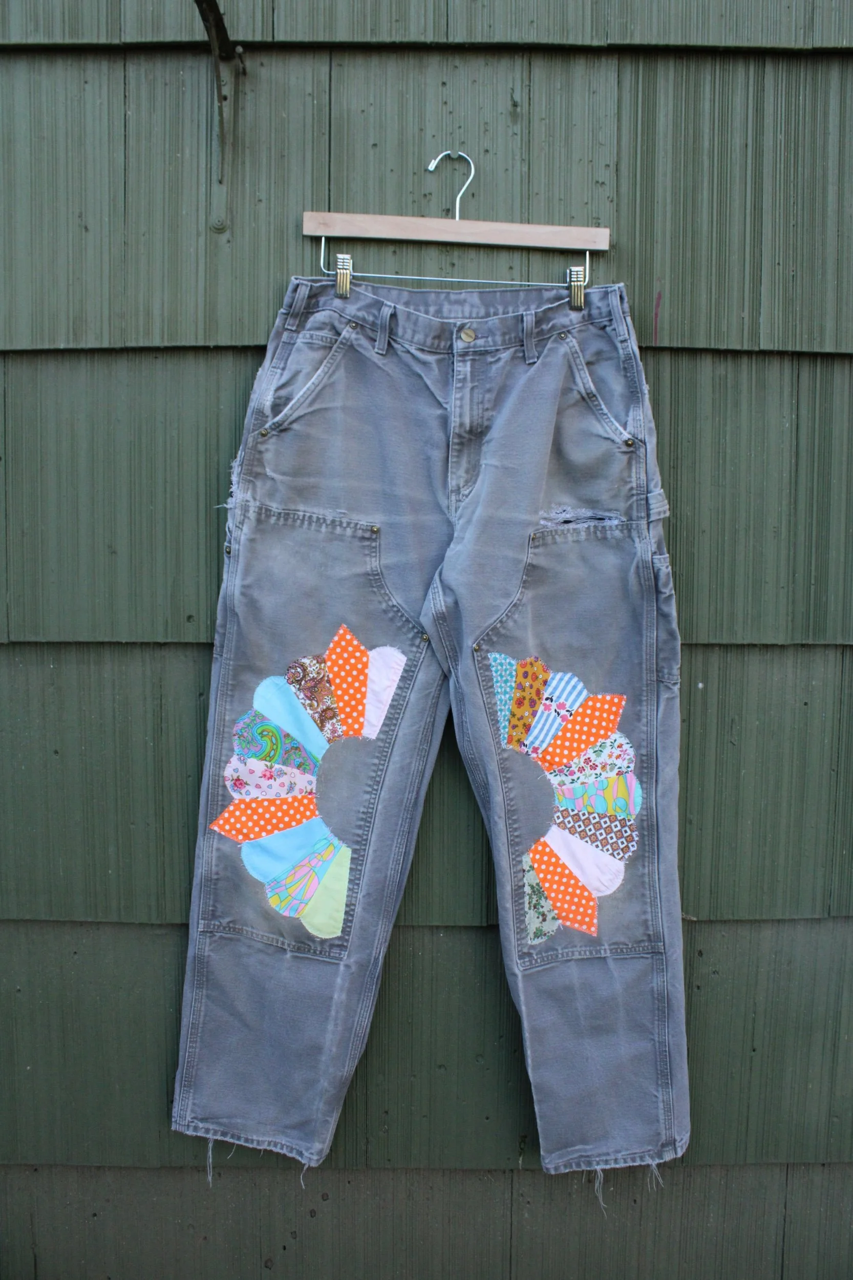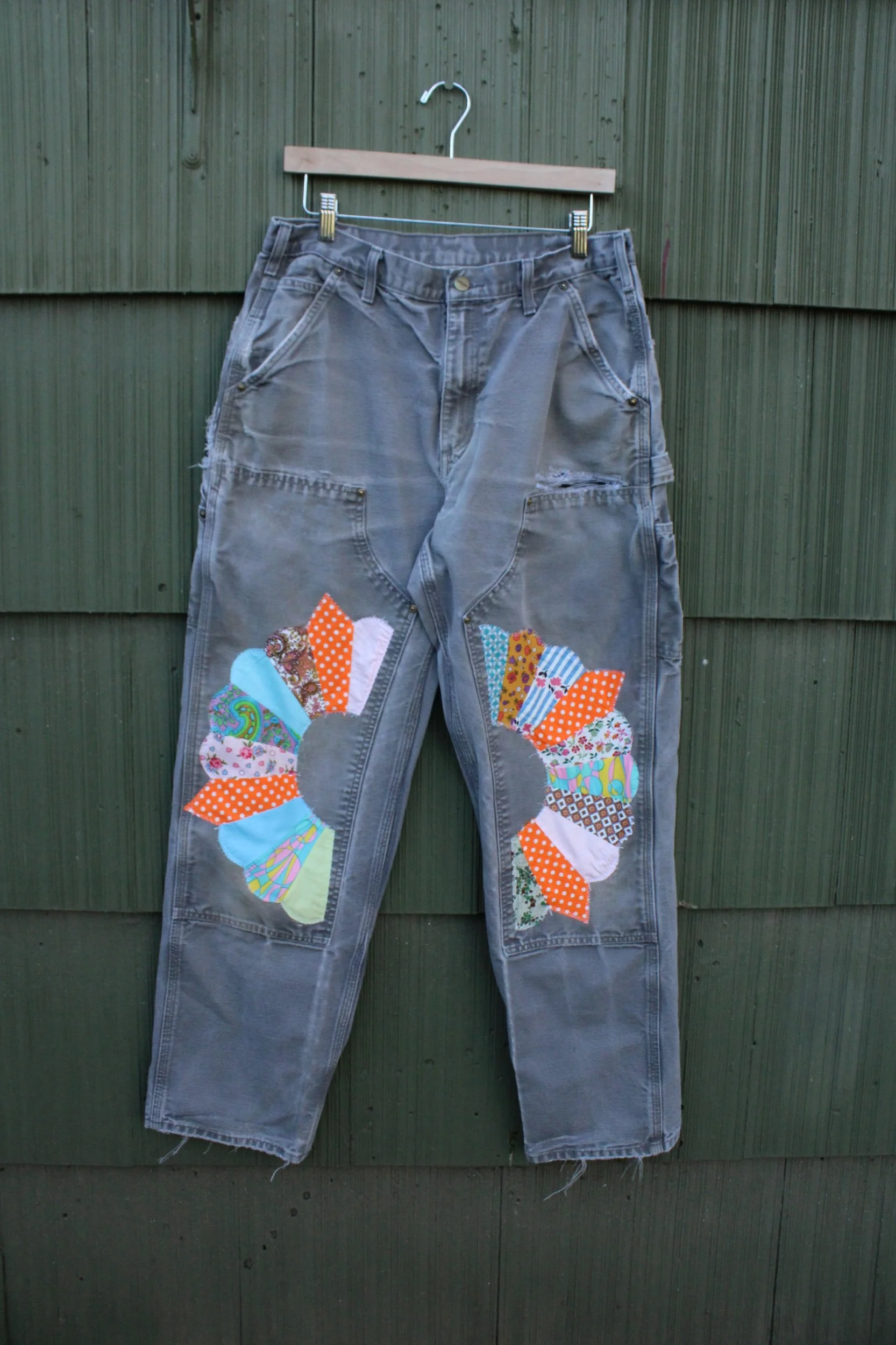 vintage double knee carhartts with added Dresden patches appliquéd knee patches — mending done through out!