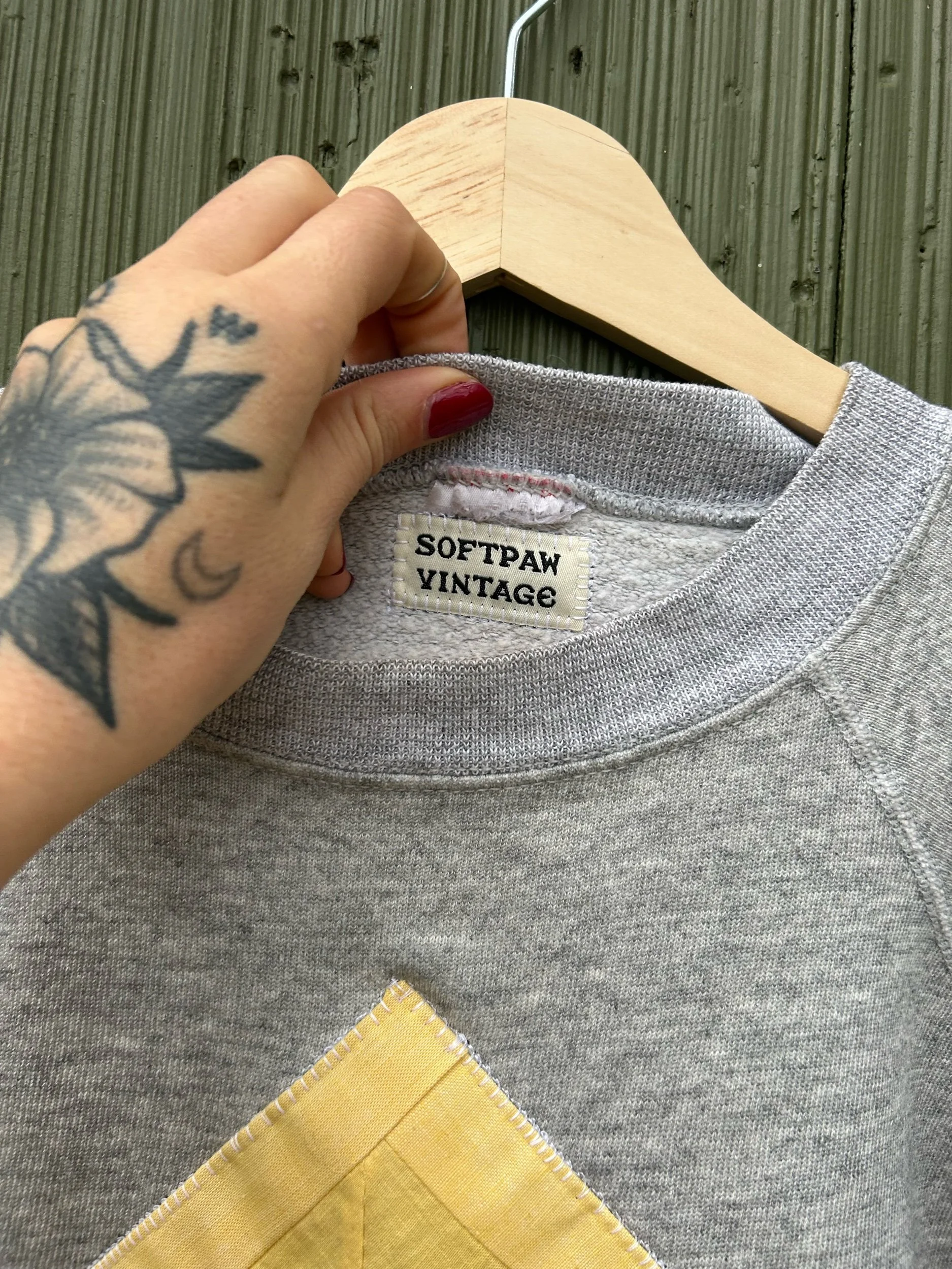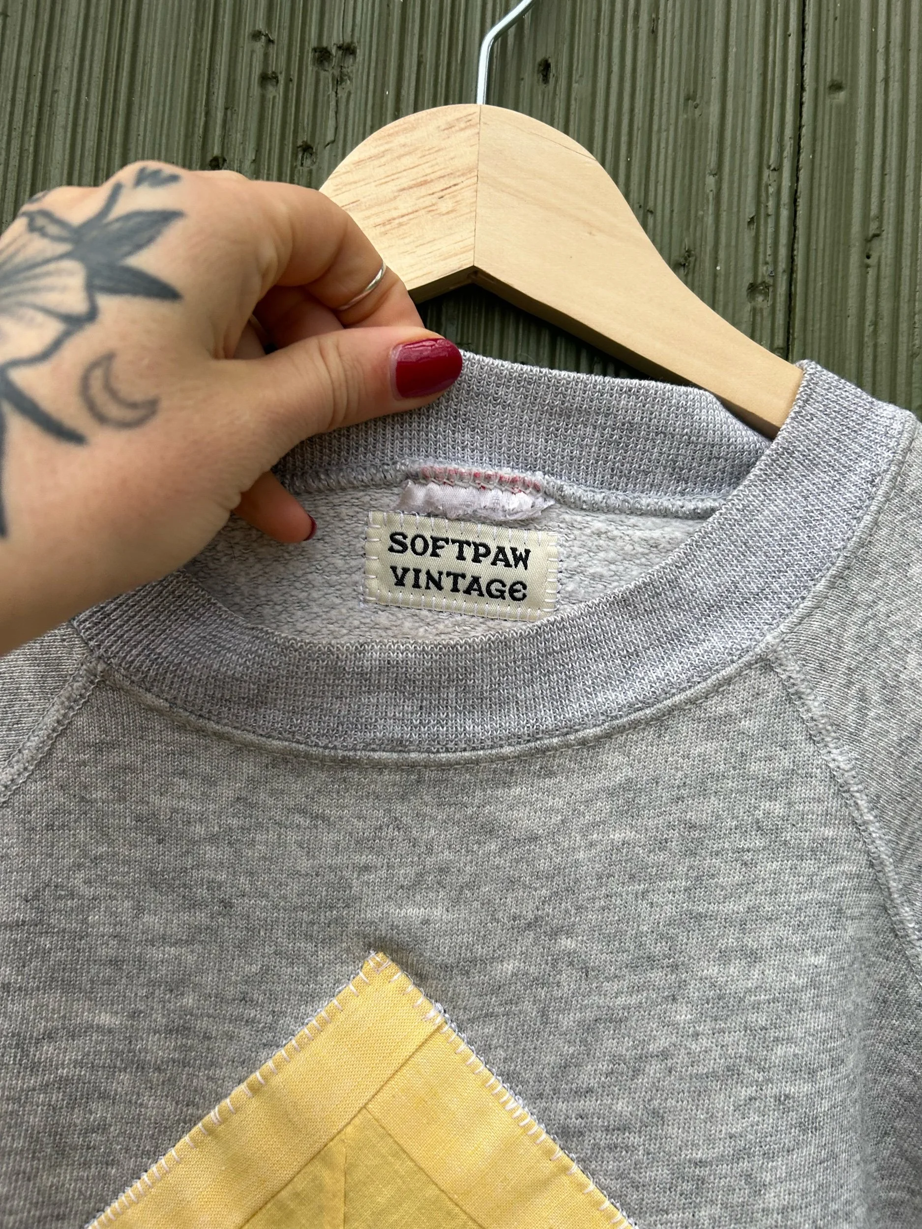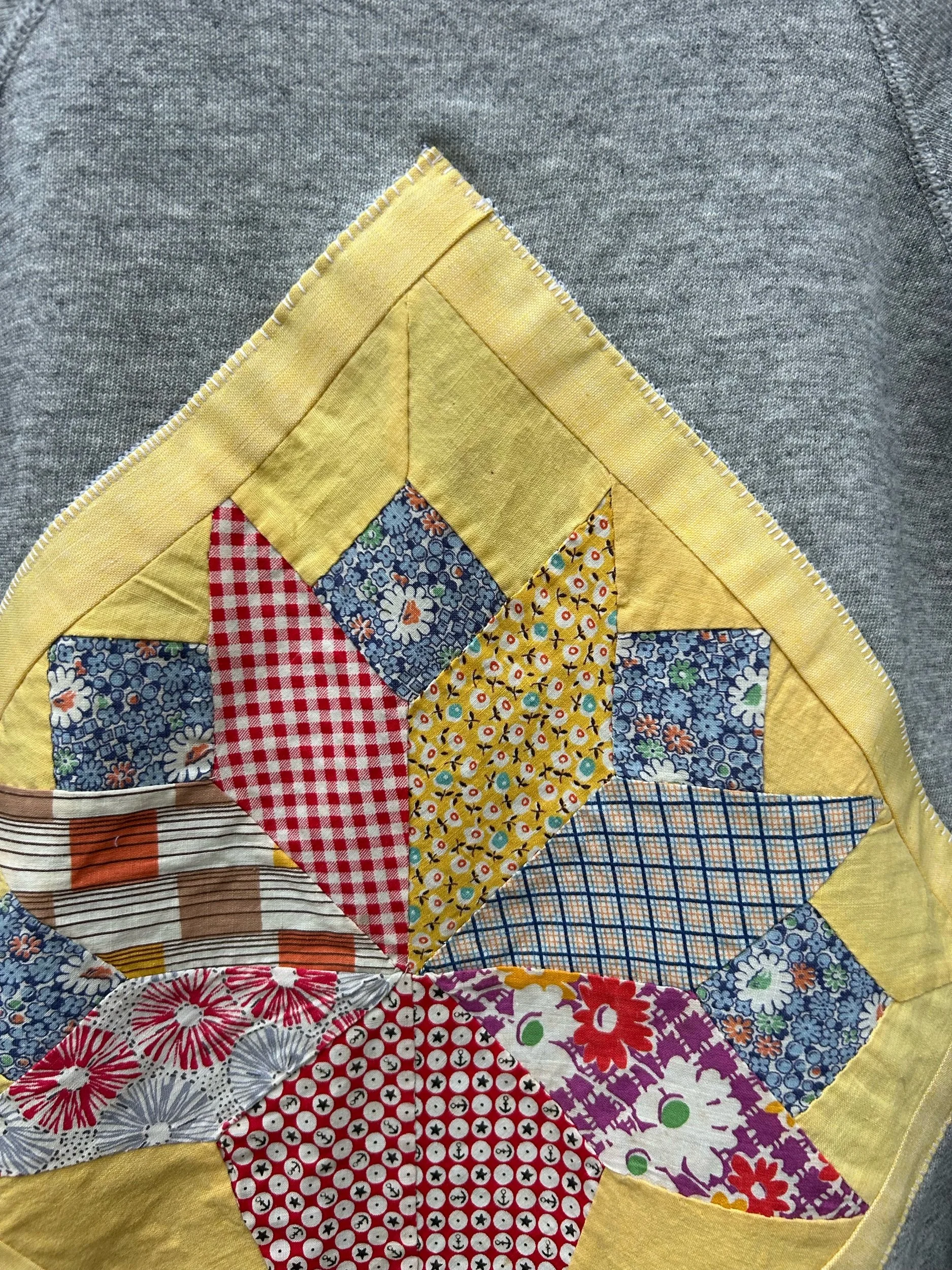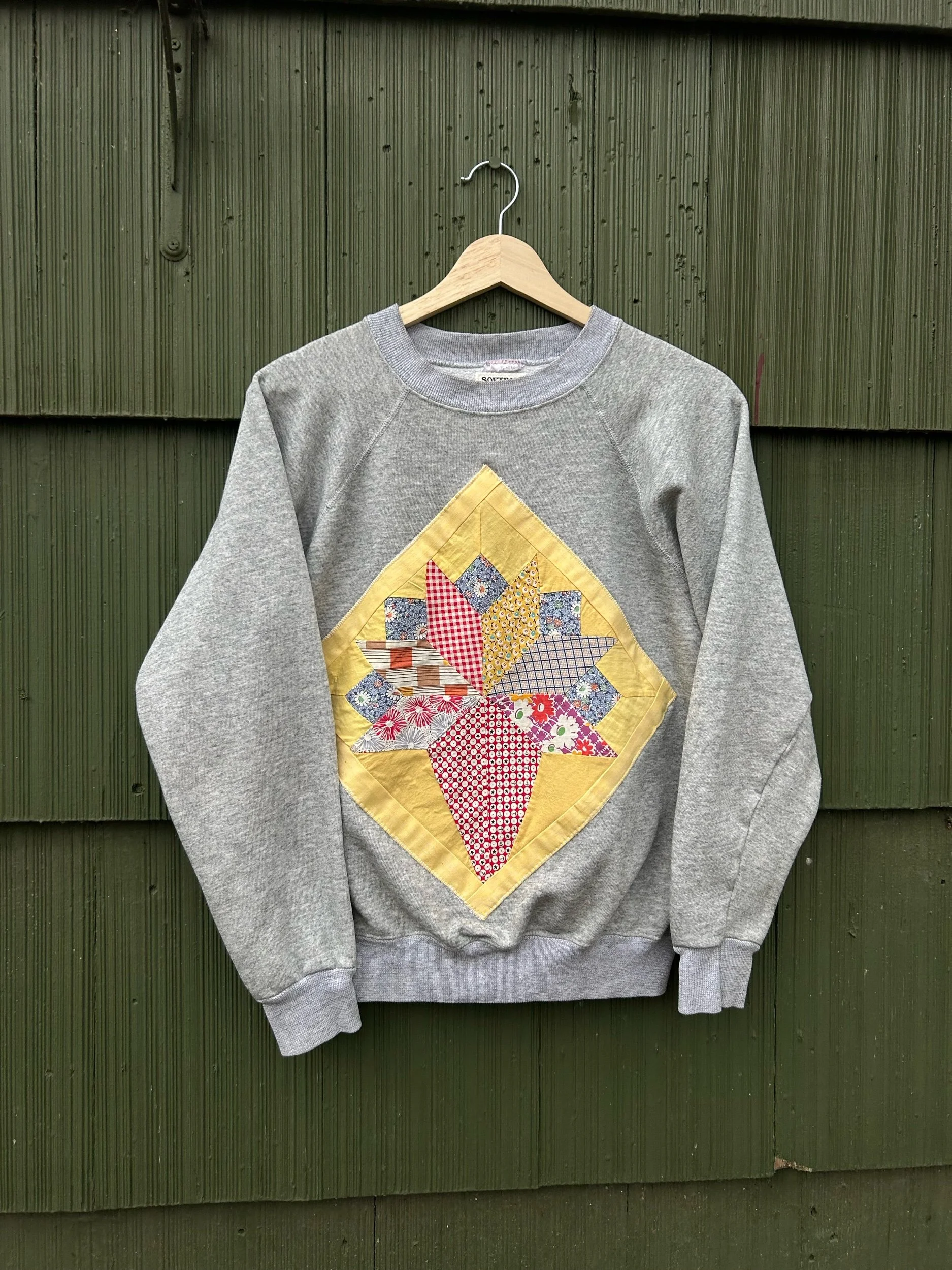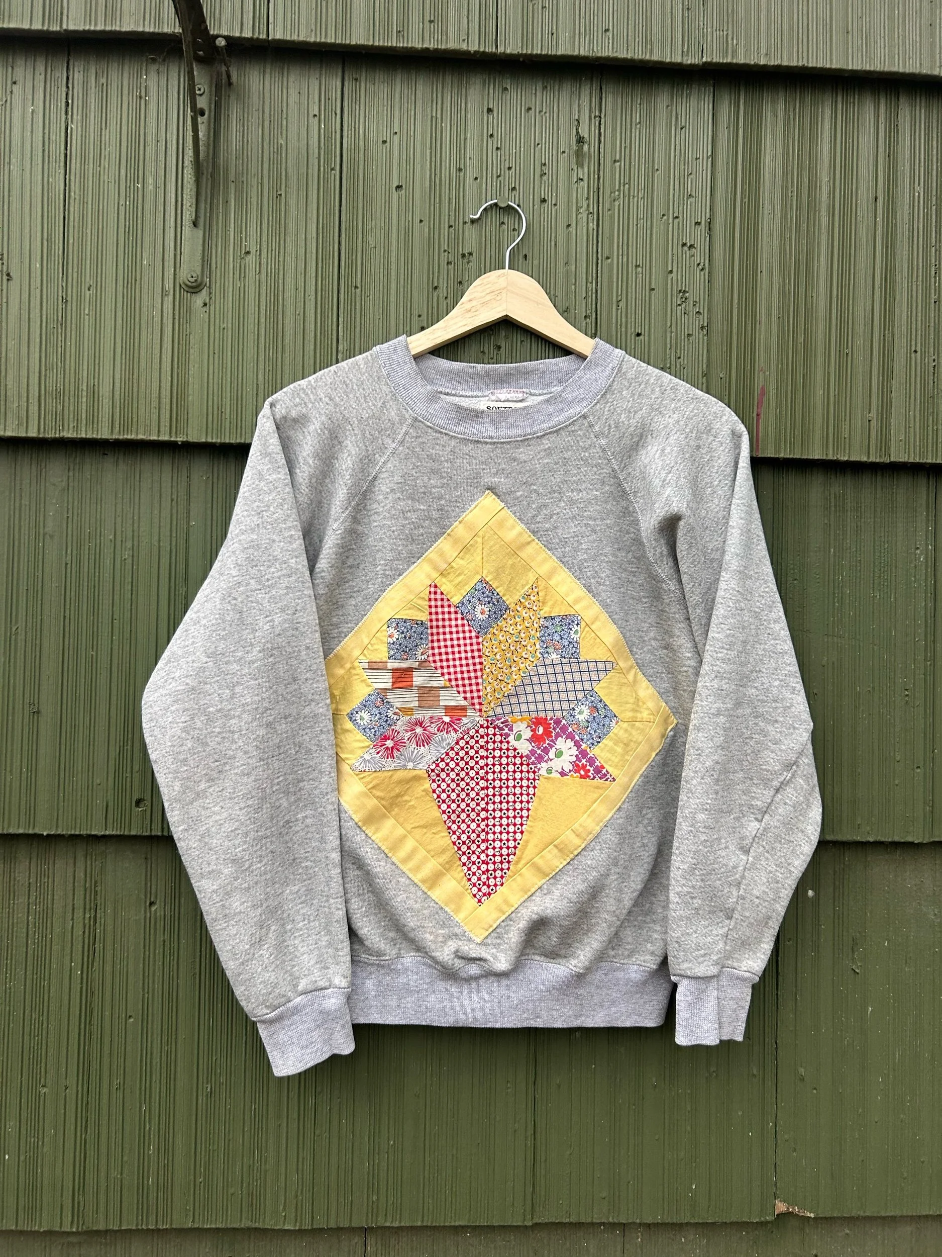 vintage heather grey raglan crewneck with added quilt patch using appliqué stitch no tag