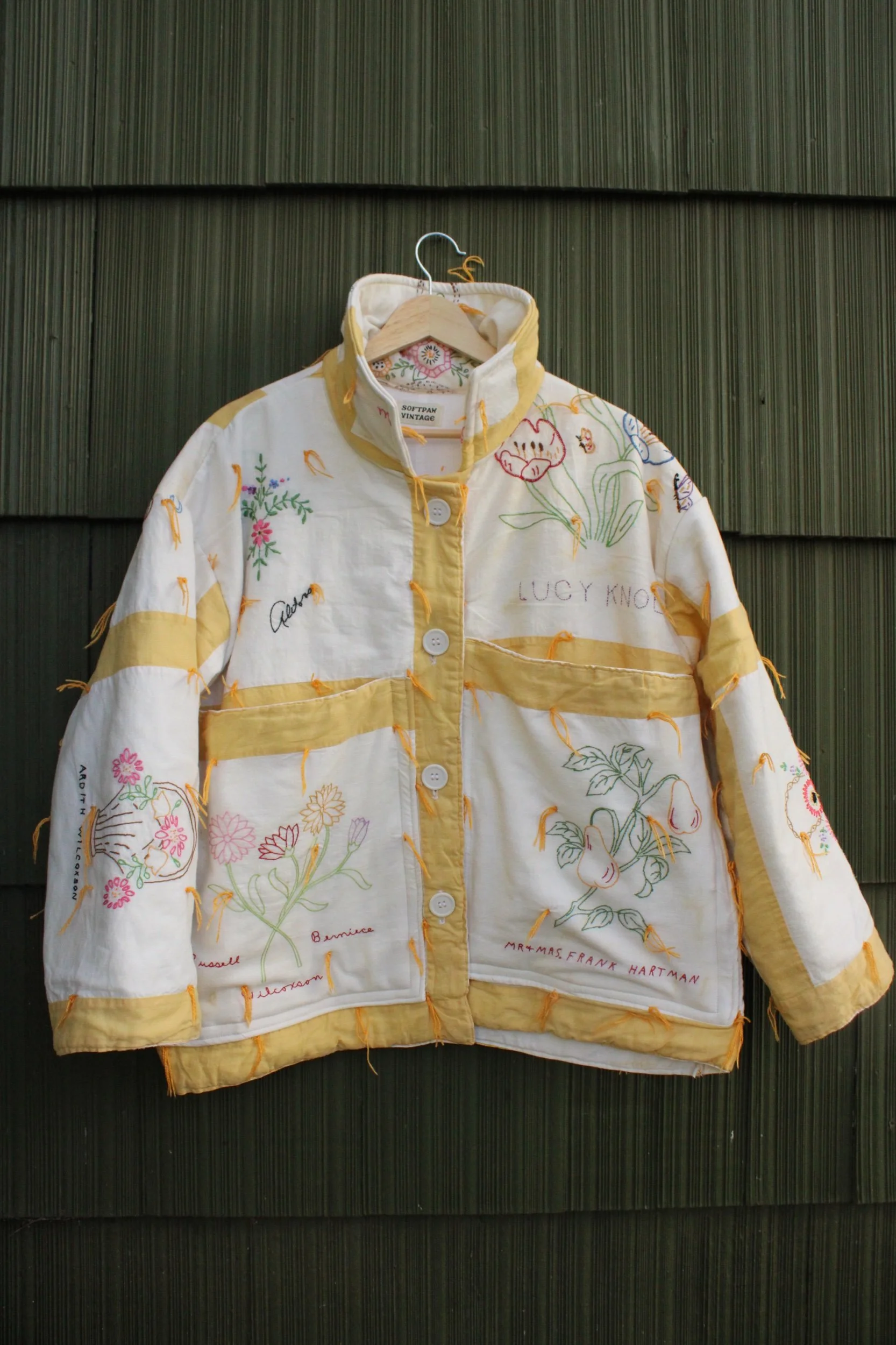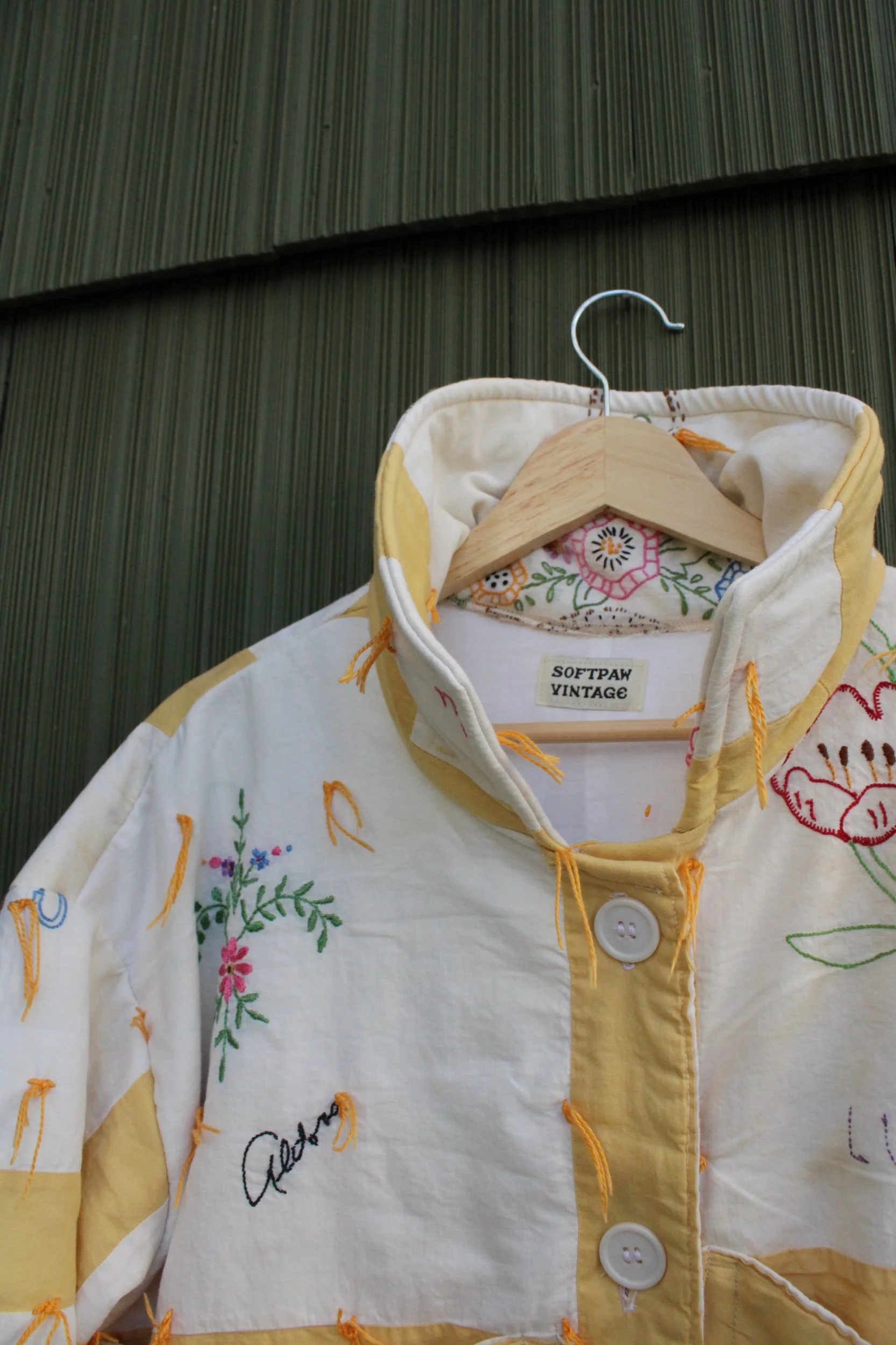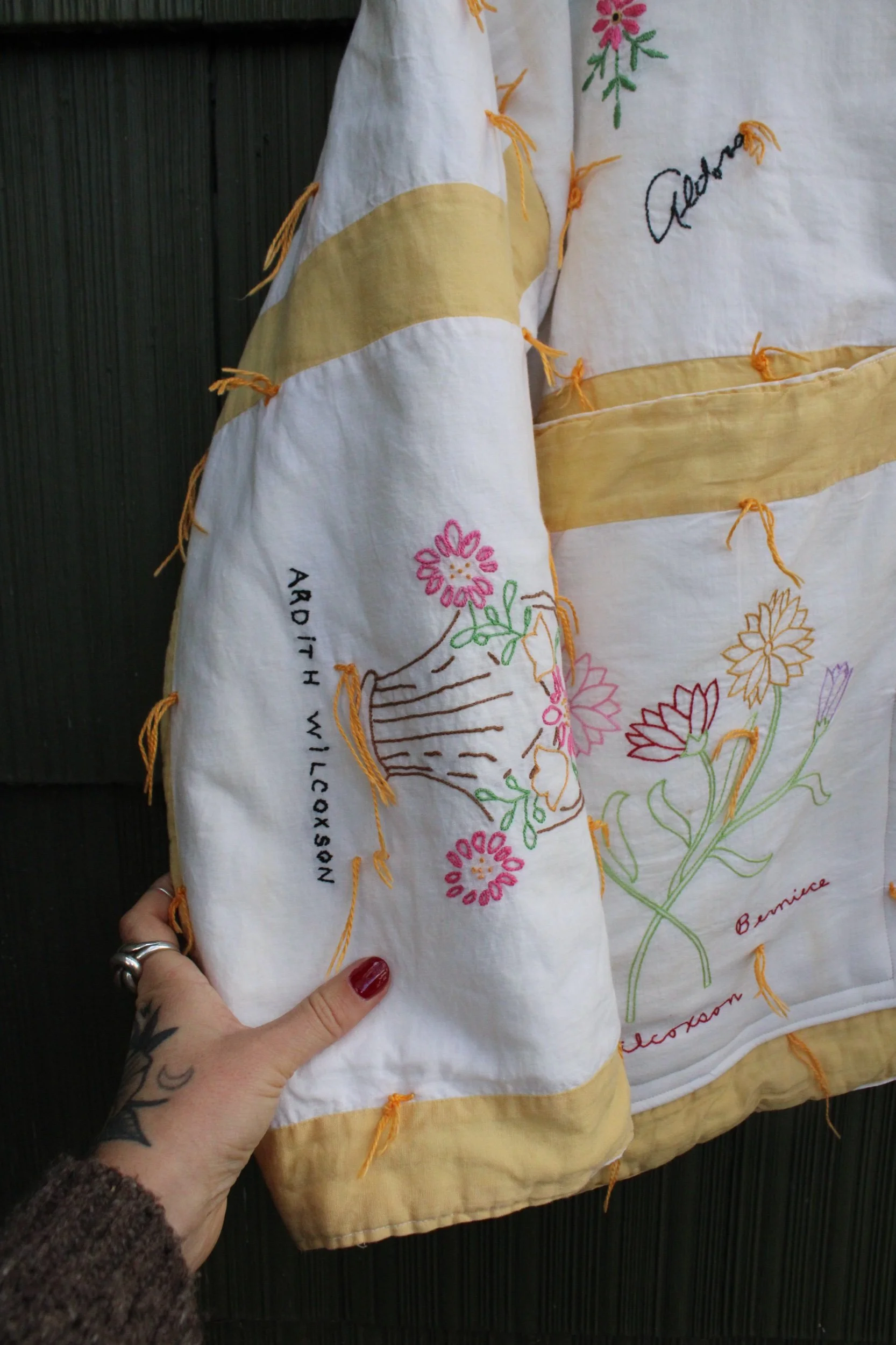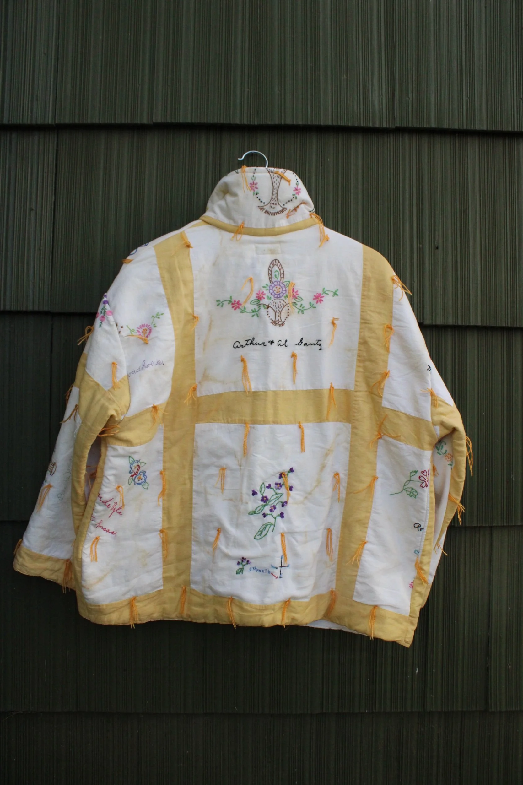 vintage embodied names quilt dating back to 1932, turned chore coat