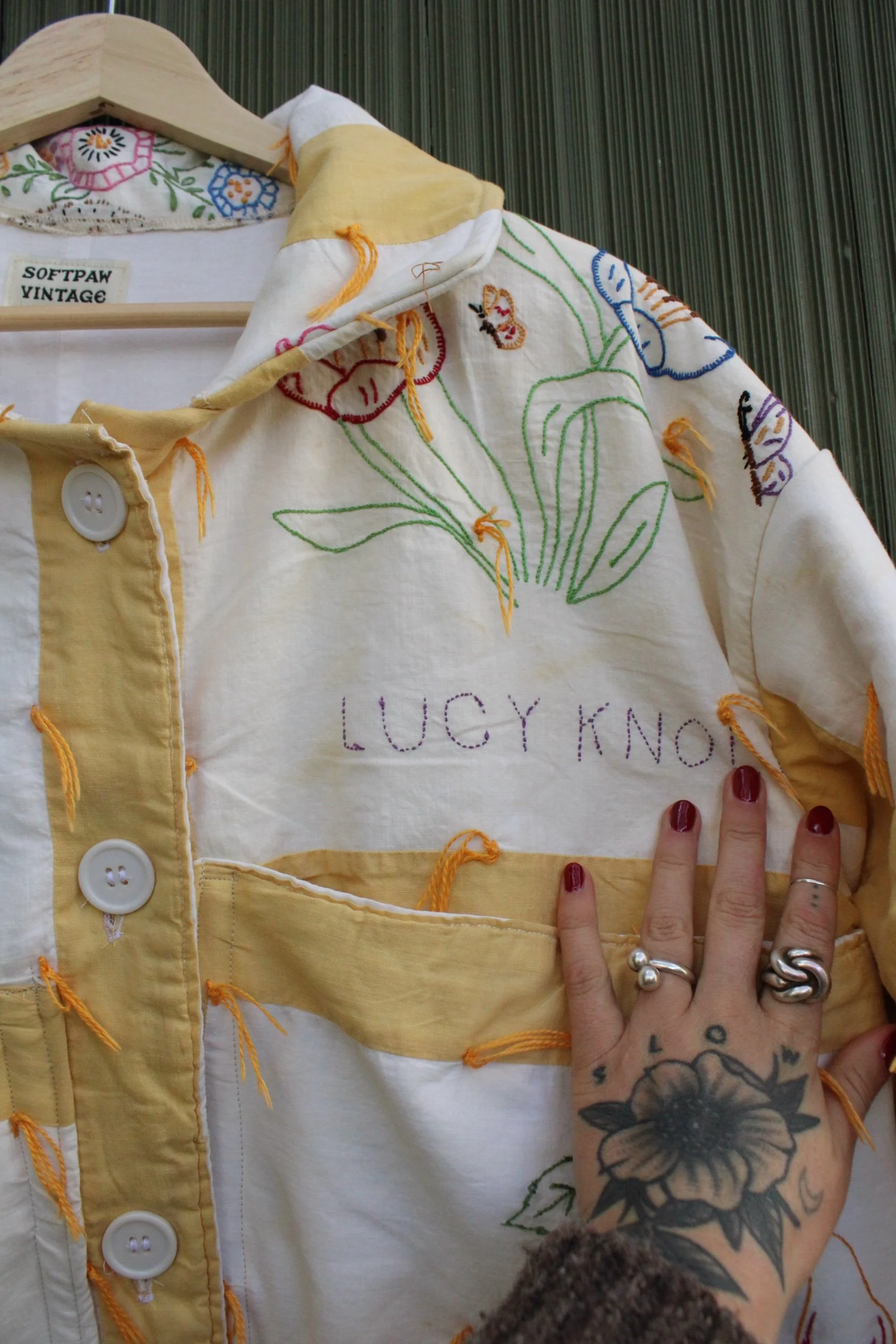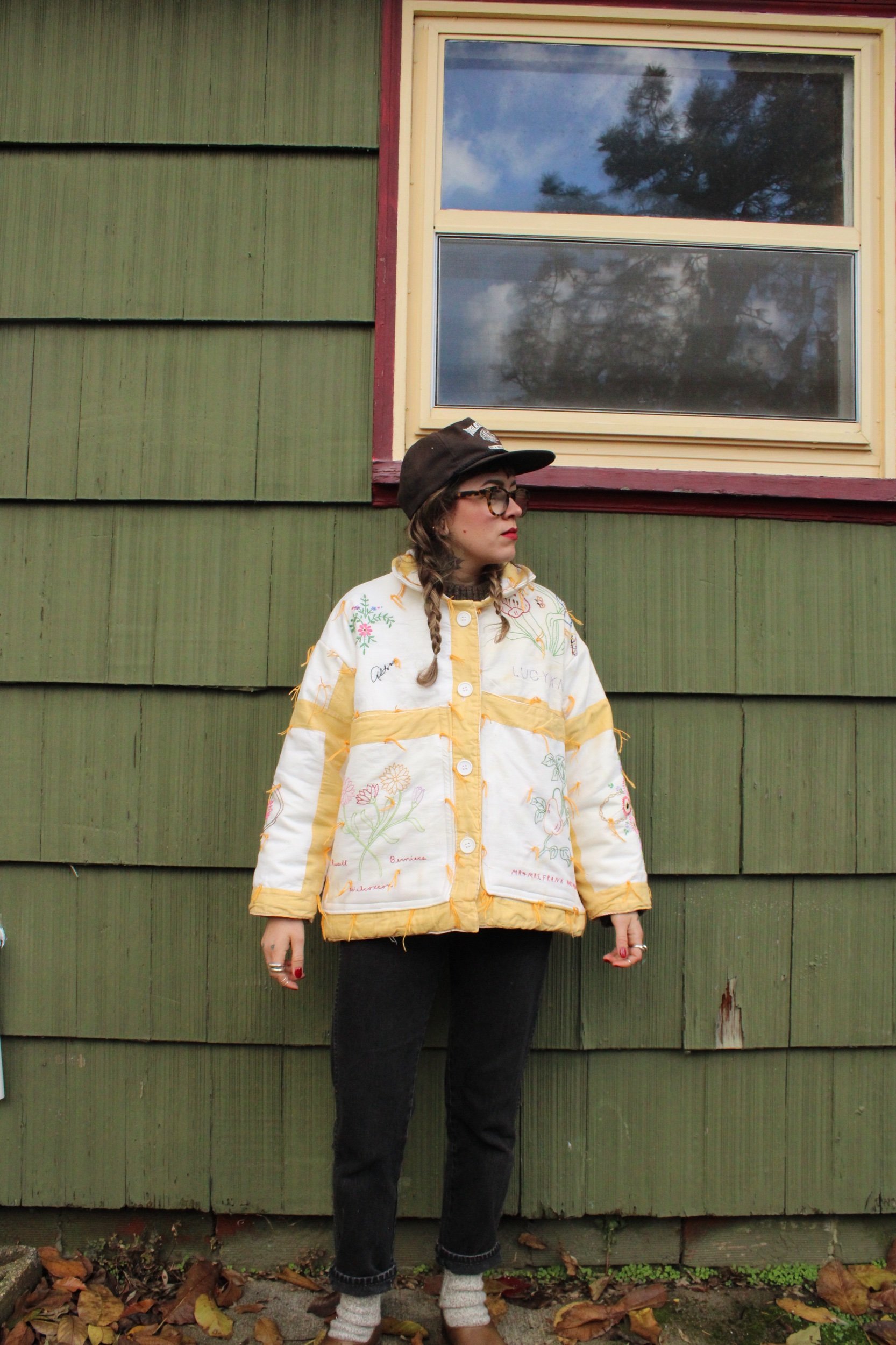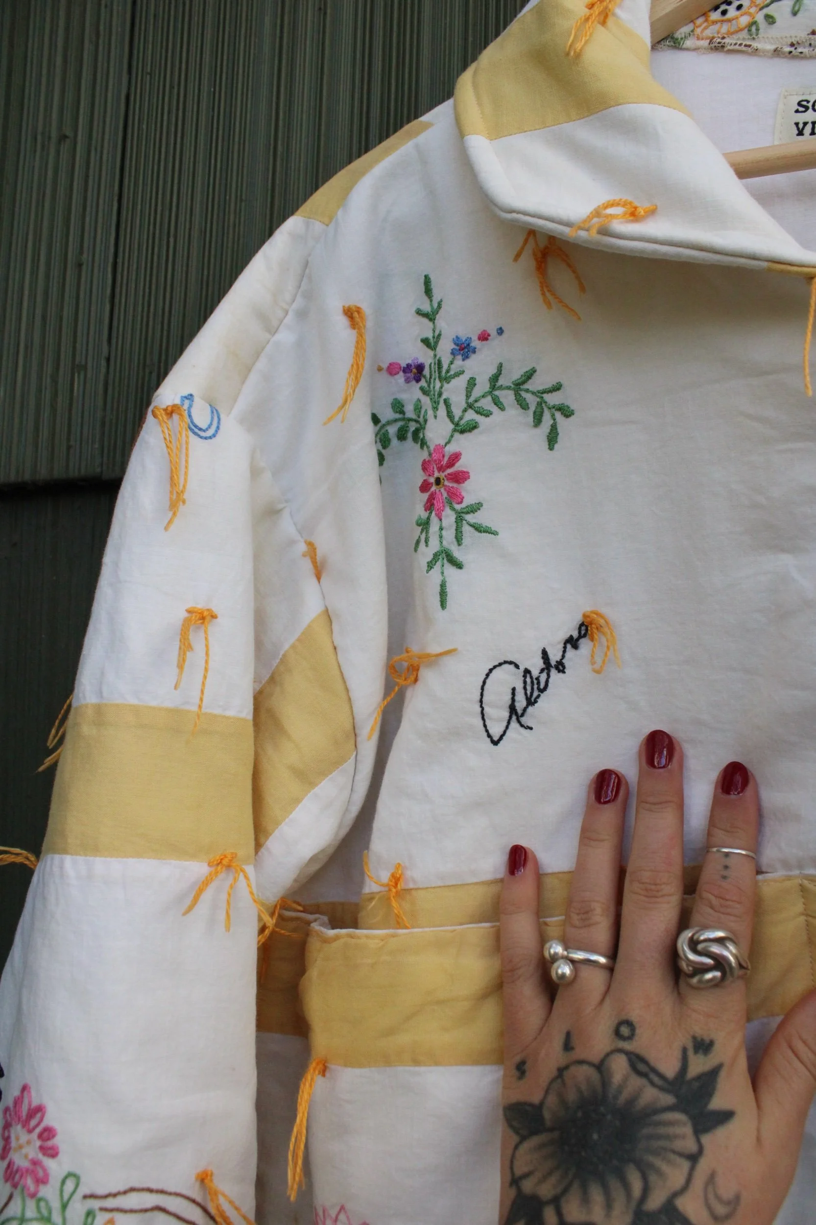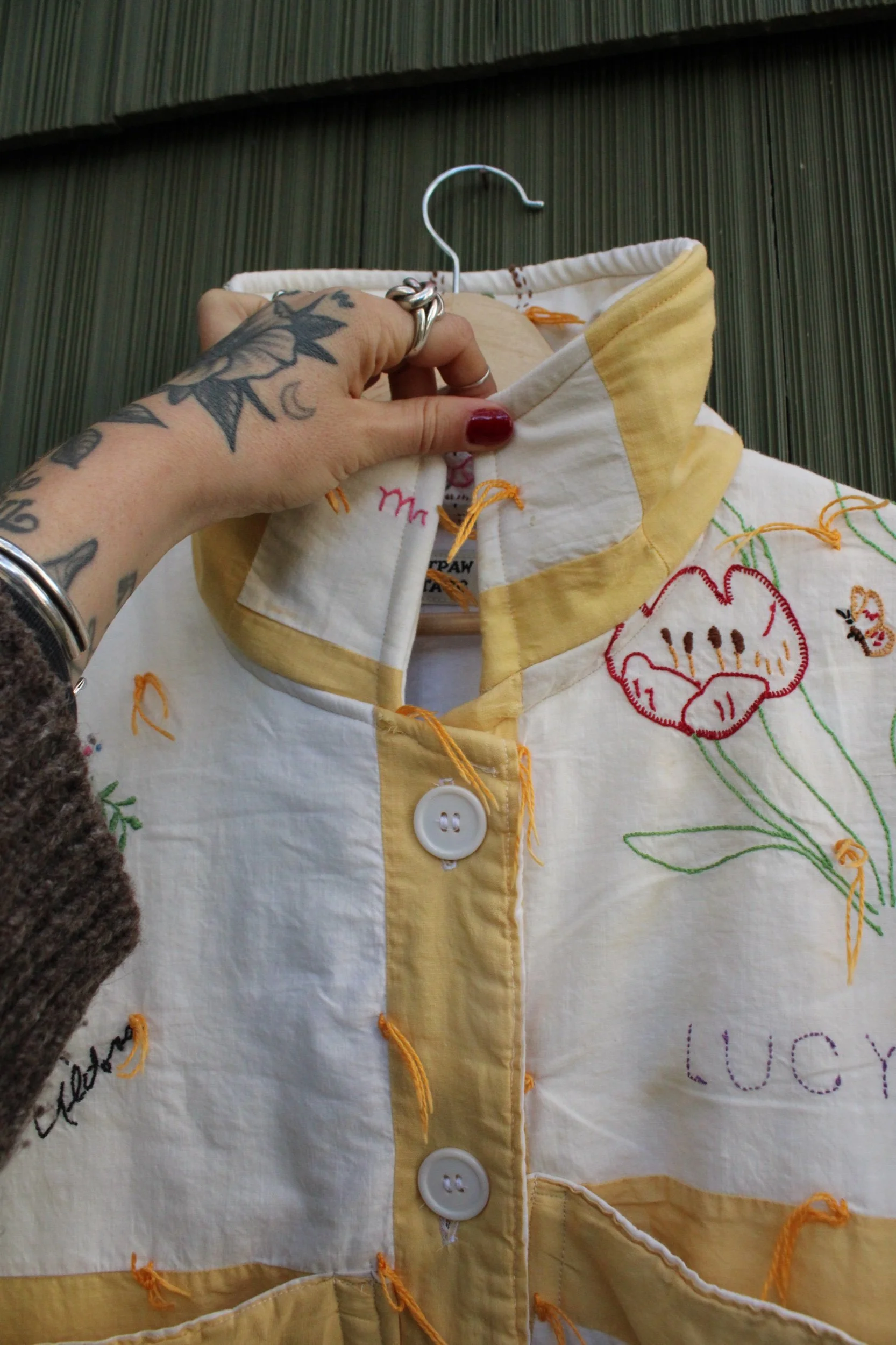vintage embodied names quilt dating back to 1932, turned chore coat