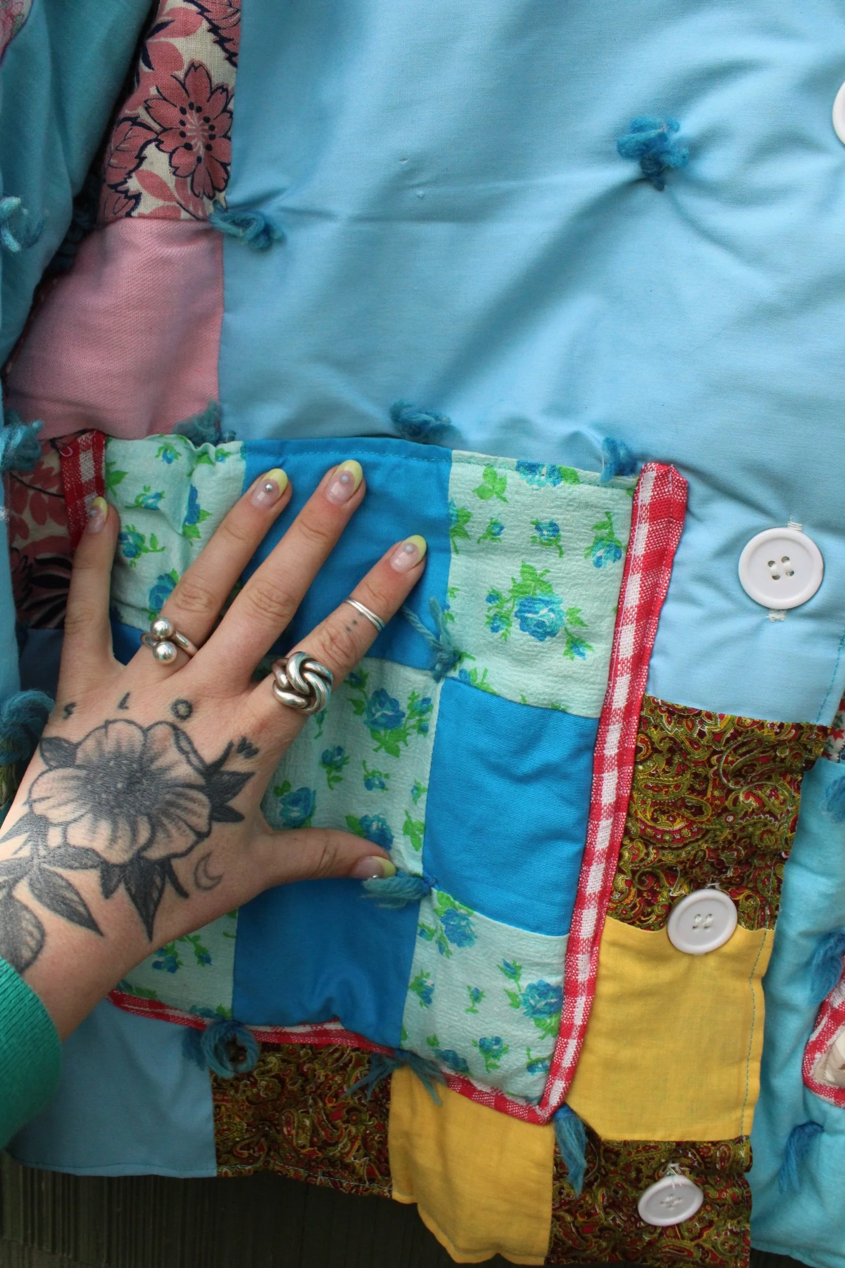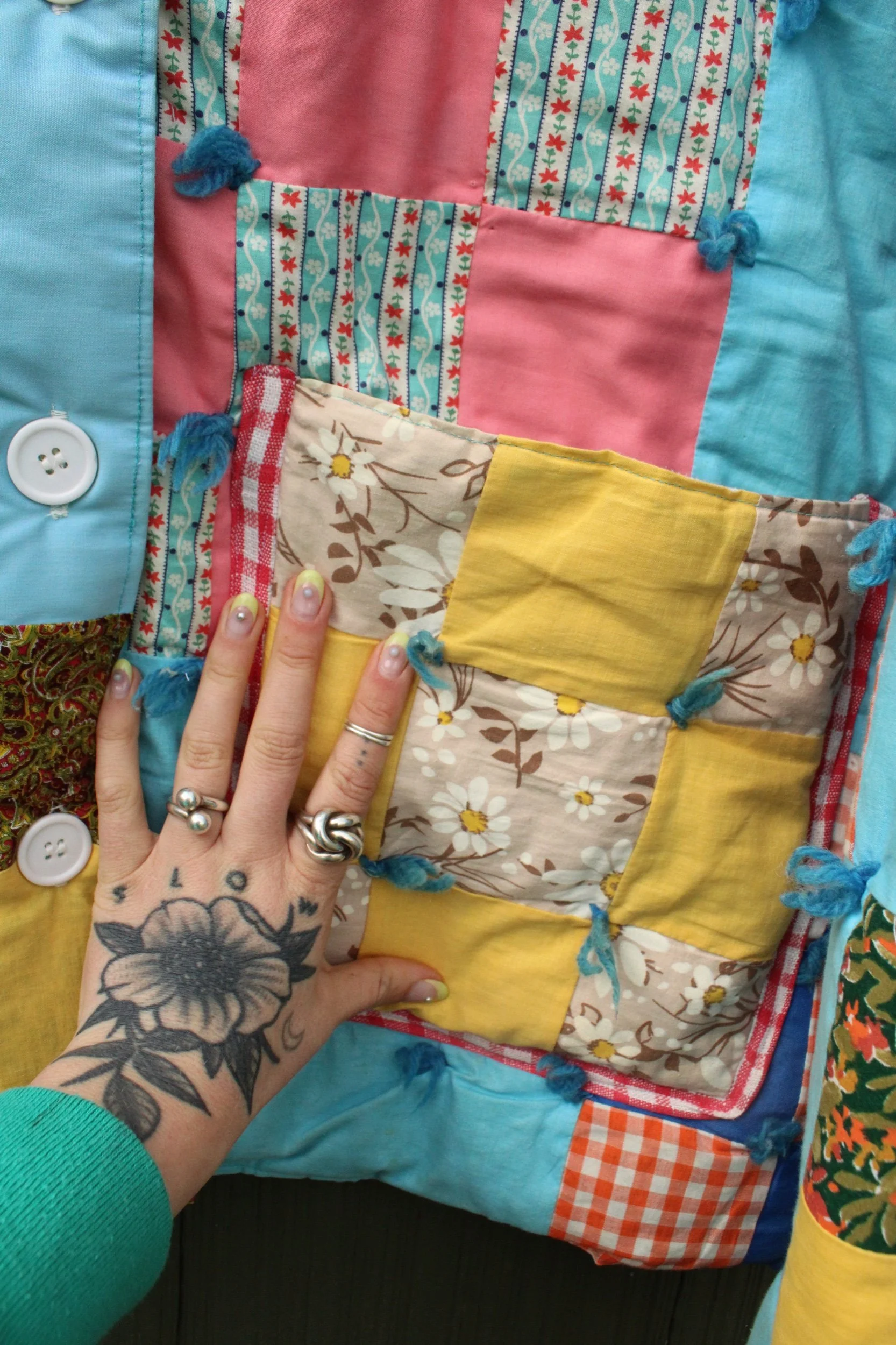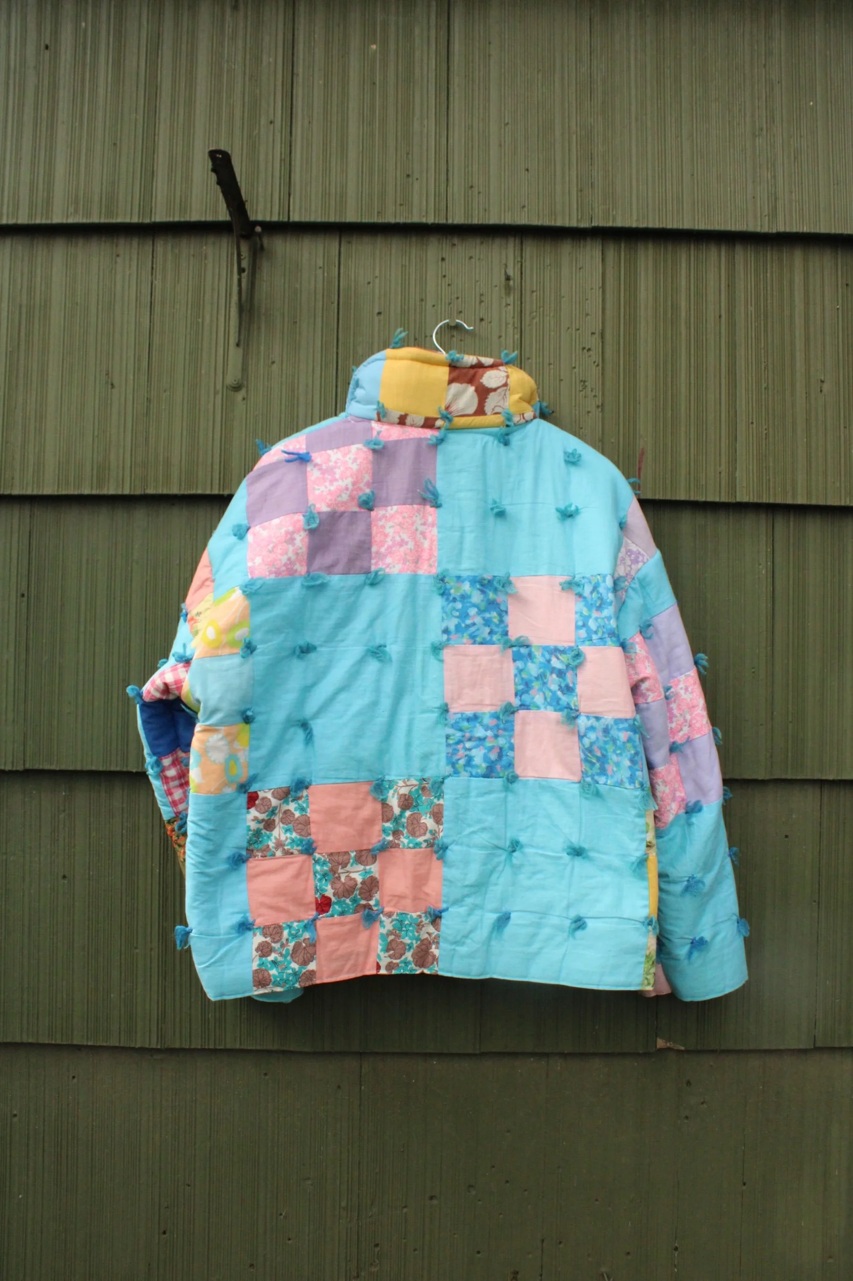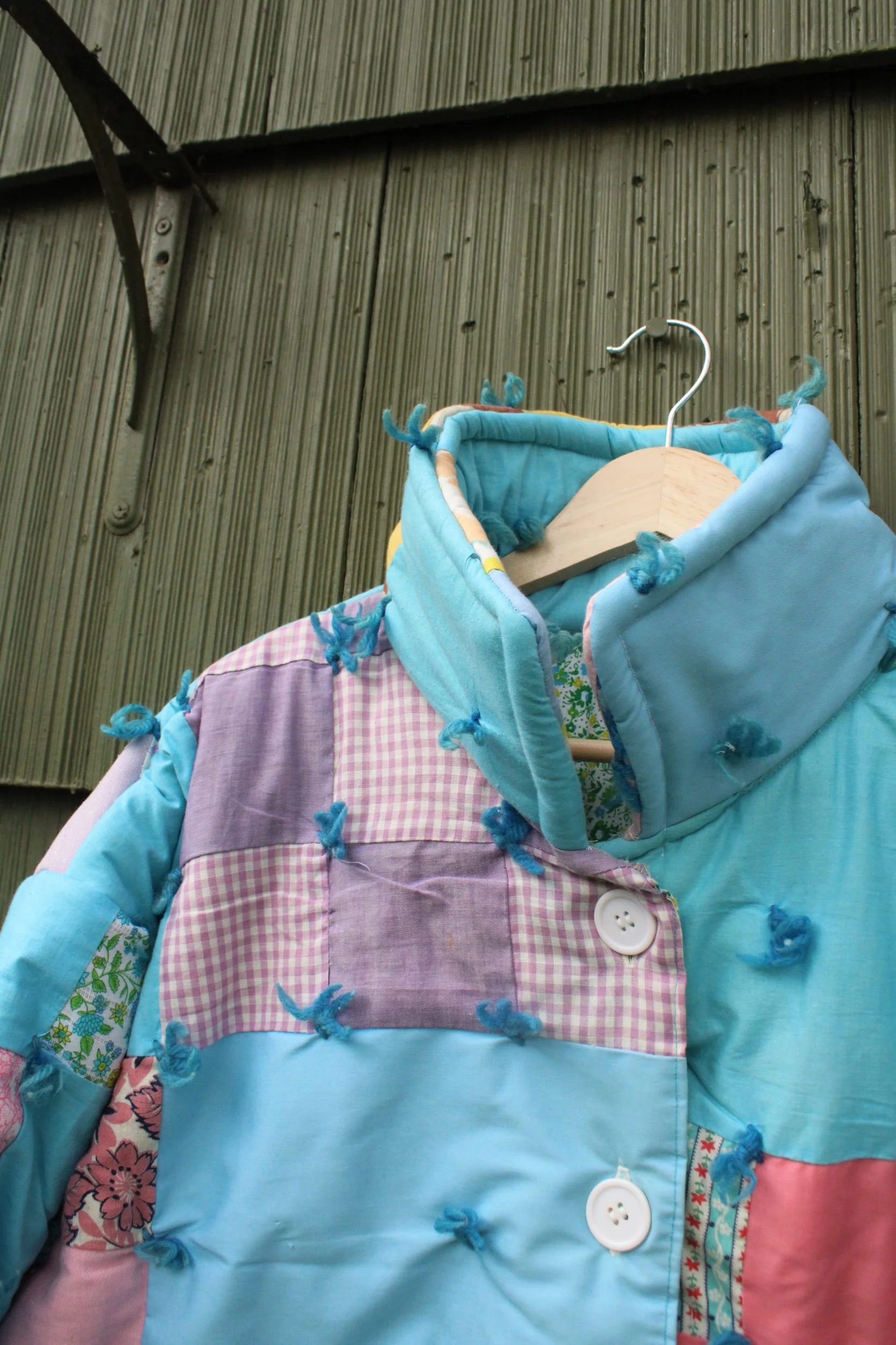 vintage puffy 9 patch quilt turned chore coat with two oversized pockets banded with a vintage table cloth