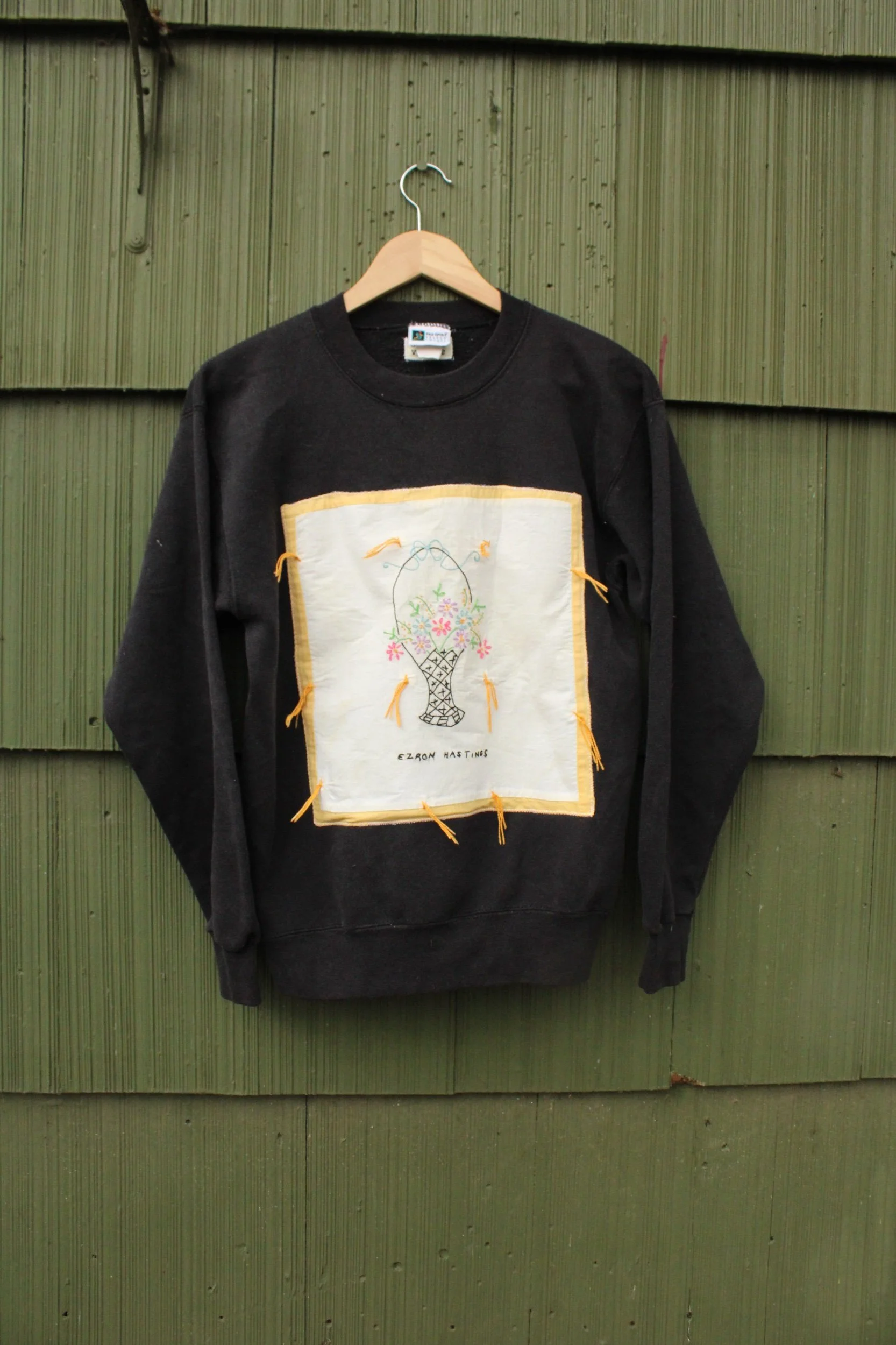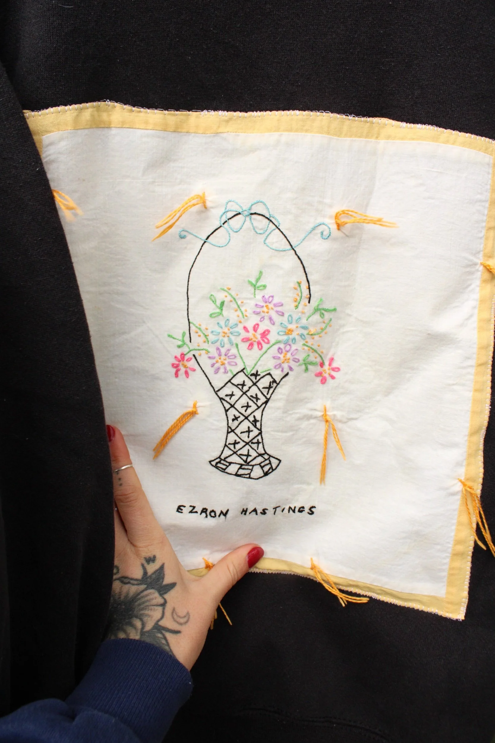 vintage black crewneck with added embroidered name patch from a quilt dated back to 1932