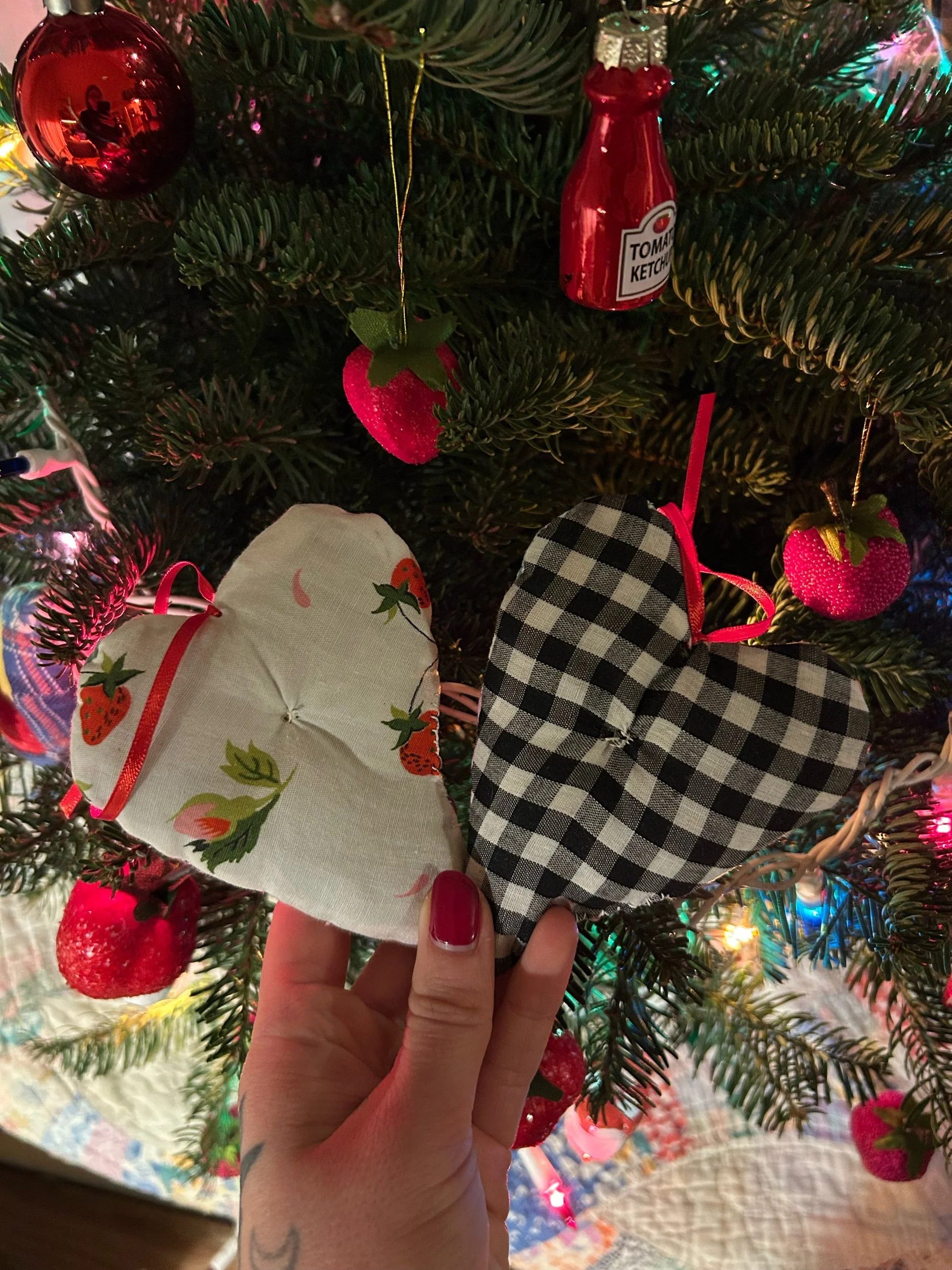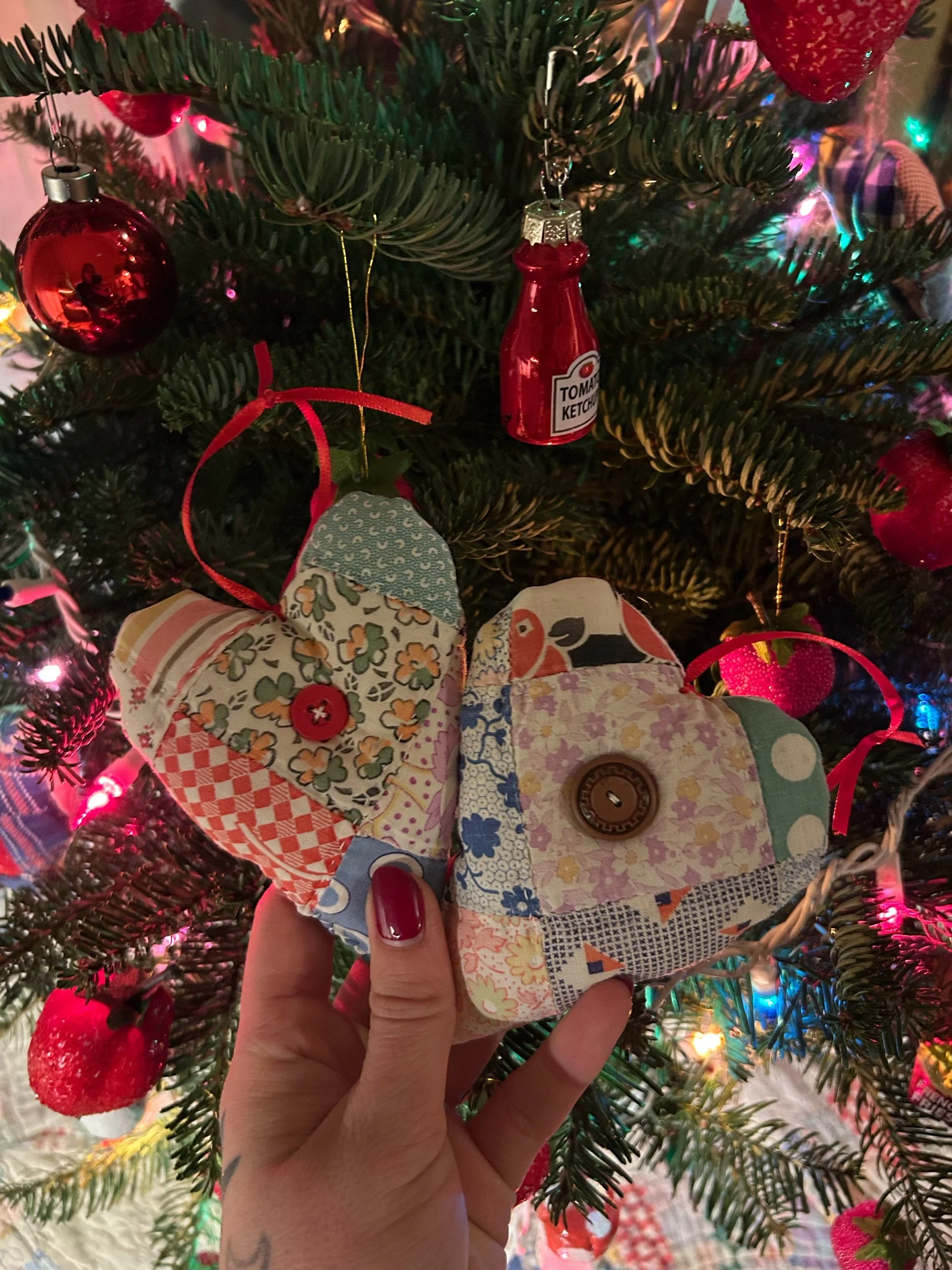 quilt scrap turned homemade Christmas tree ornaments with vintage buttons, hand sewn