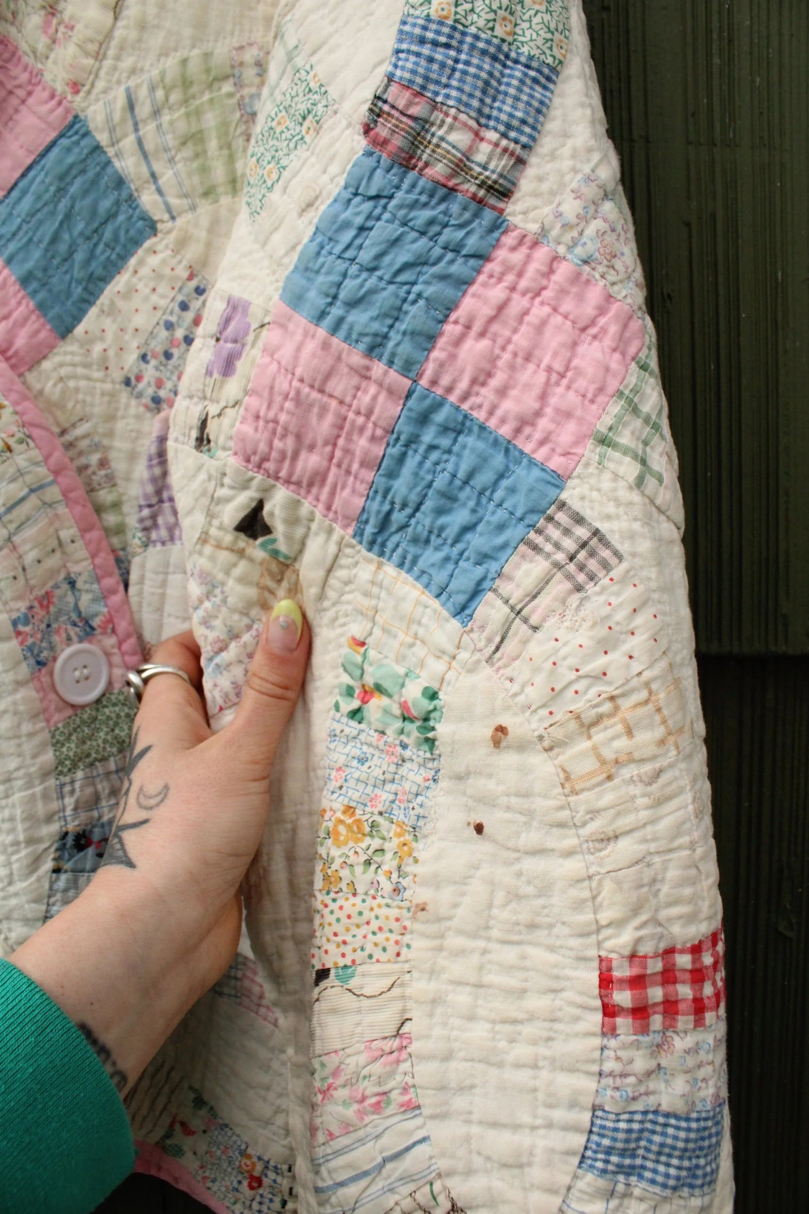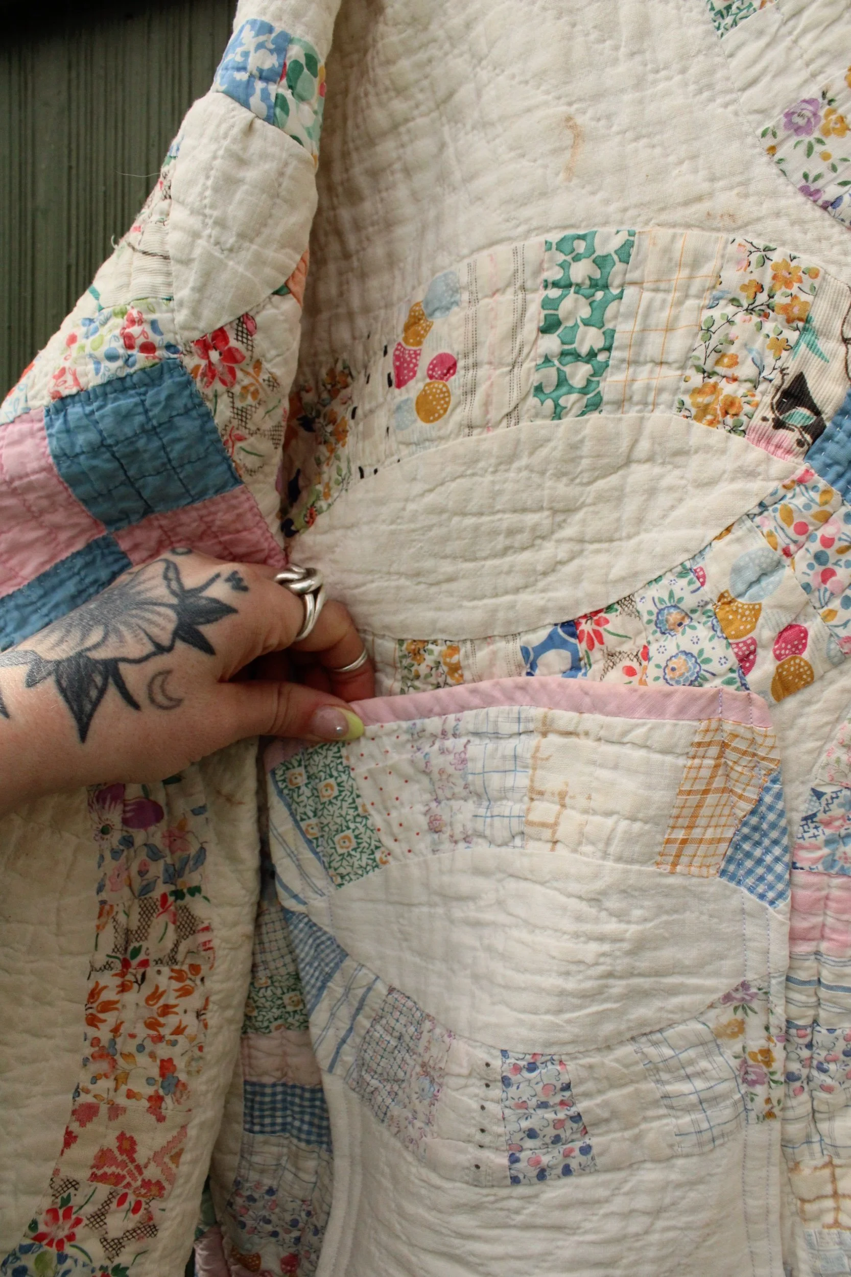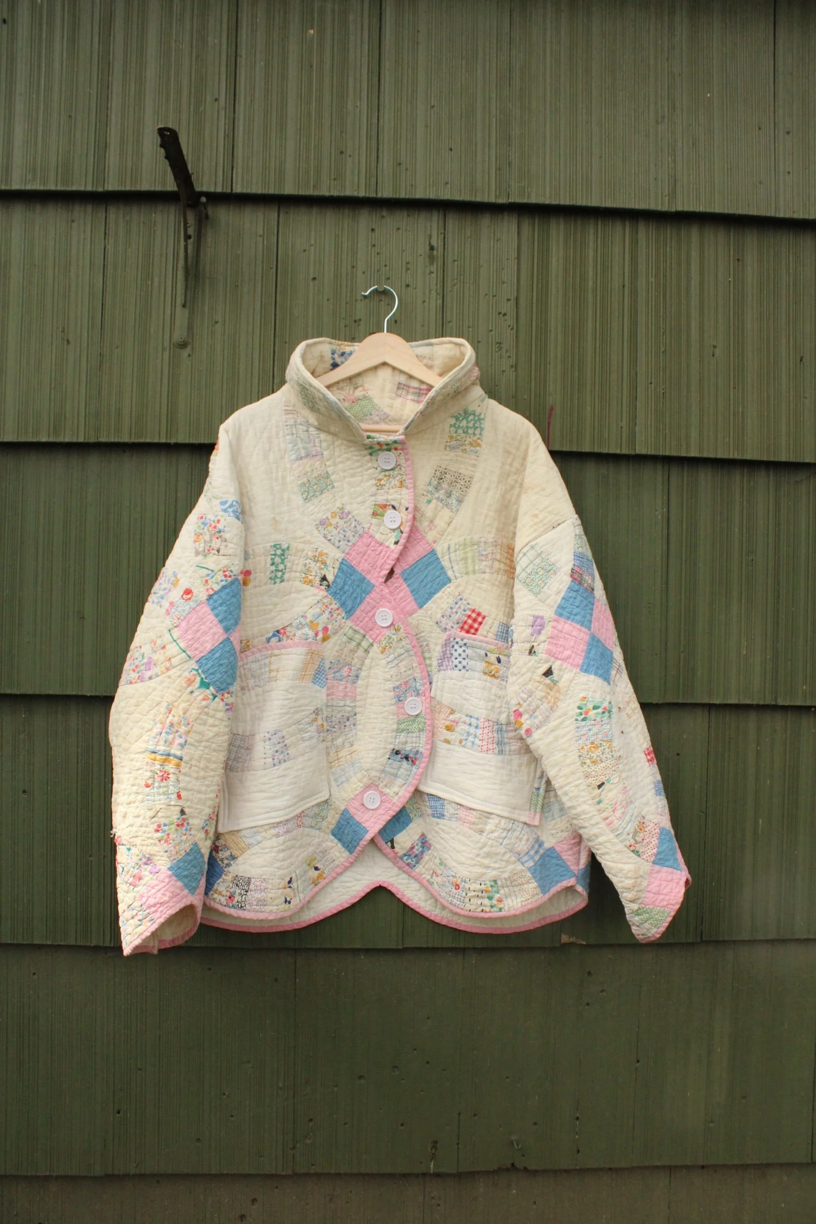 double wedding ring quilt coat with two front pockets and mending through out
