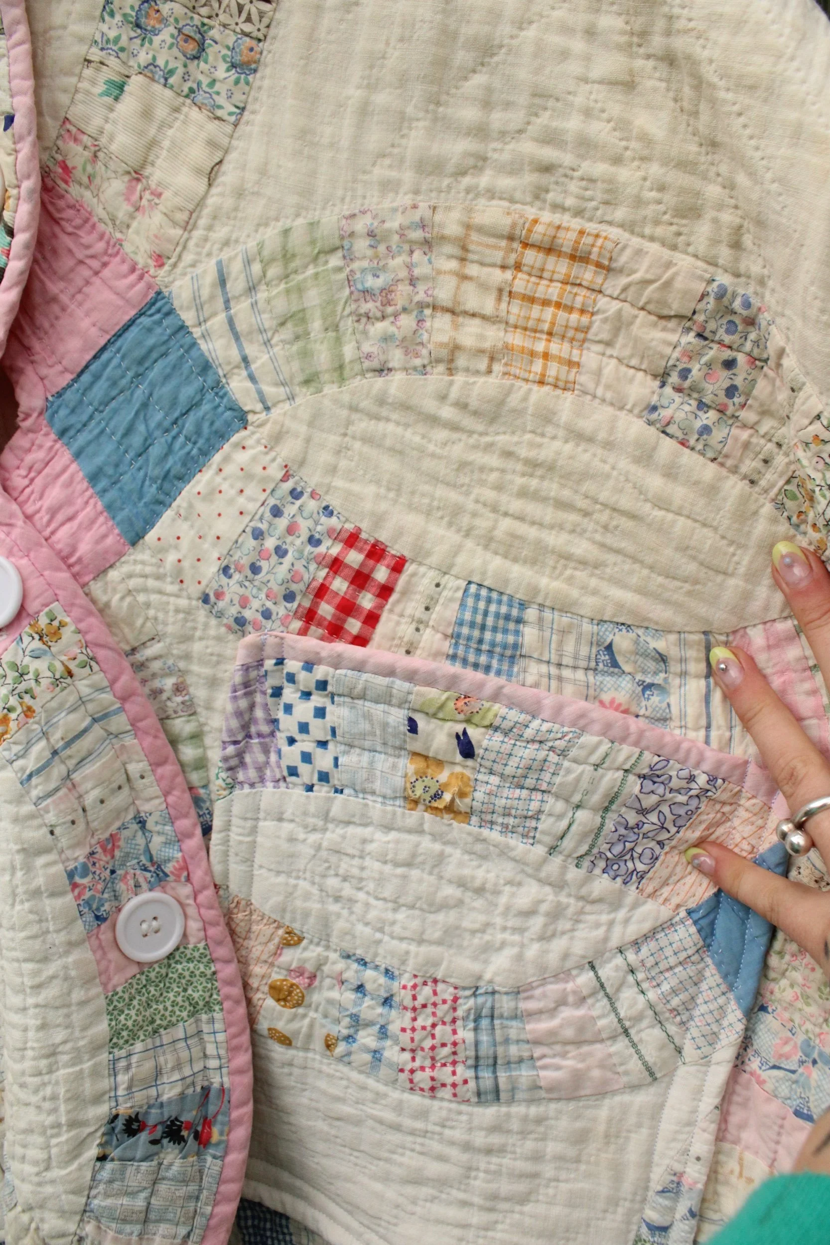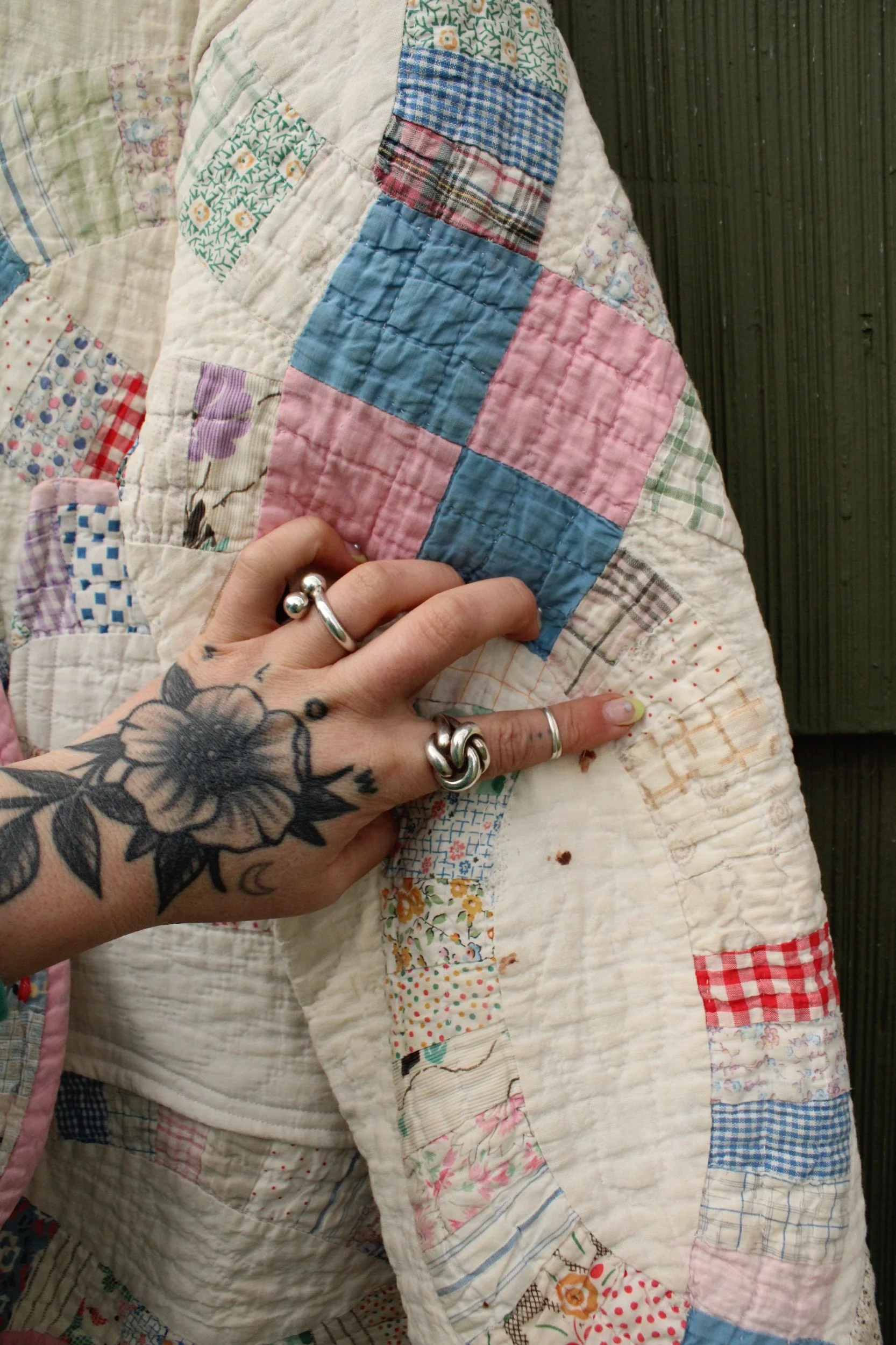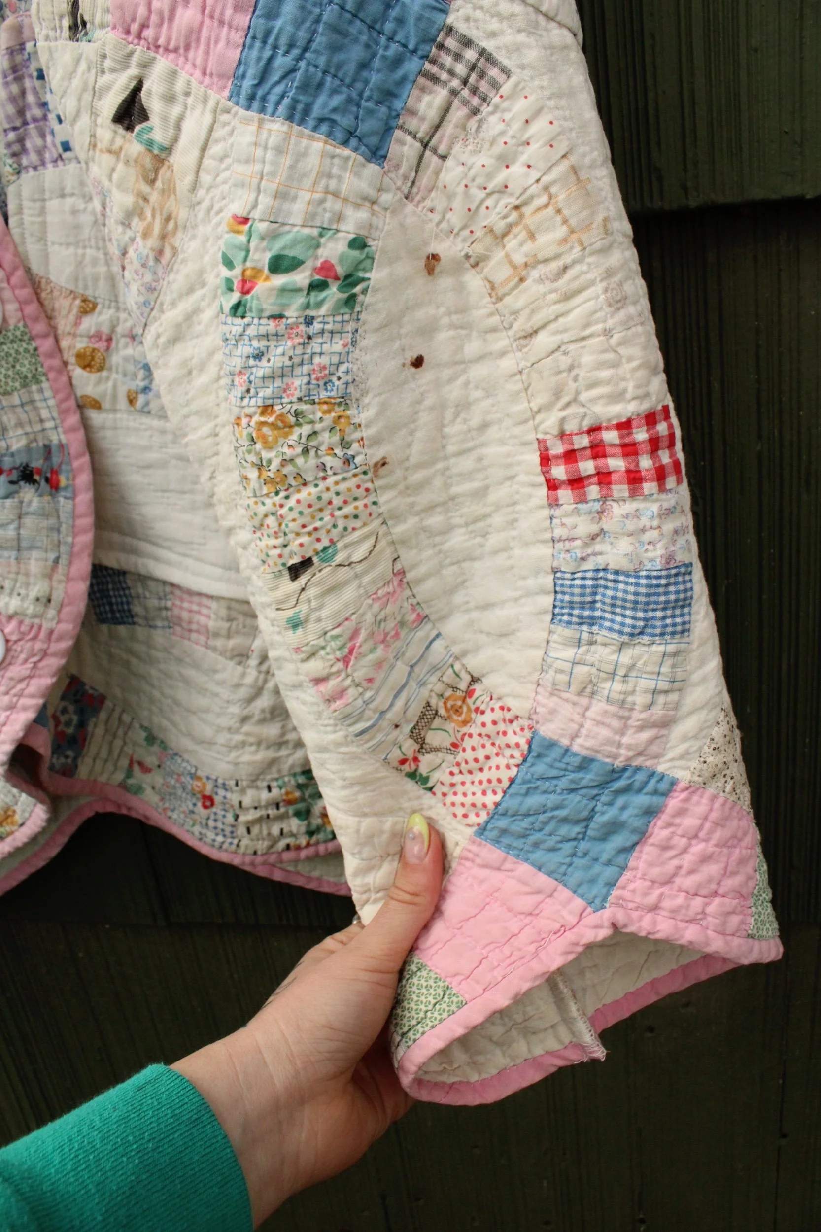double wedding ring quilt coat with two front pockets and mending through out