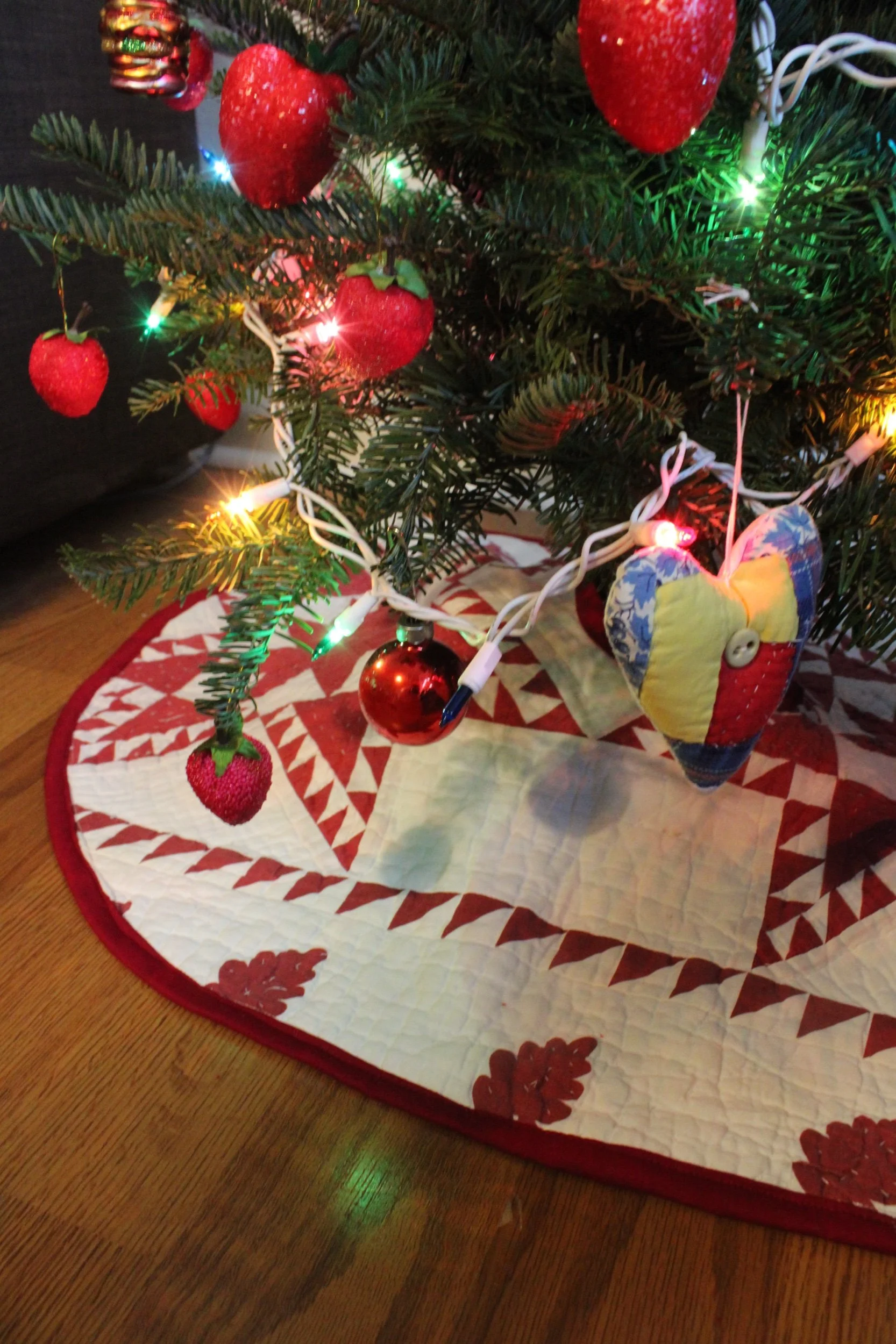 Quilt tree skirt in an oval shape meant for a smaller tree - Each piece is fully bound with handmade bias binding and finished with solid brass snaps for easy on-and-off. no bending, tying, or wrestling with your tree stand. The curved edge is carefully sewn and hand-finished, giving the skirt a clean, durable, heirloom-quality finish you’ll enjoy for many years to come
