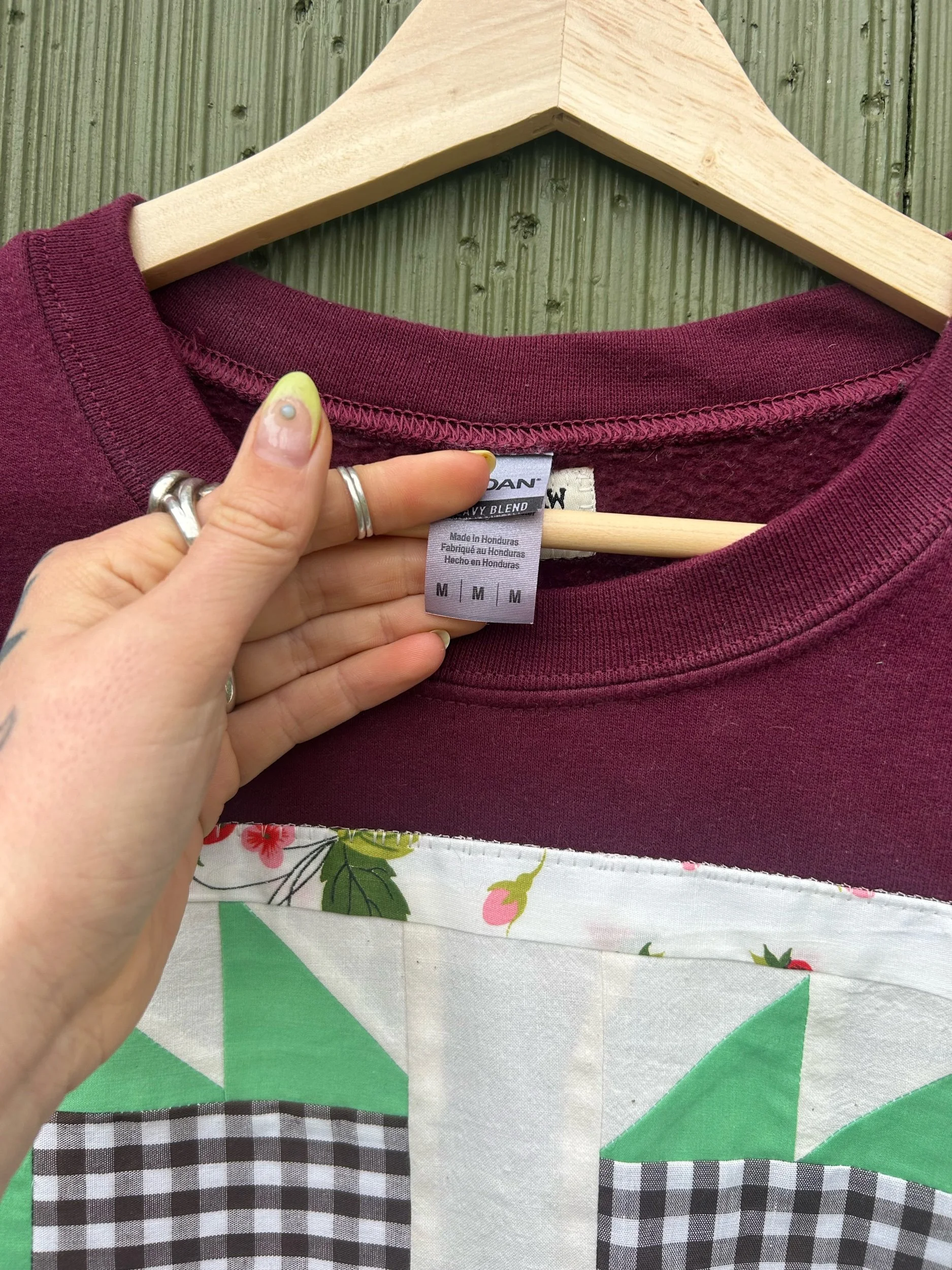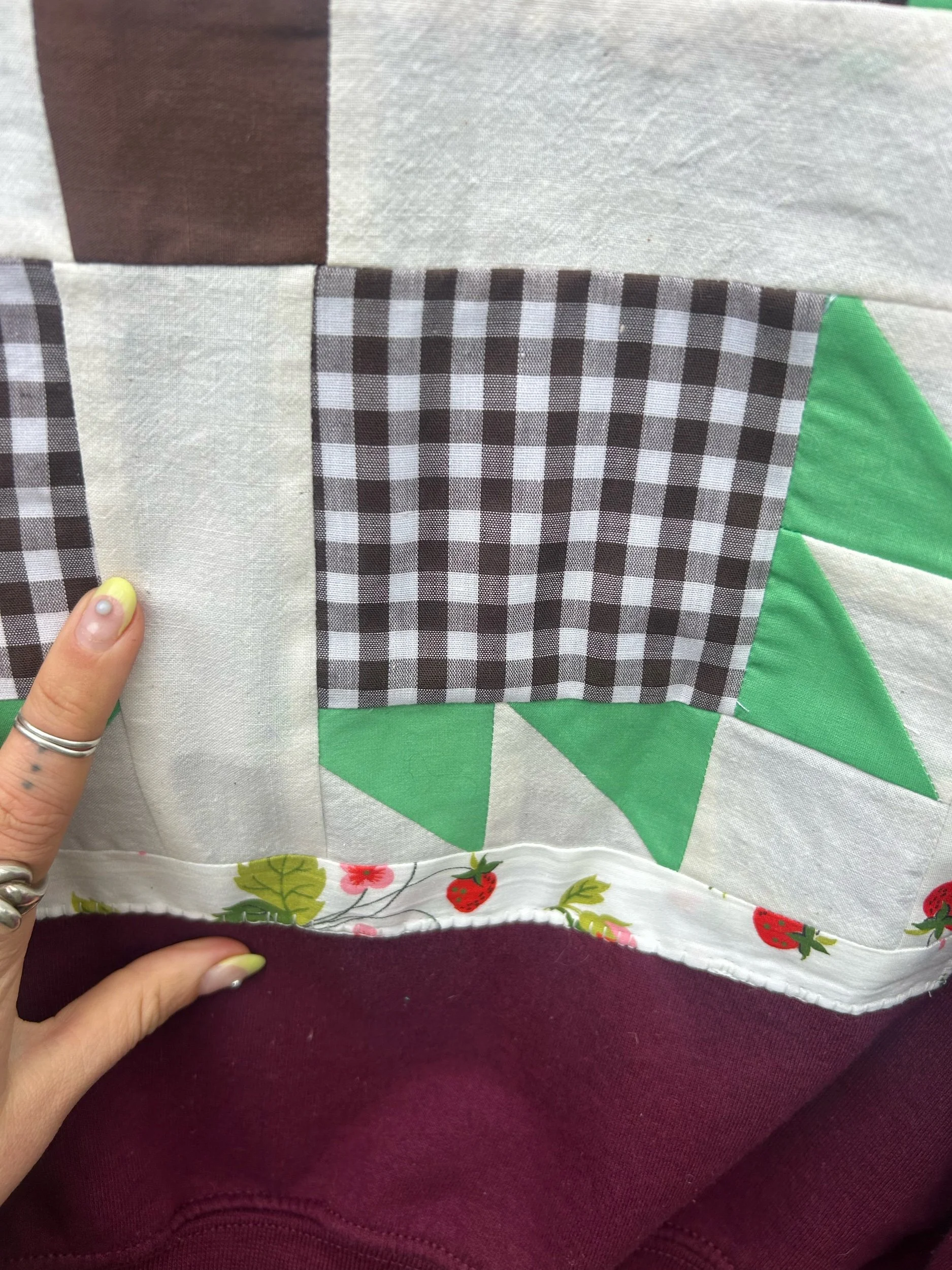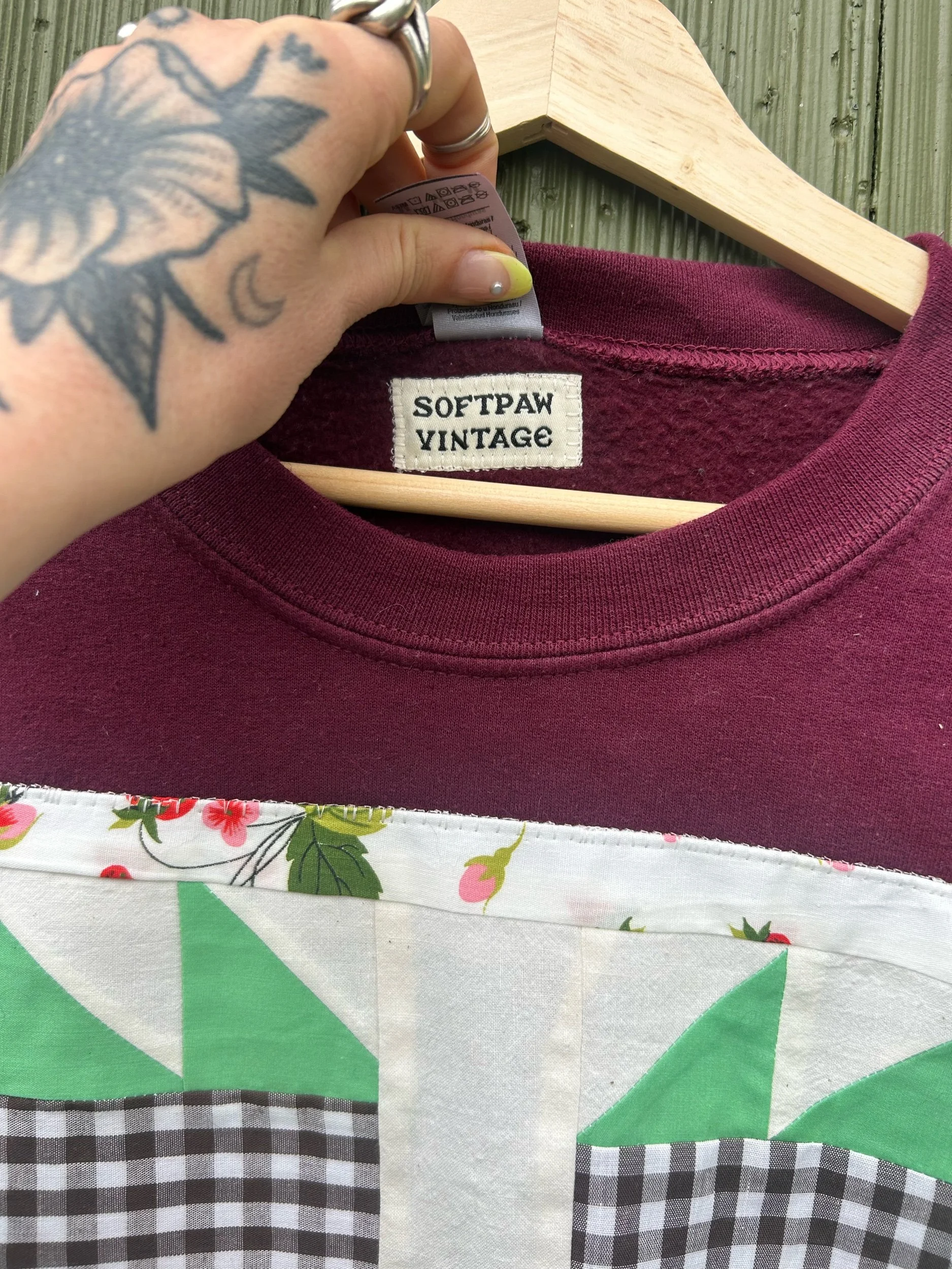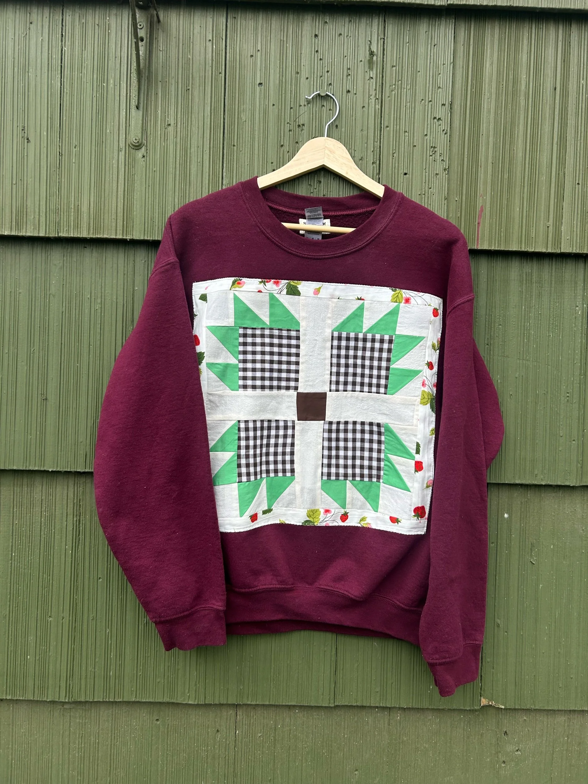 vintage maroon crewneck with added bear paw quilt block patch using appliqué stitch