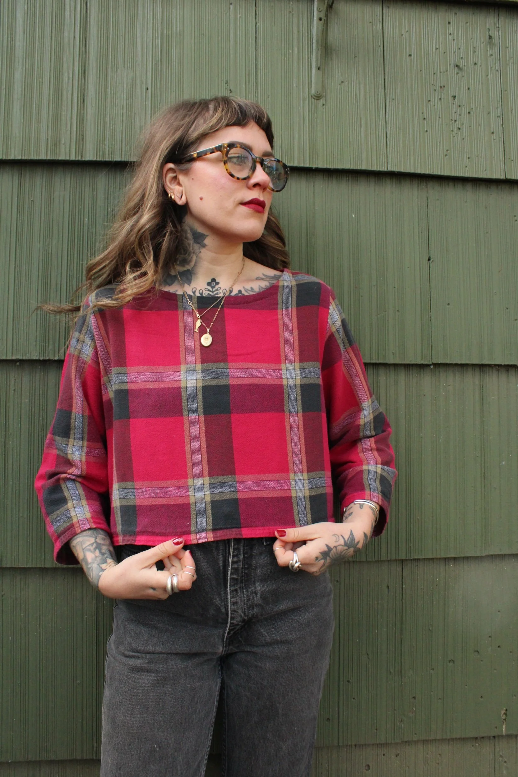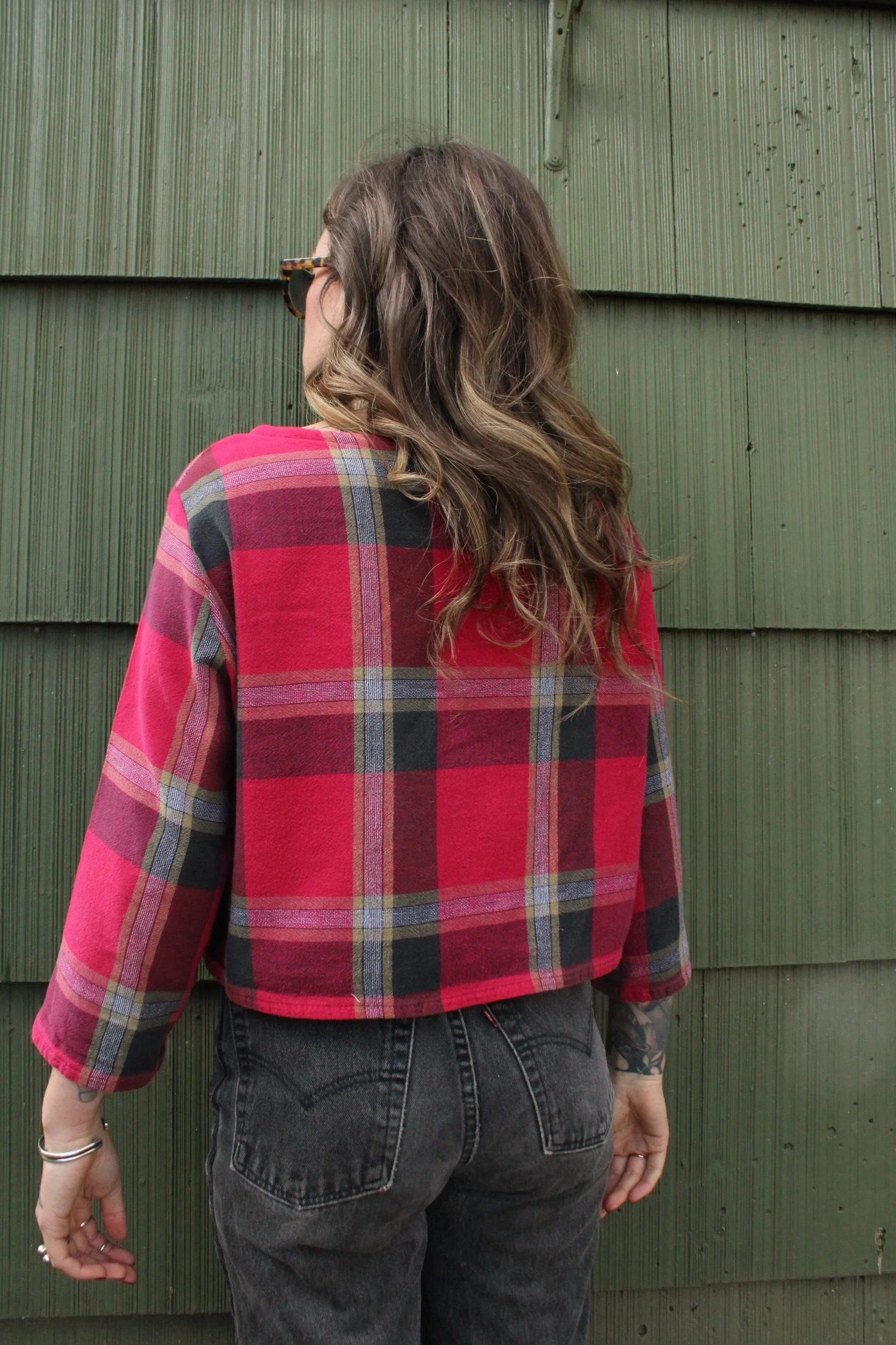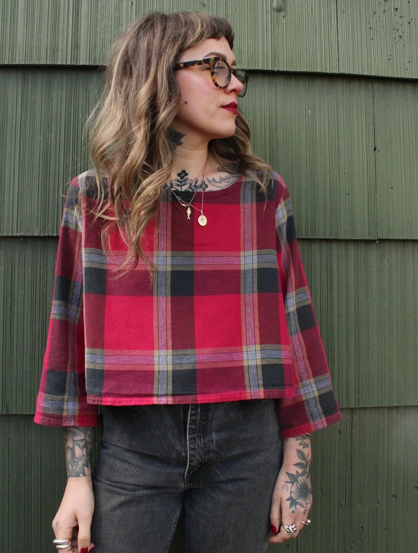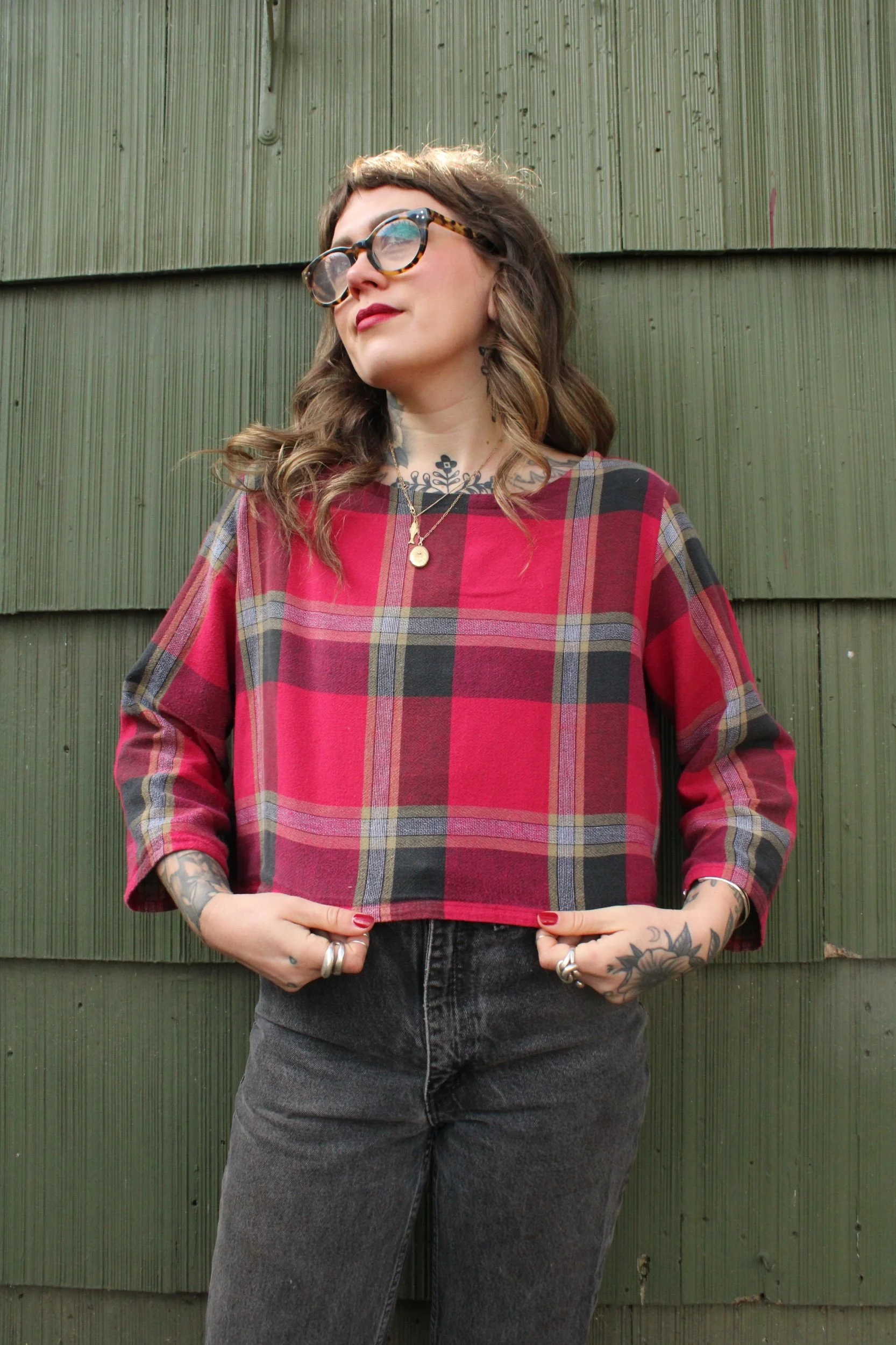 vintage plaid 100% cotton table cloth material turned cropped mid length sleeve top — fabric is on the thinner side