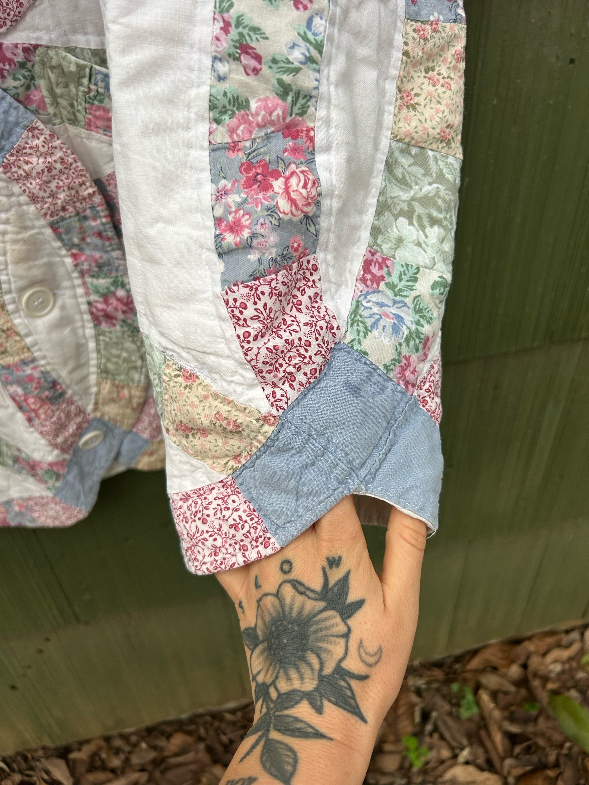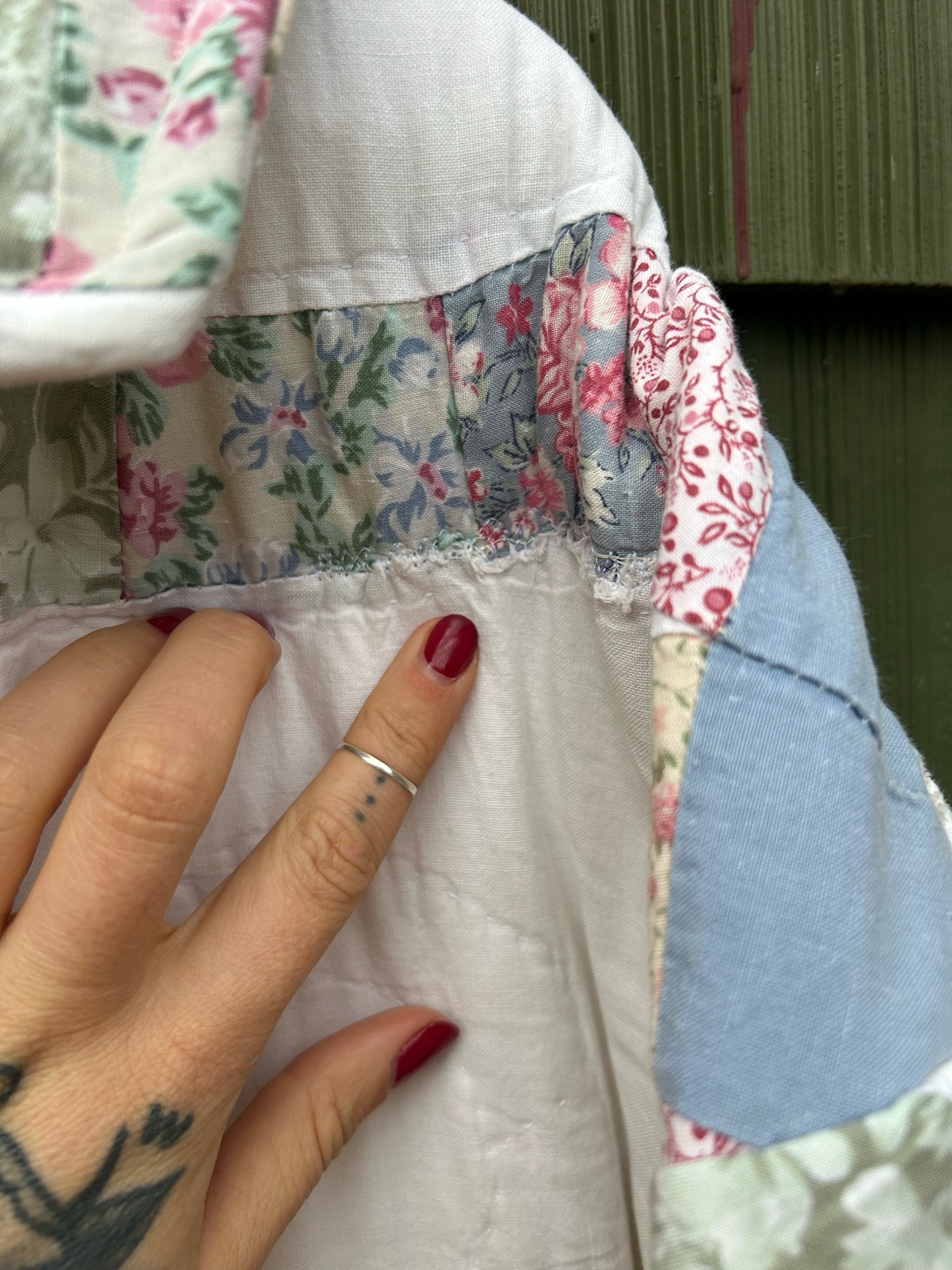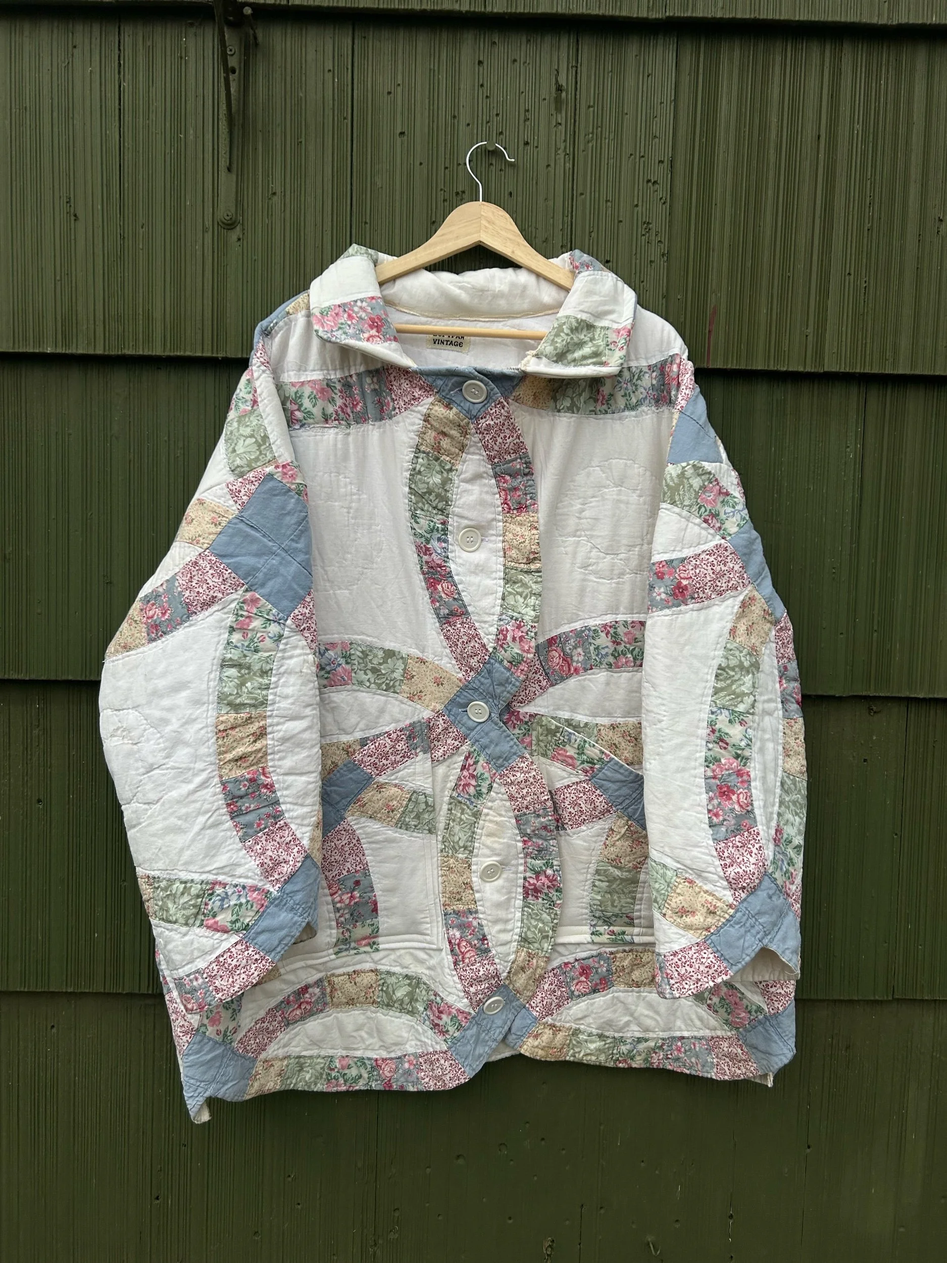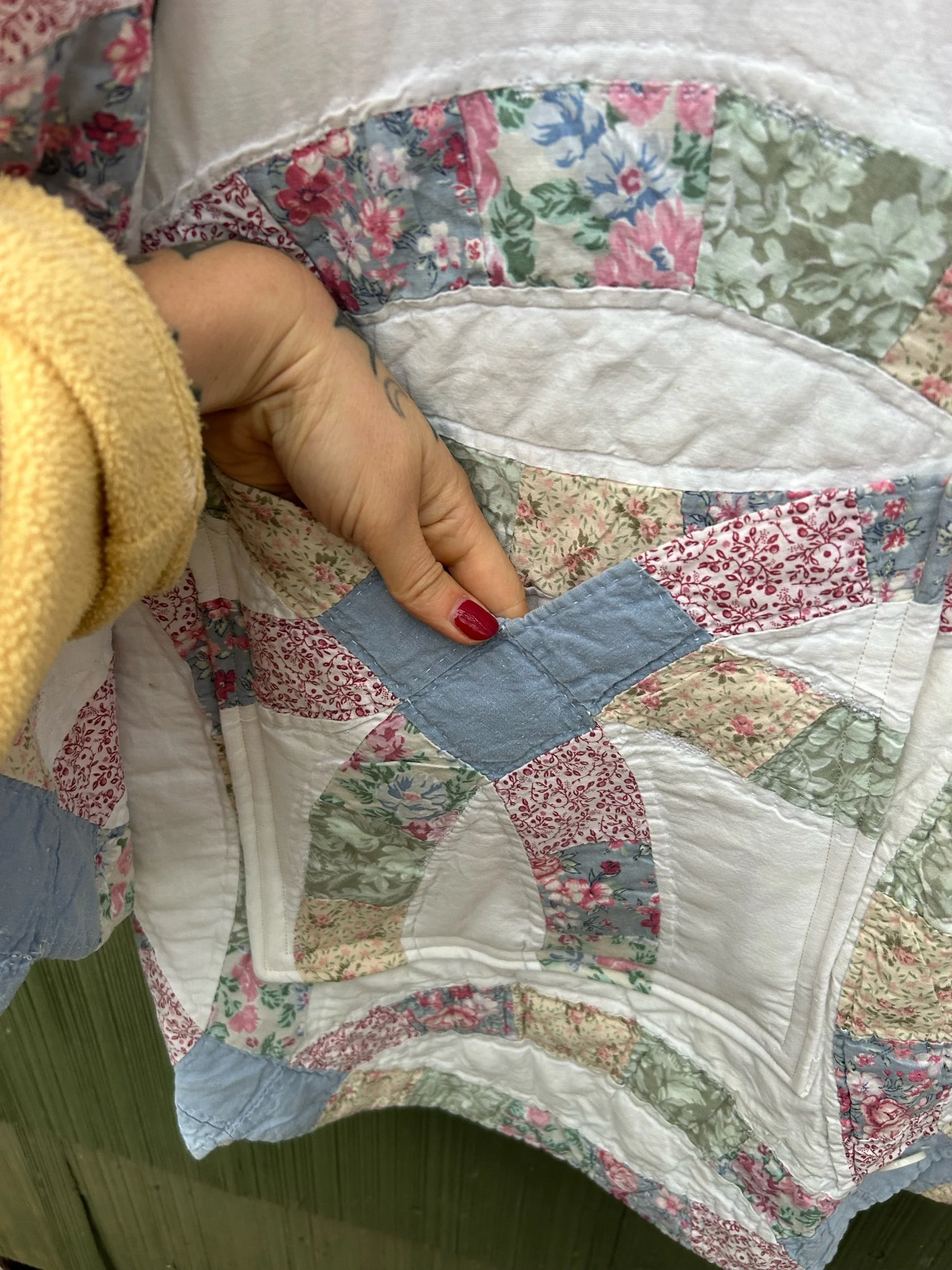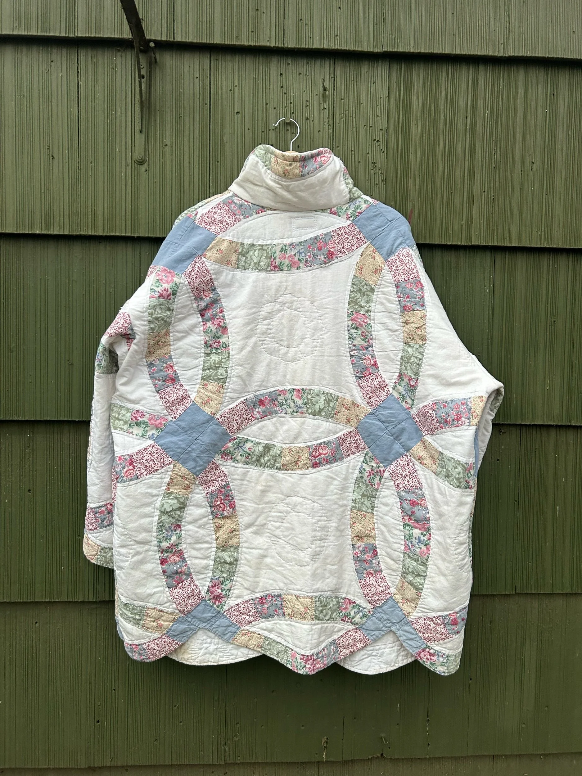 vintage machine made double wedding ring quilt with lots of mending through out done with zigzag stitch, still very structurally sound. cute light pastel colors incorporating the scalloped edges for pockets, sleeve cuffs, and bottom