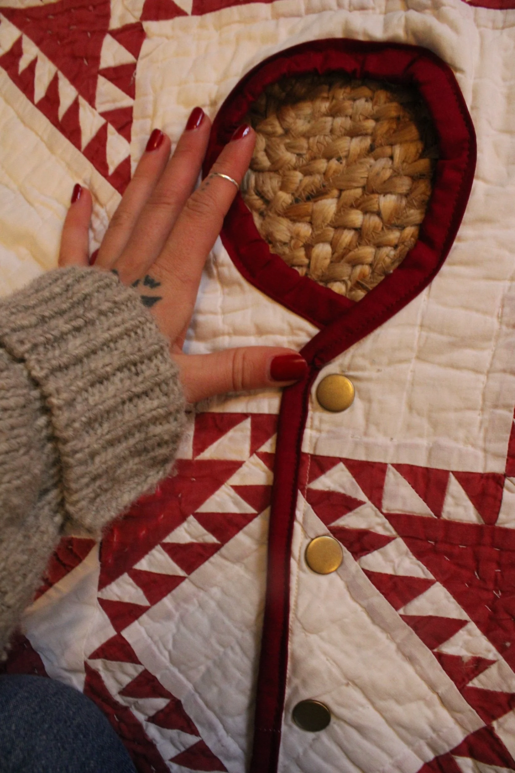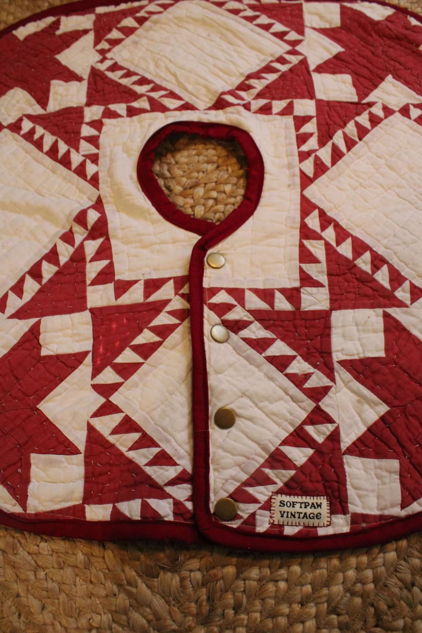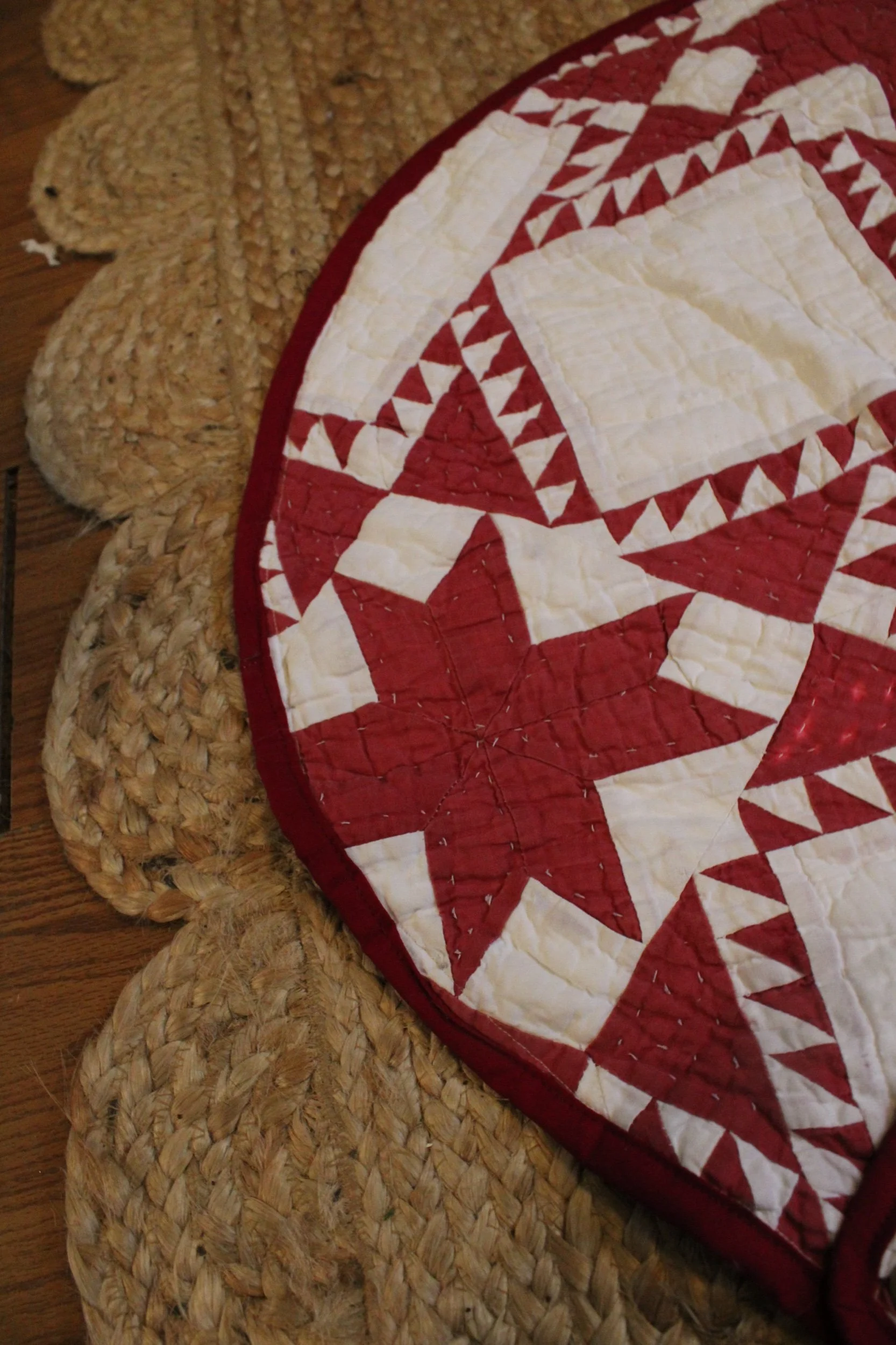 Quilt tree skirt in an oval shape meant for a smaller tree -‍ Each piece is fully bound with handmade bias binding and finished with solid brass snaps for easy on-and-off. no bending, tying, or wrestling with your tree stand. The curved edge is carefully sewn and hand-finished, giving the skirt a clean, durable, heirloom-quality finish you’ll enjoy for many years to come