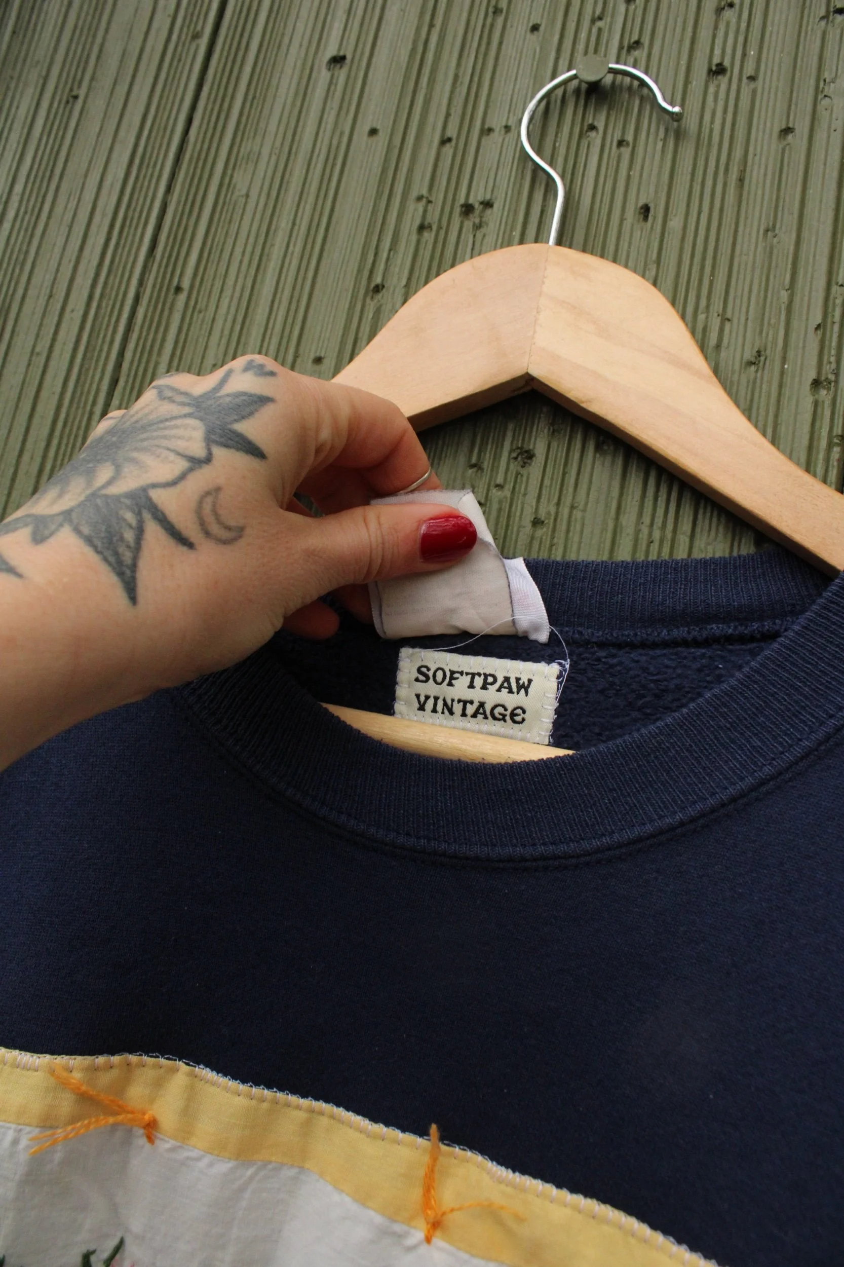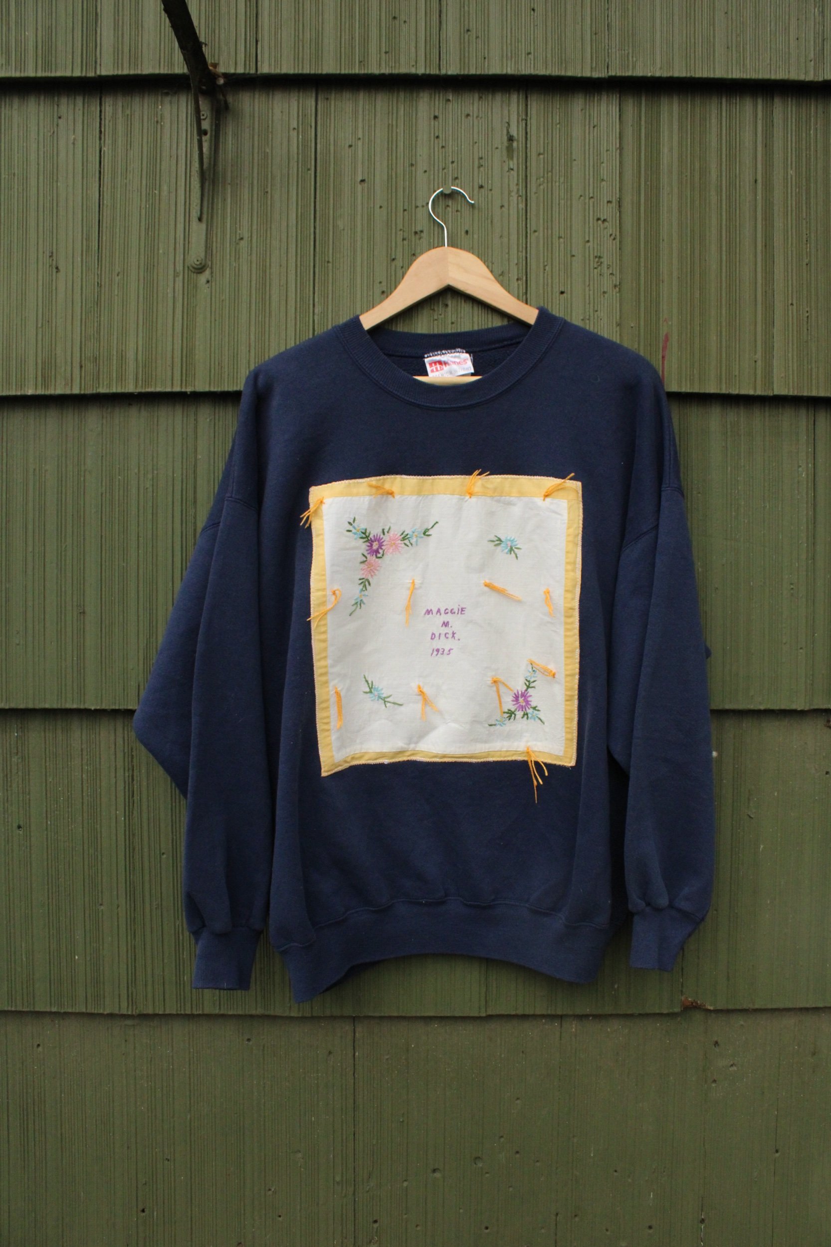 vintage navy blue crewneck with added embroidered name patch from a quilt dated back to 1932
