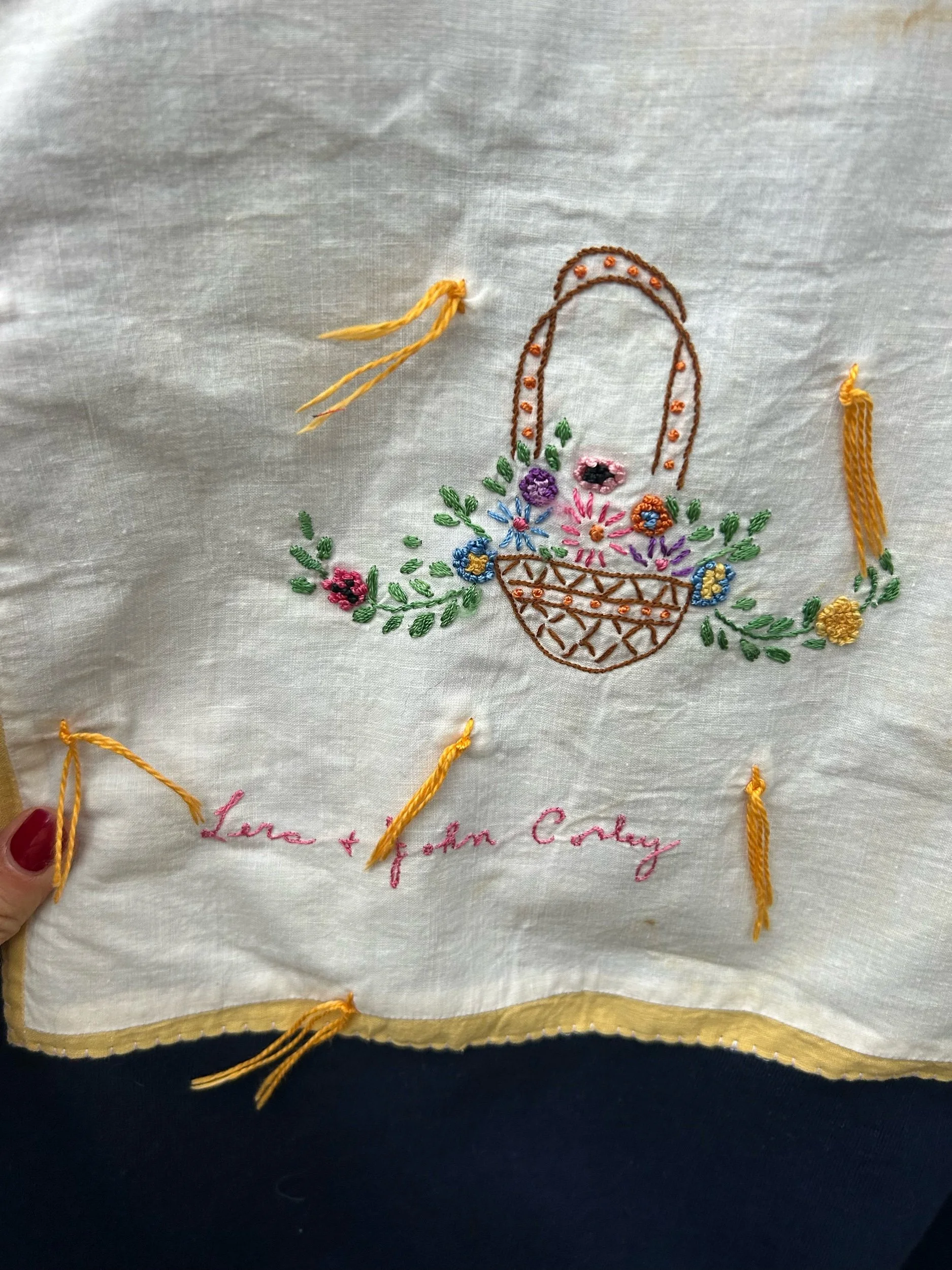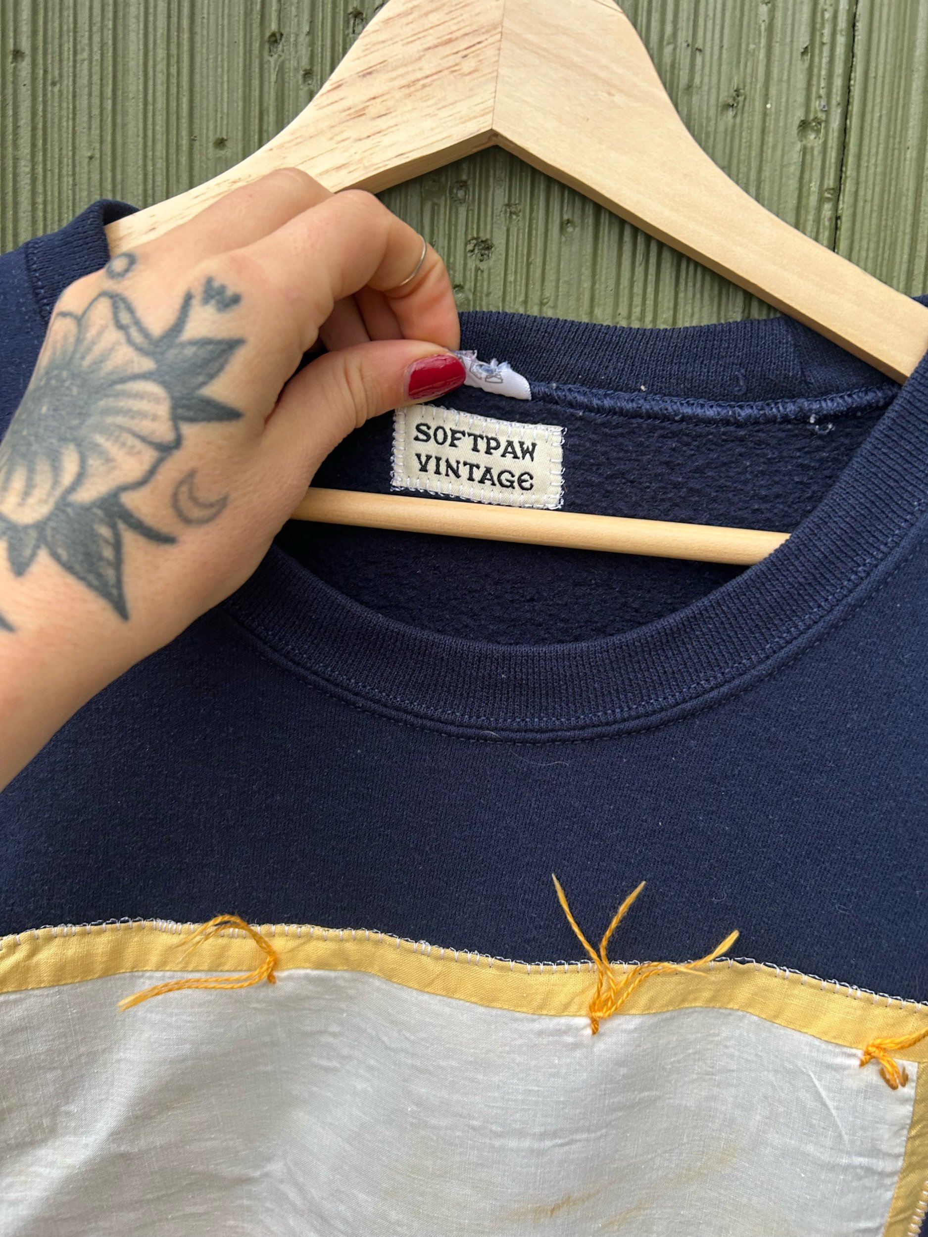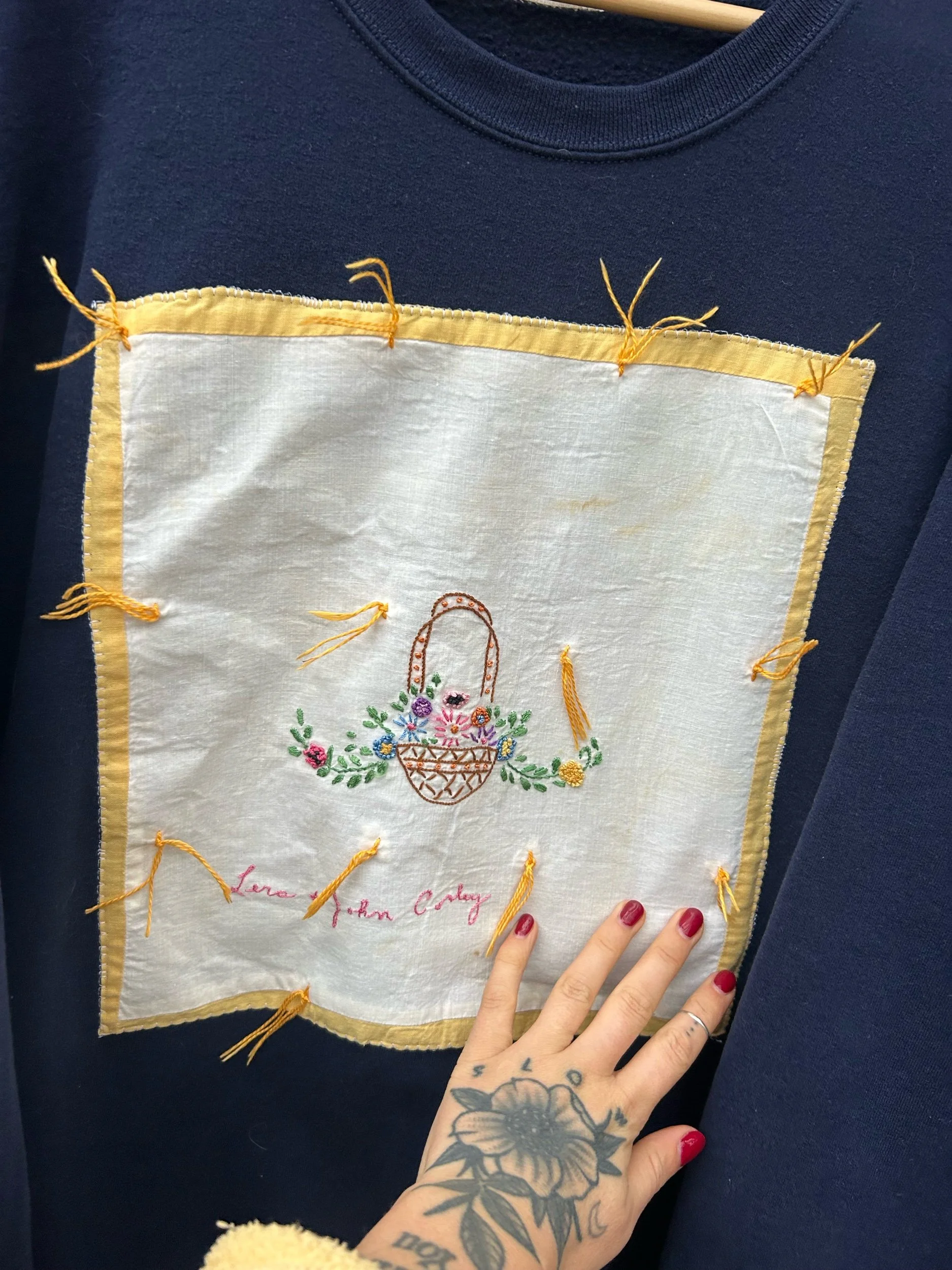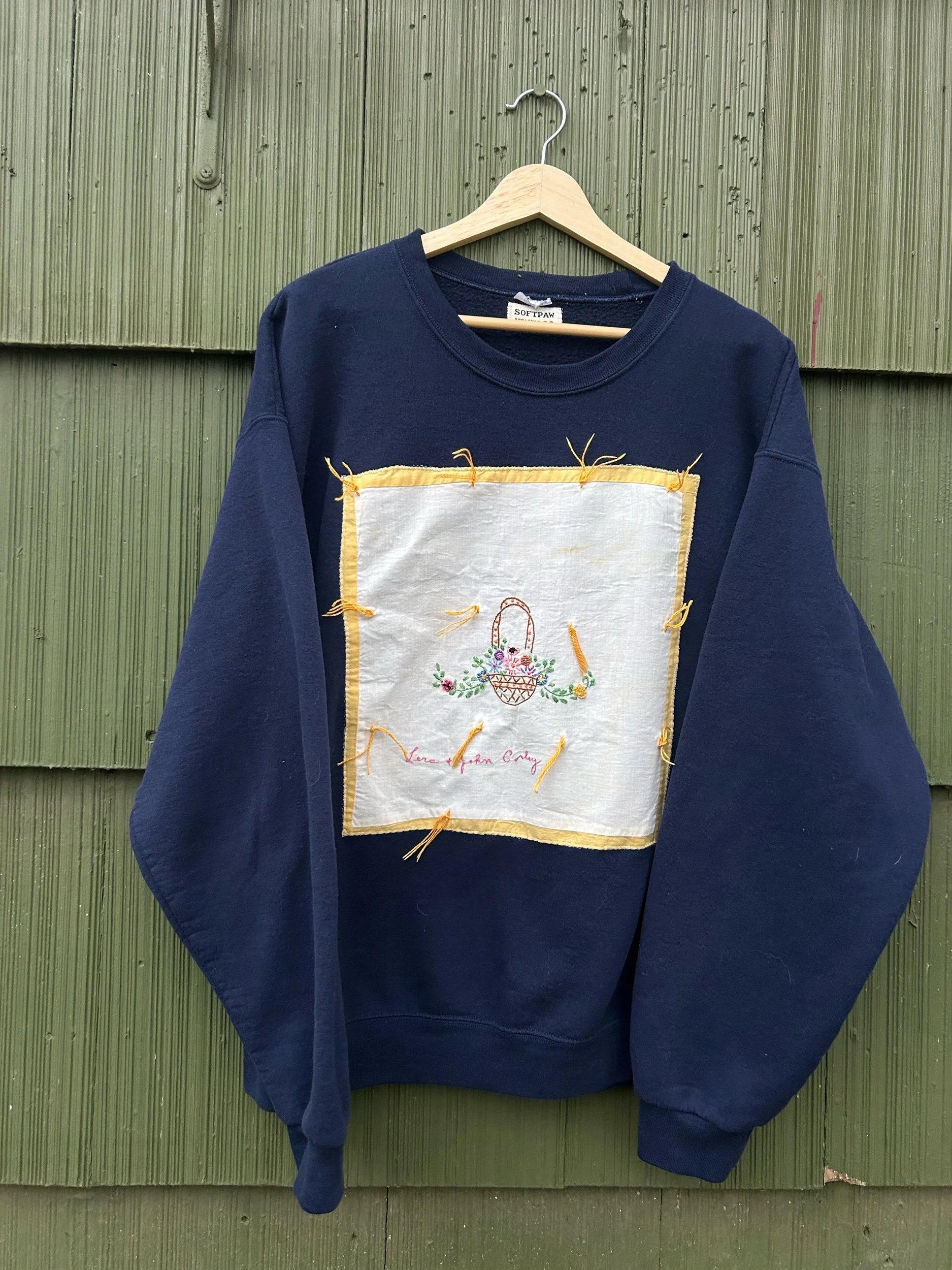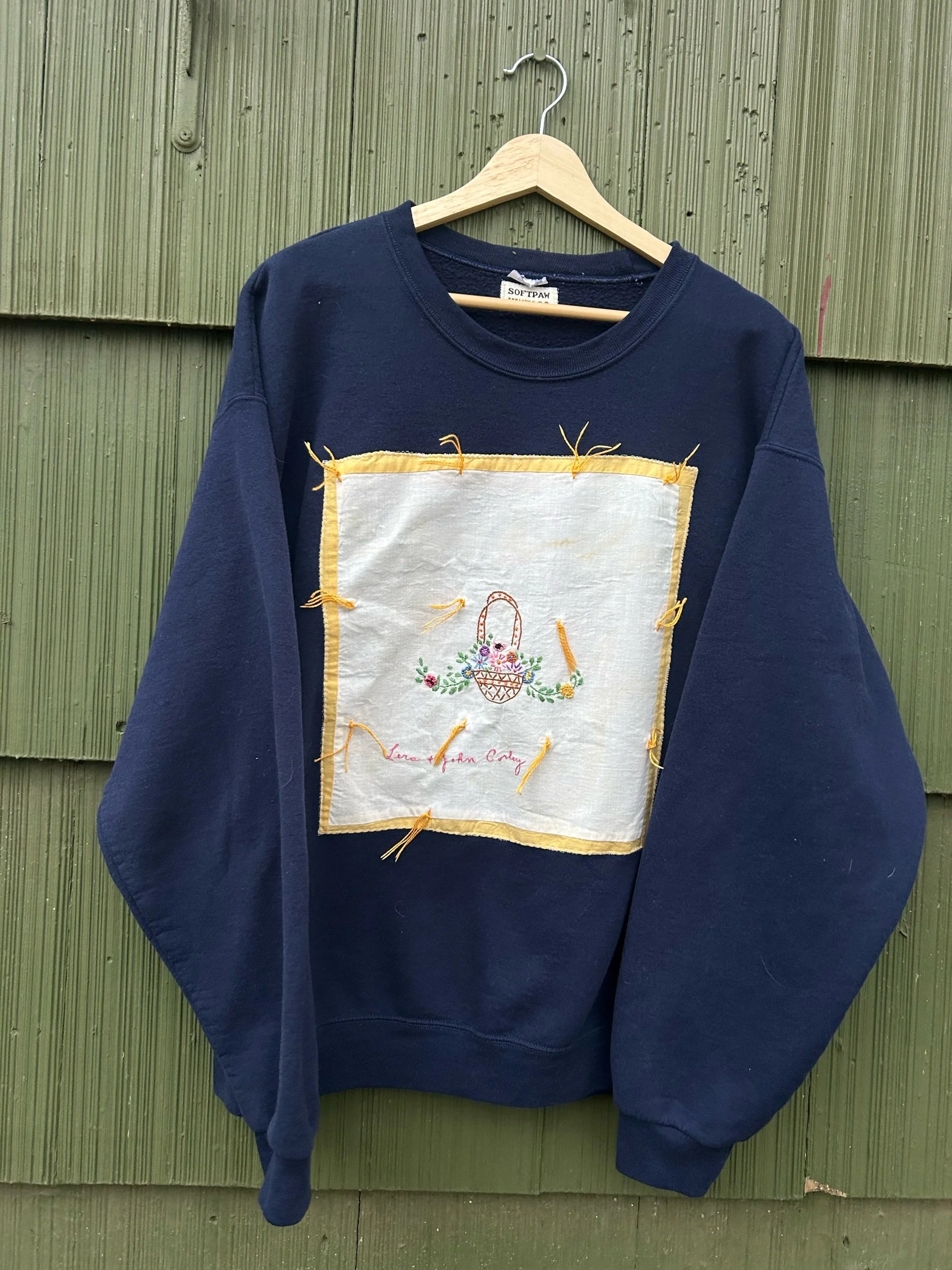 vintage navy blue crewneck with added embroidered name patch from a quilt dated back to 1932