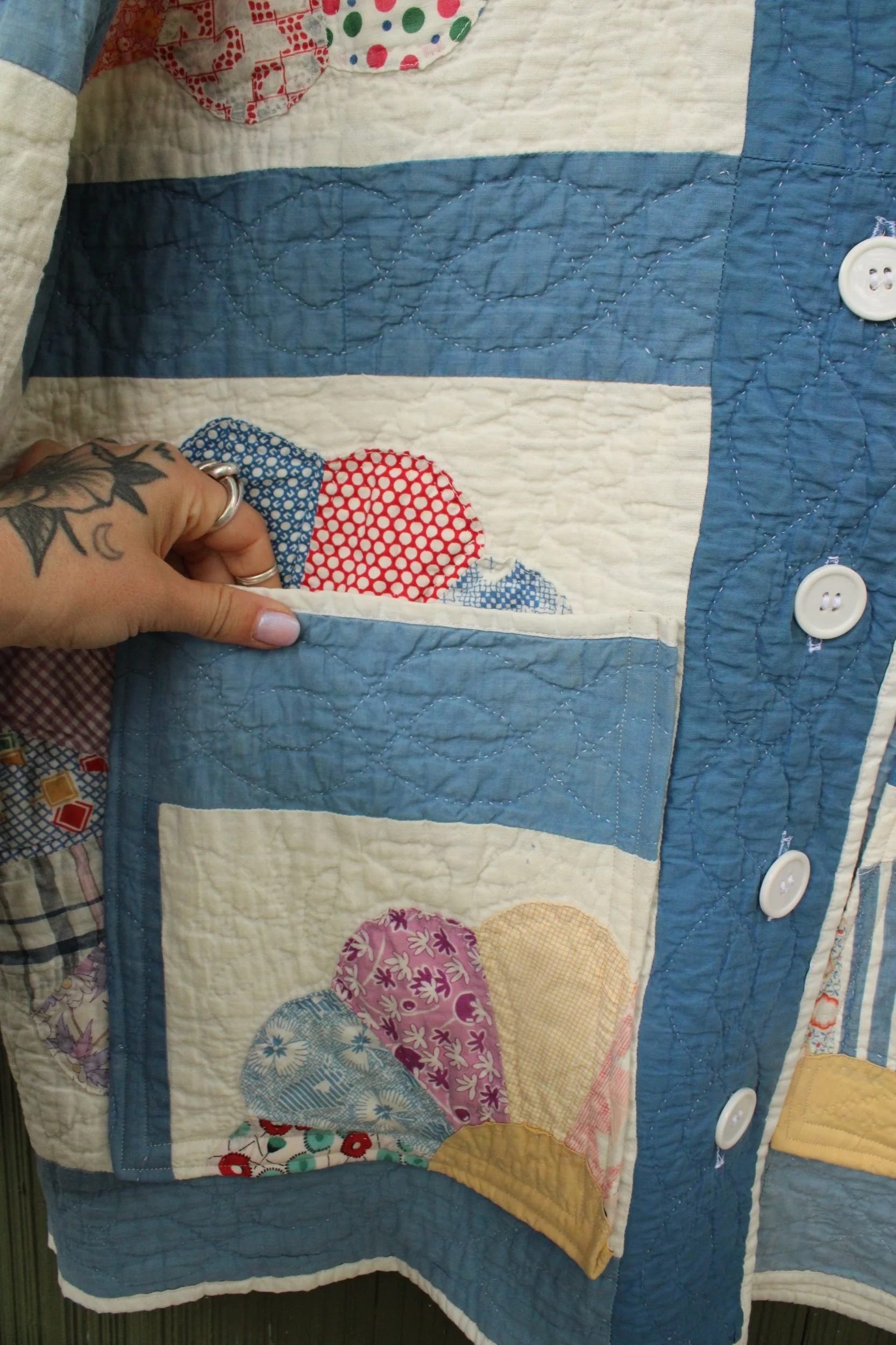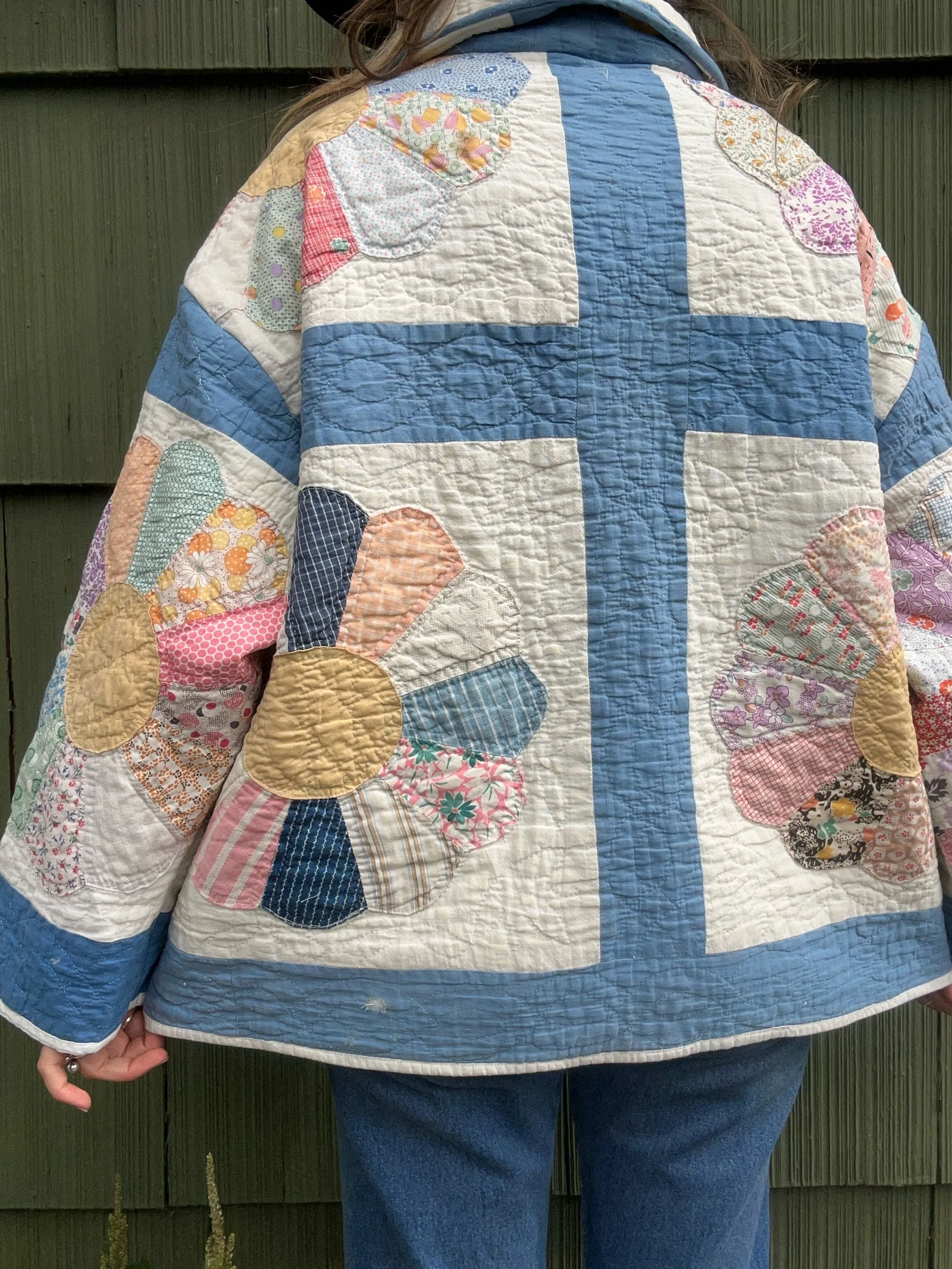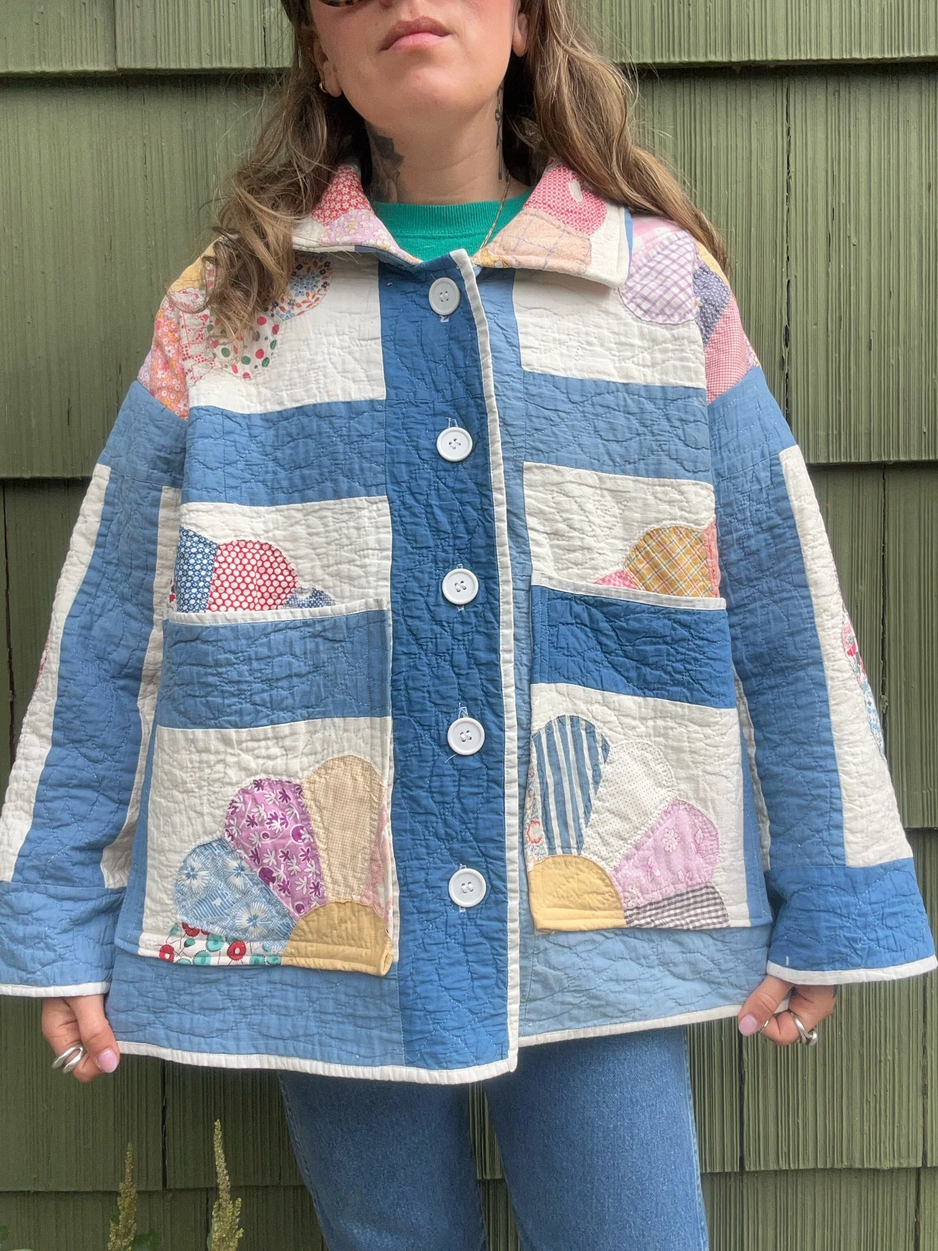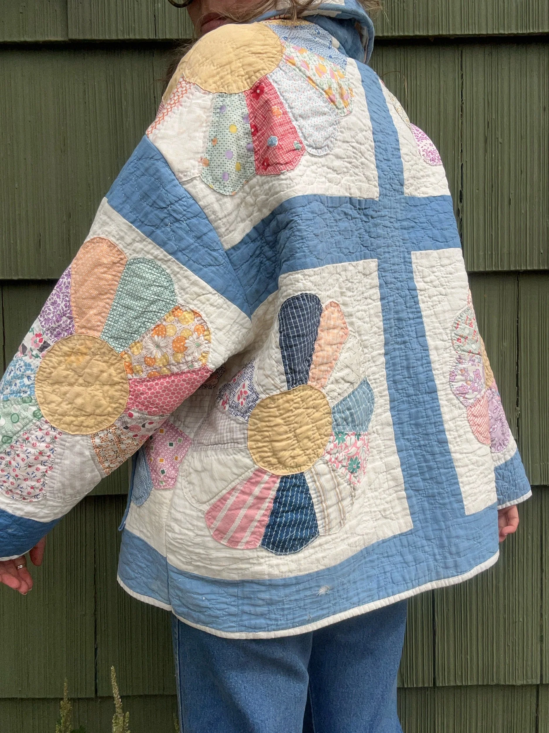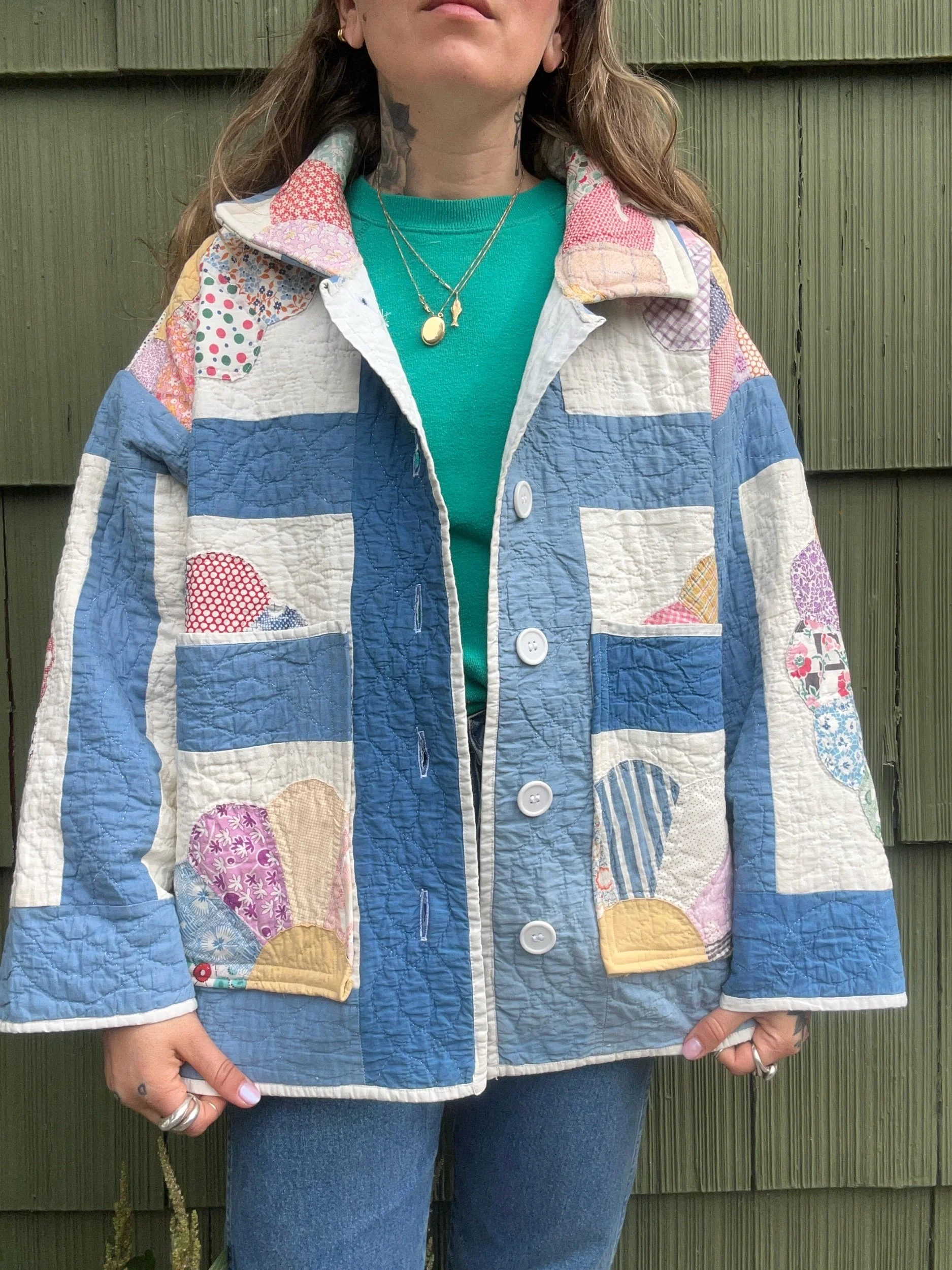 vintage dresden quilt turned chore coat with oversized pockets and buttons