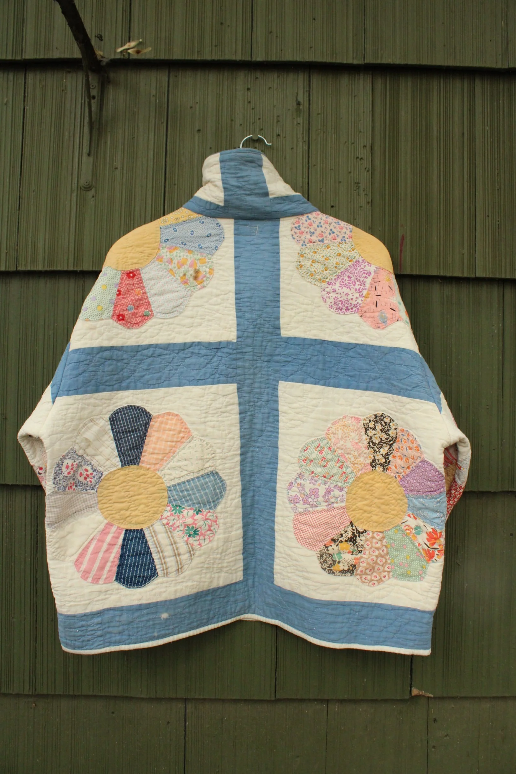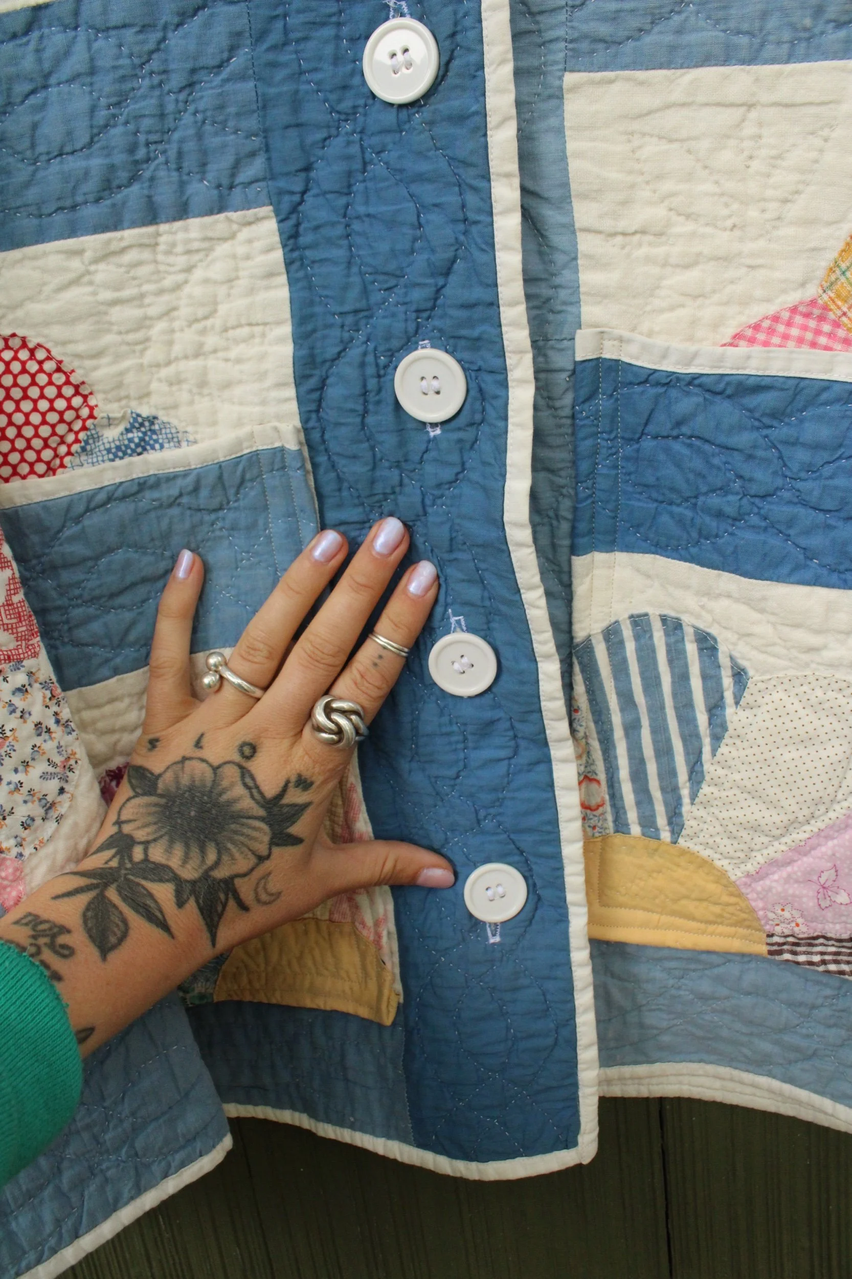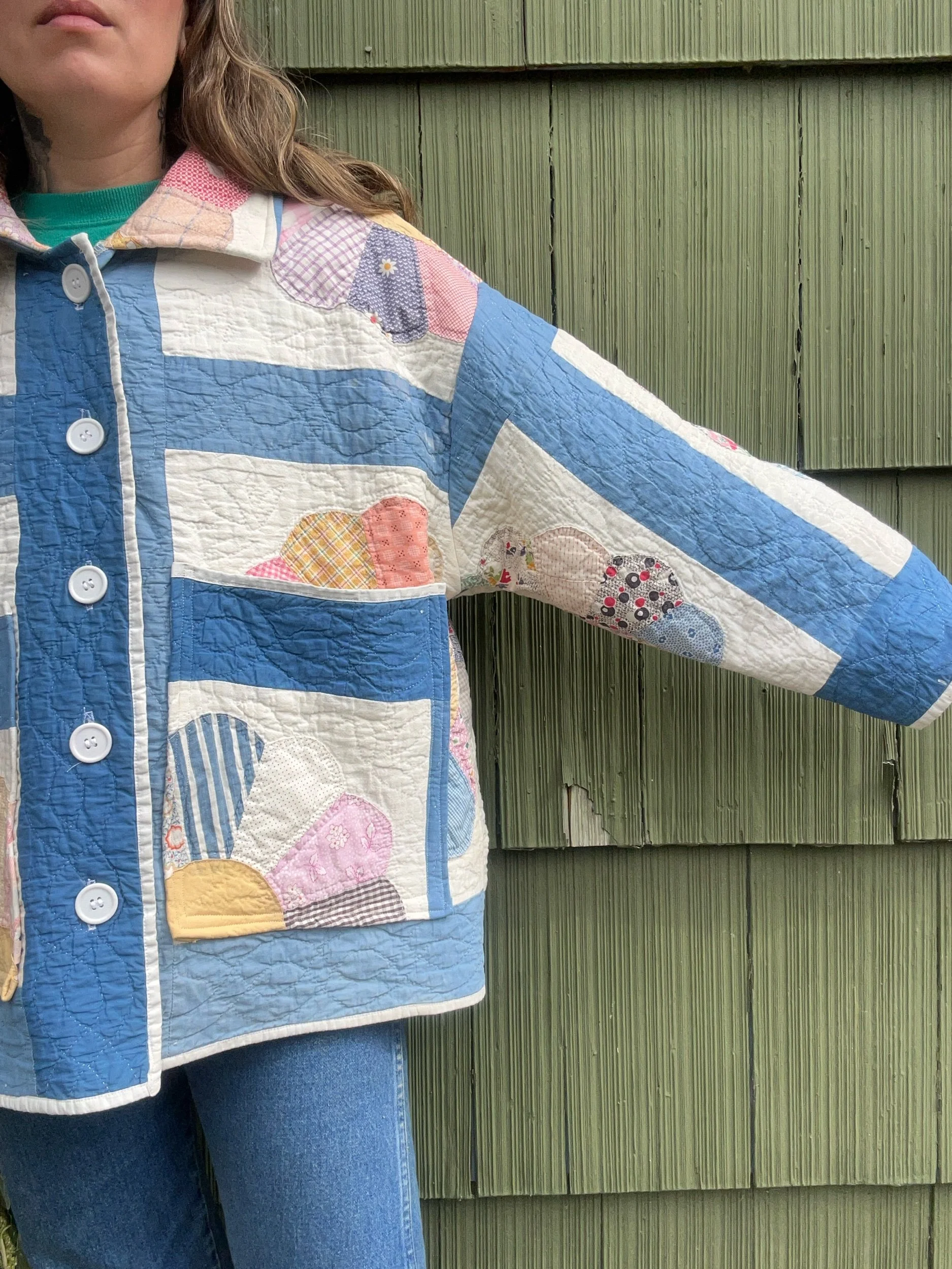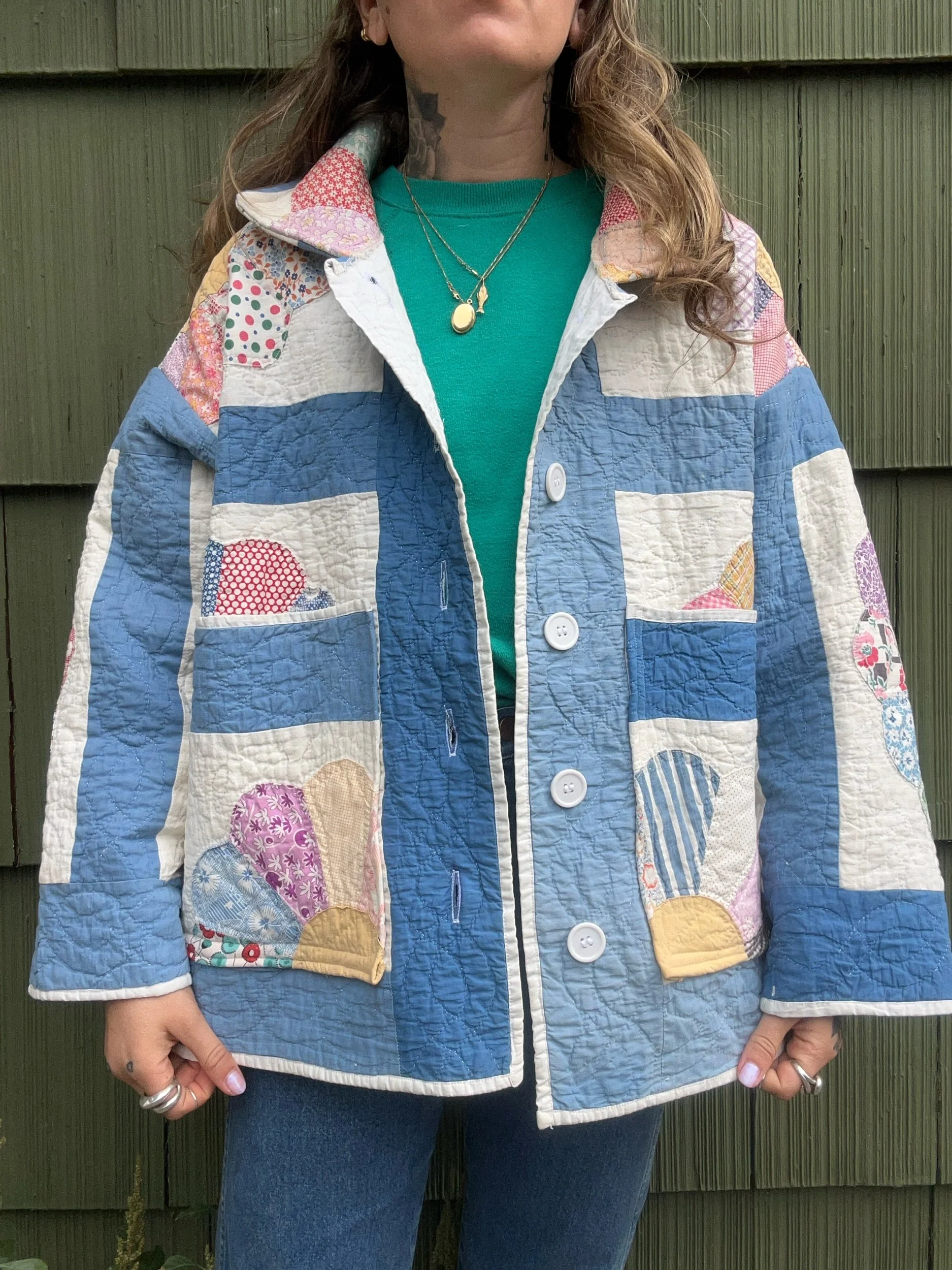 vintage dresden quilt turned chore coat with oversized pockets and buttons