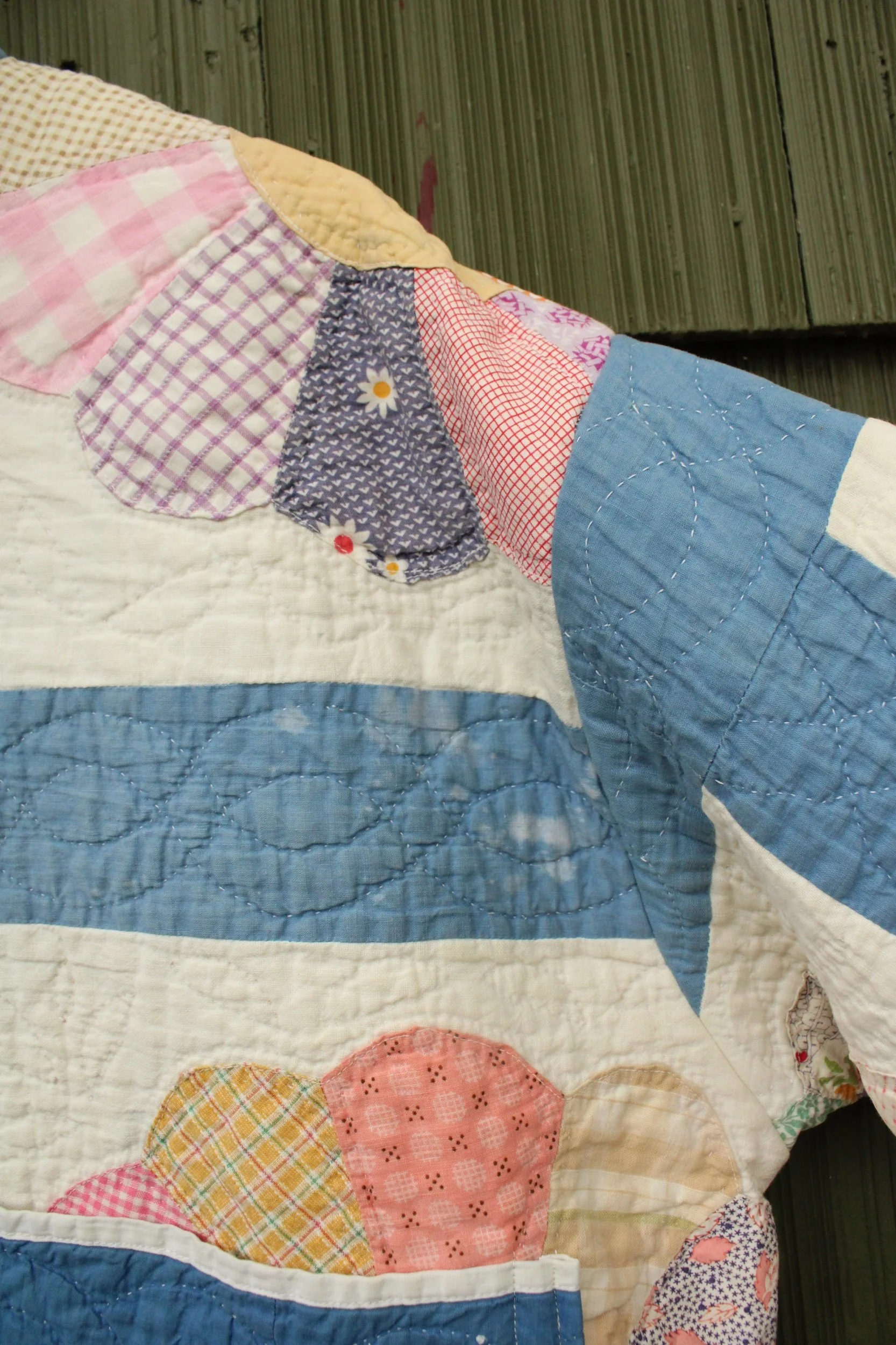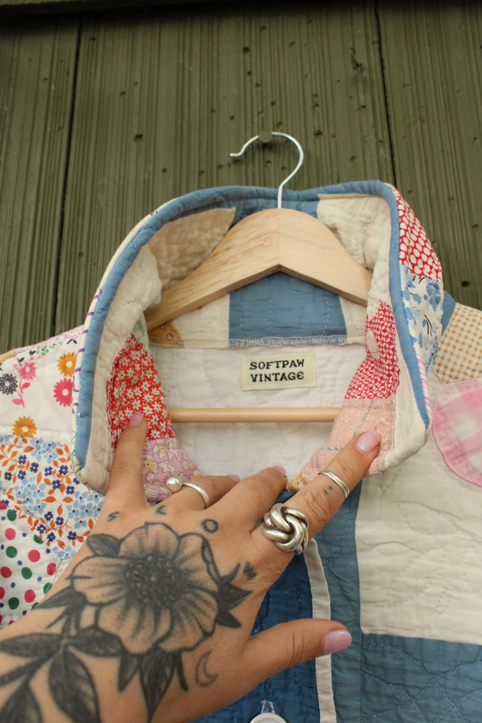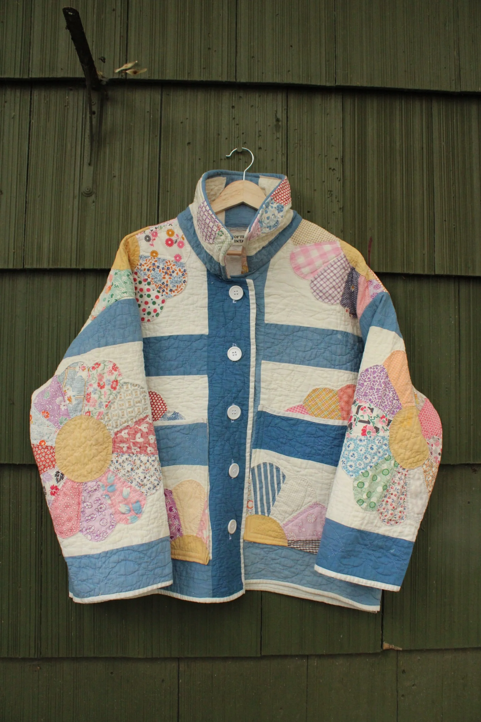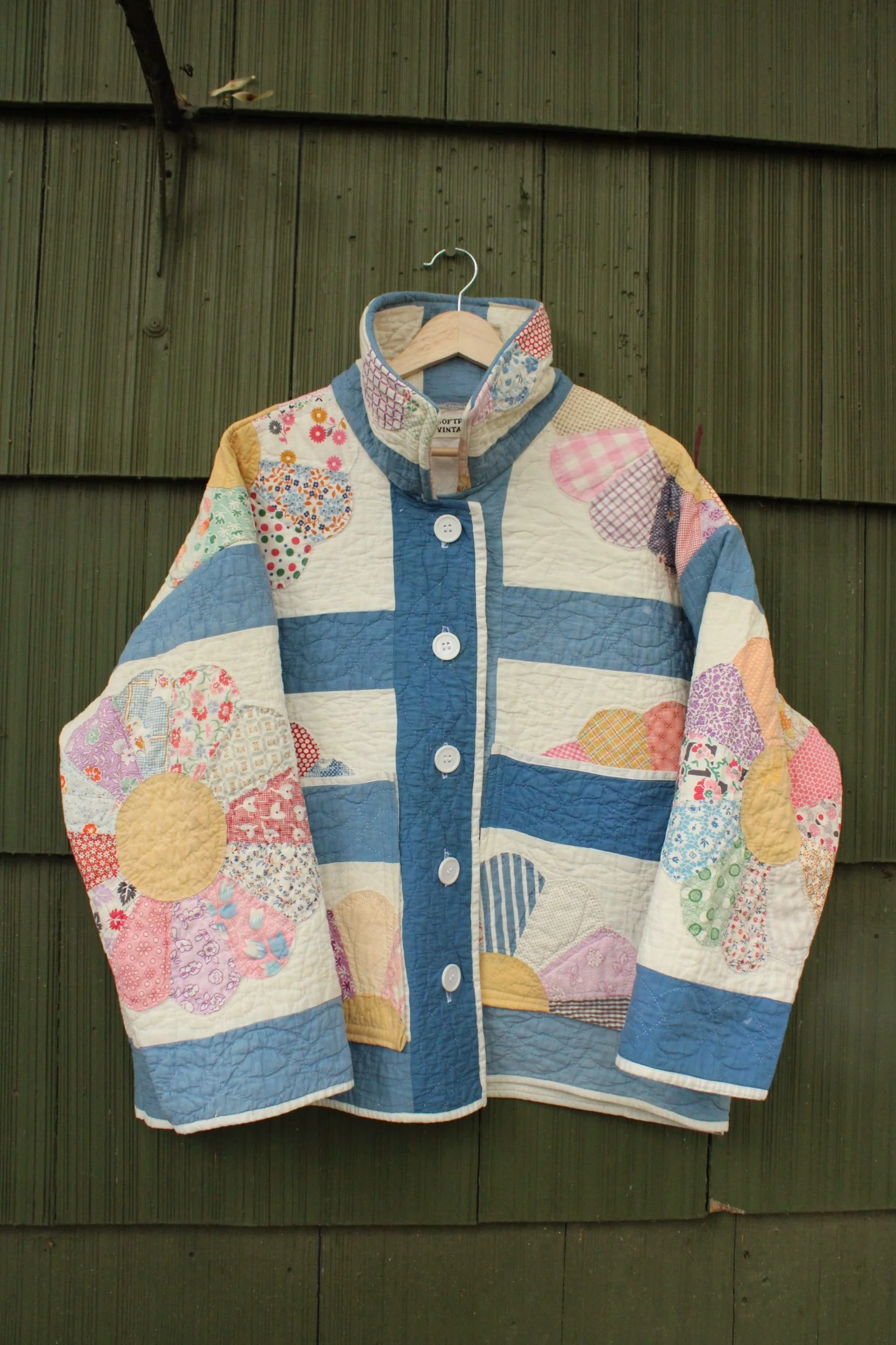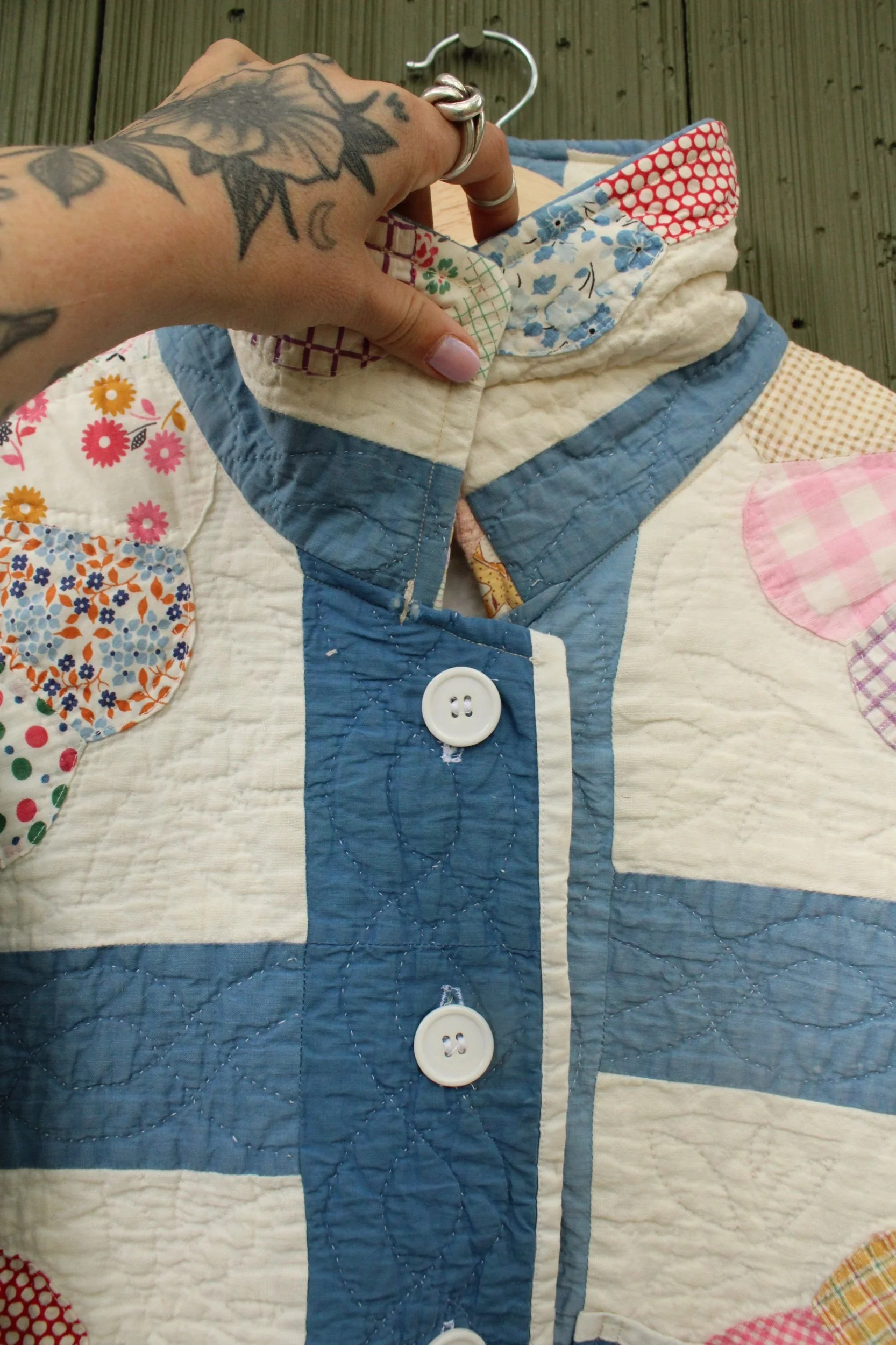 vintage dresden quilt turned chore coat with oversized pockets and buttons