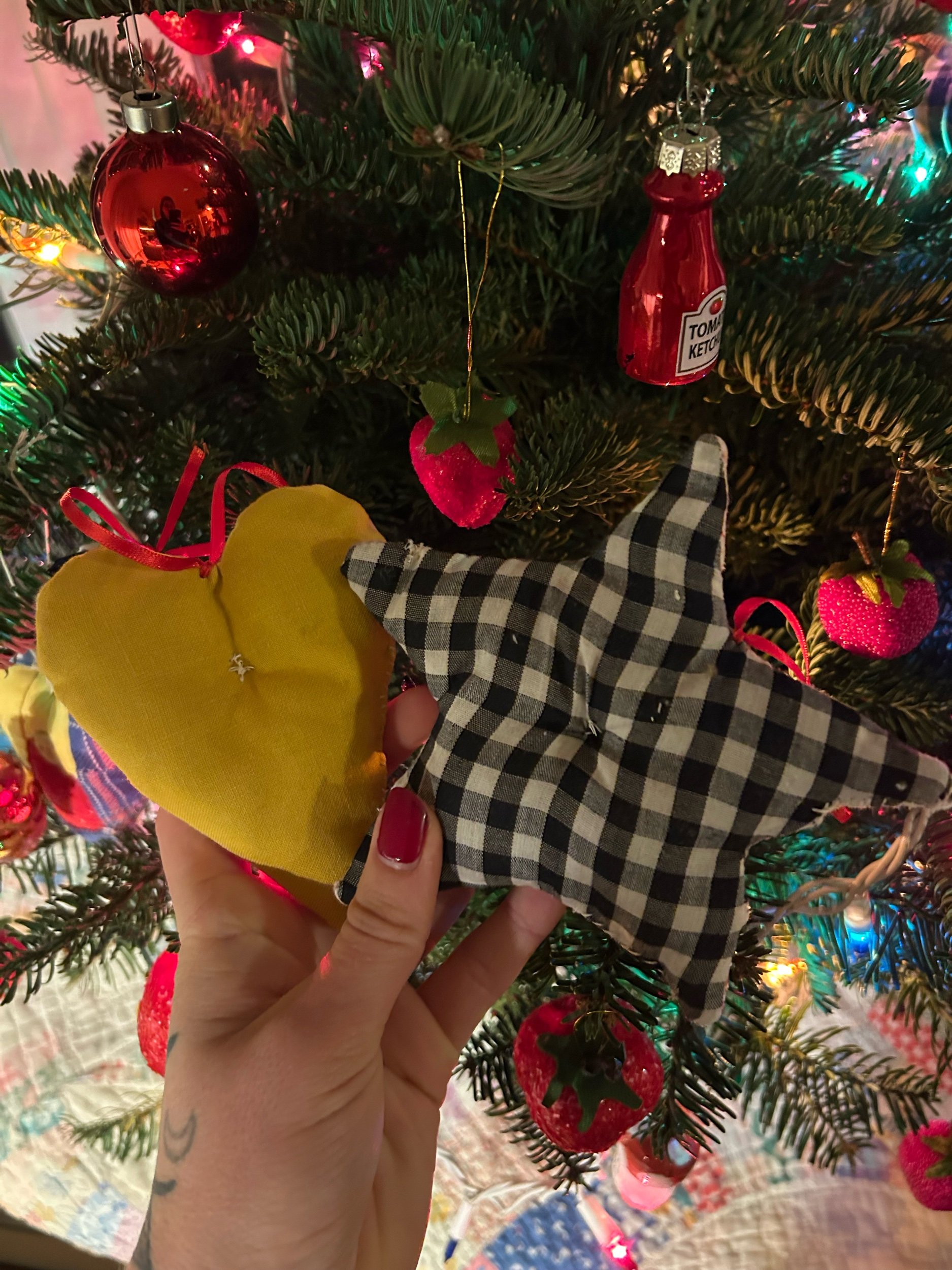 quilt scrap turned homemade Christmas tree ornaments with vintage buttons, hand sewn