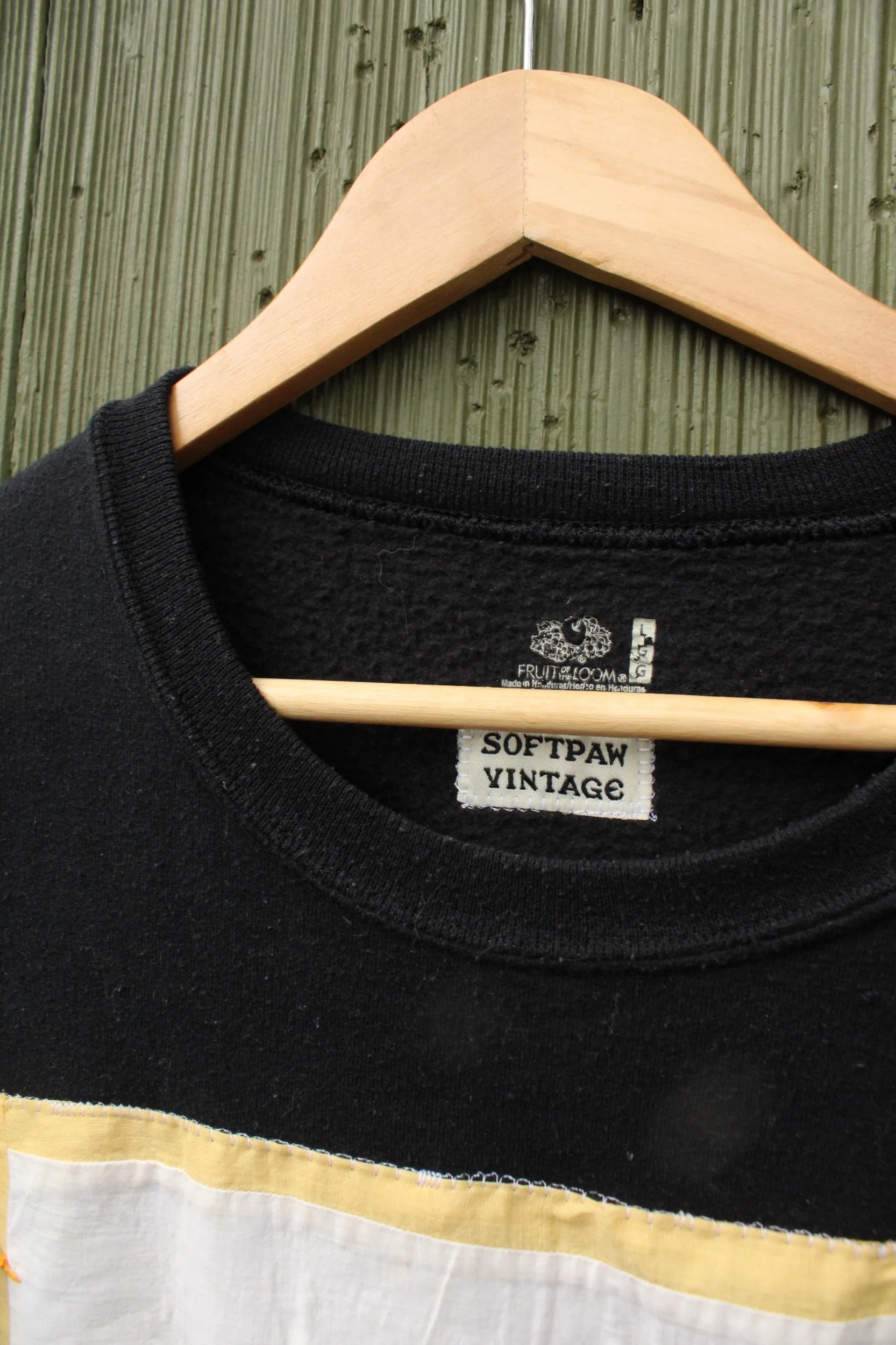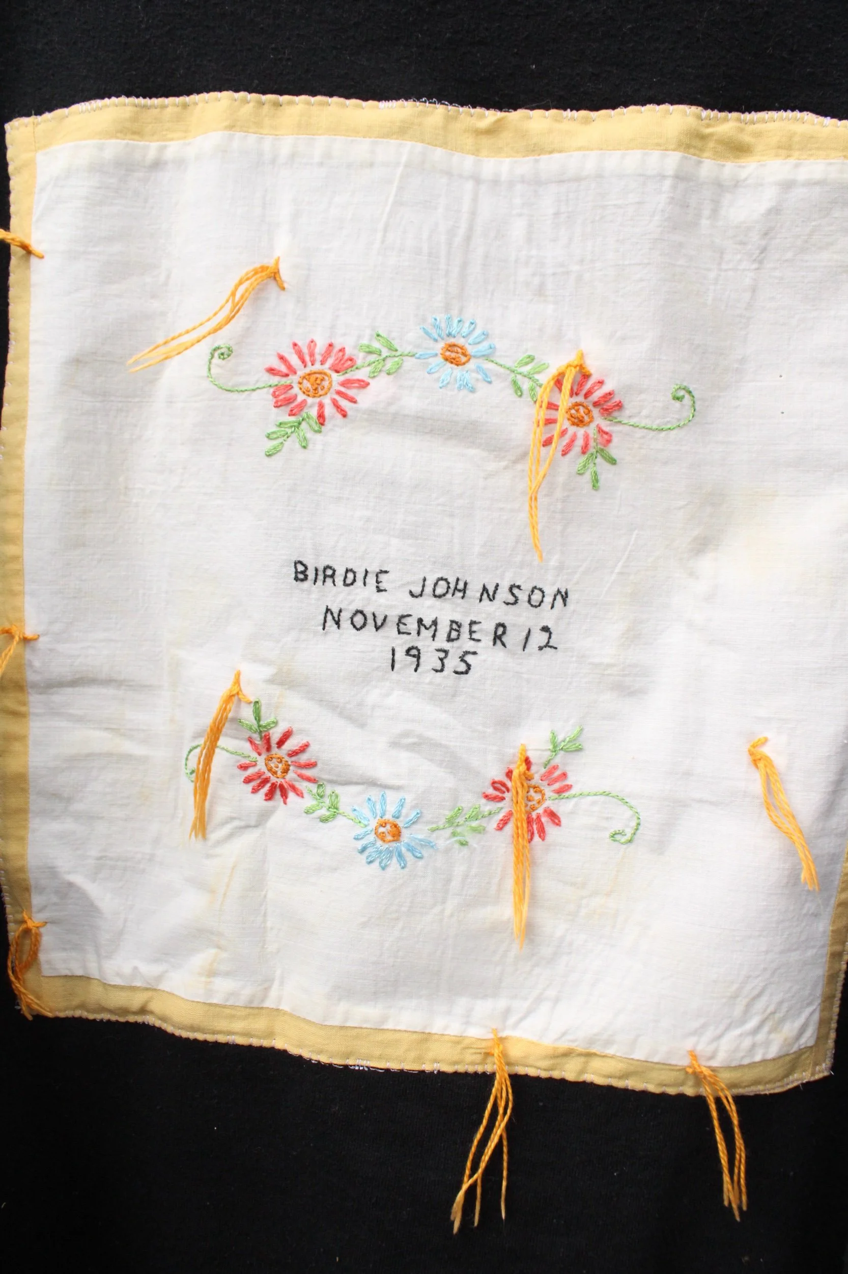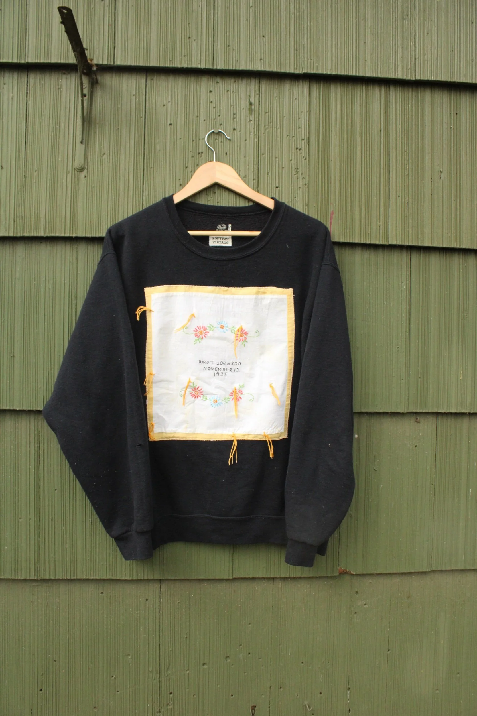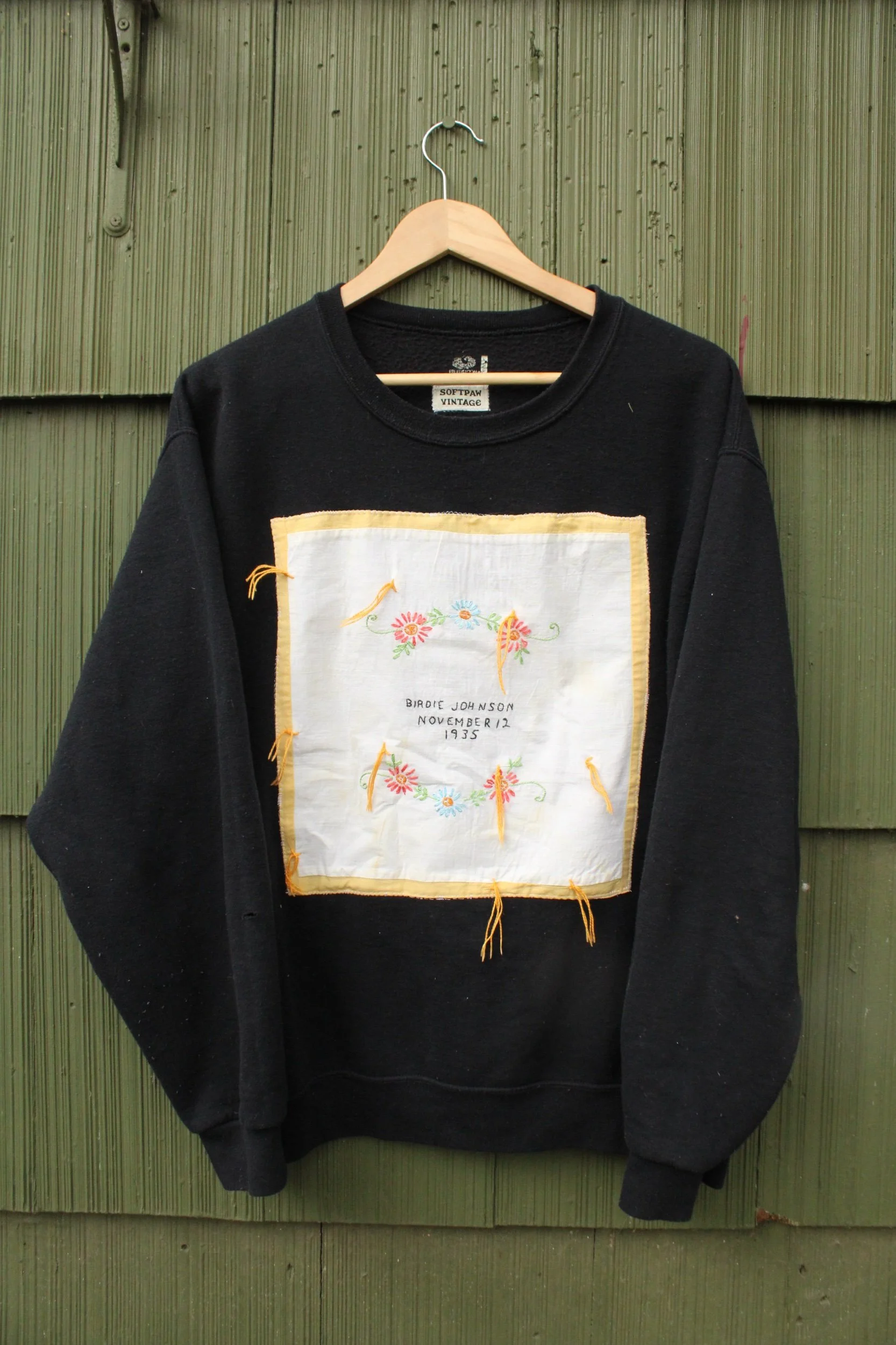 vintage black crewneck with added embroidered name patch from a quilt dated back to 1932
