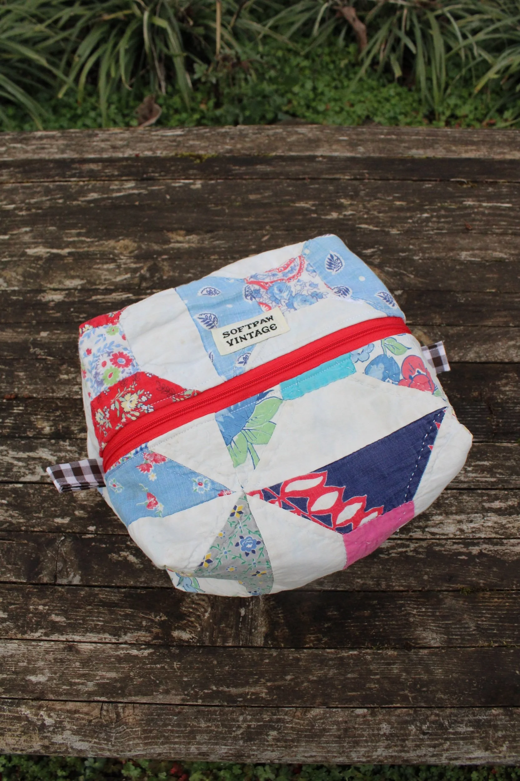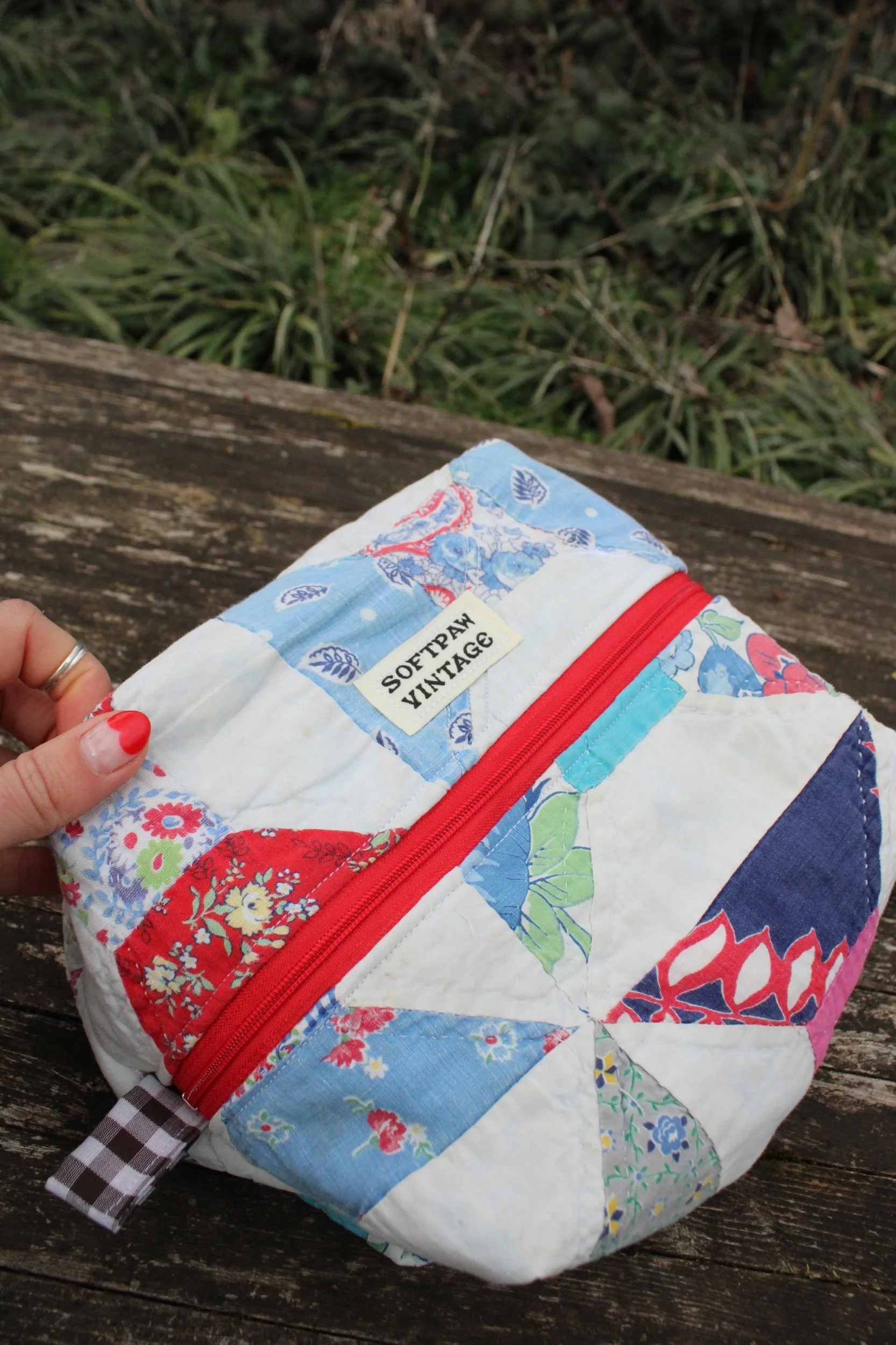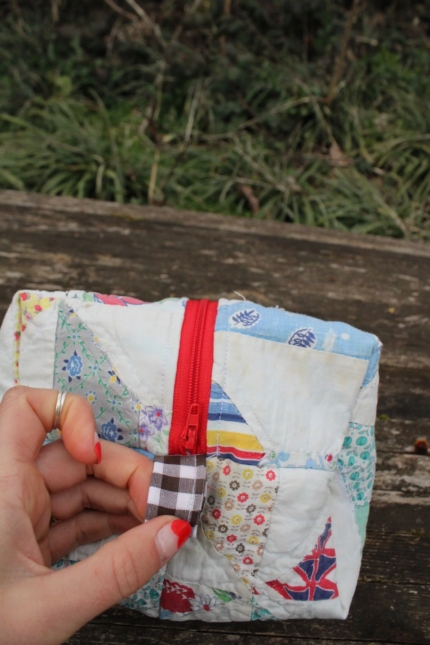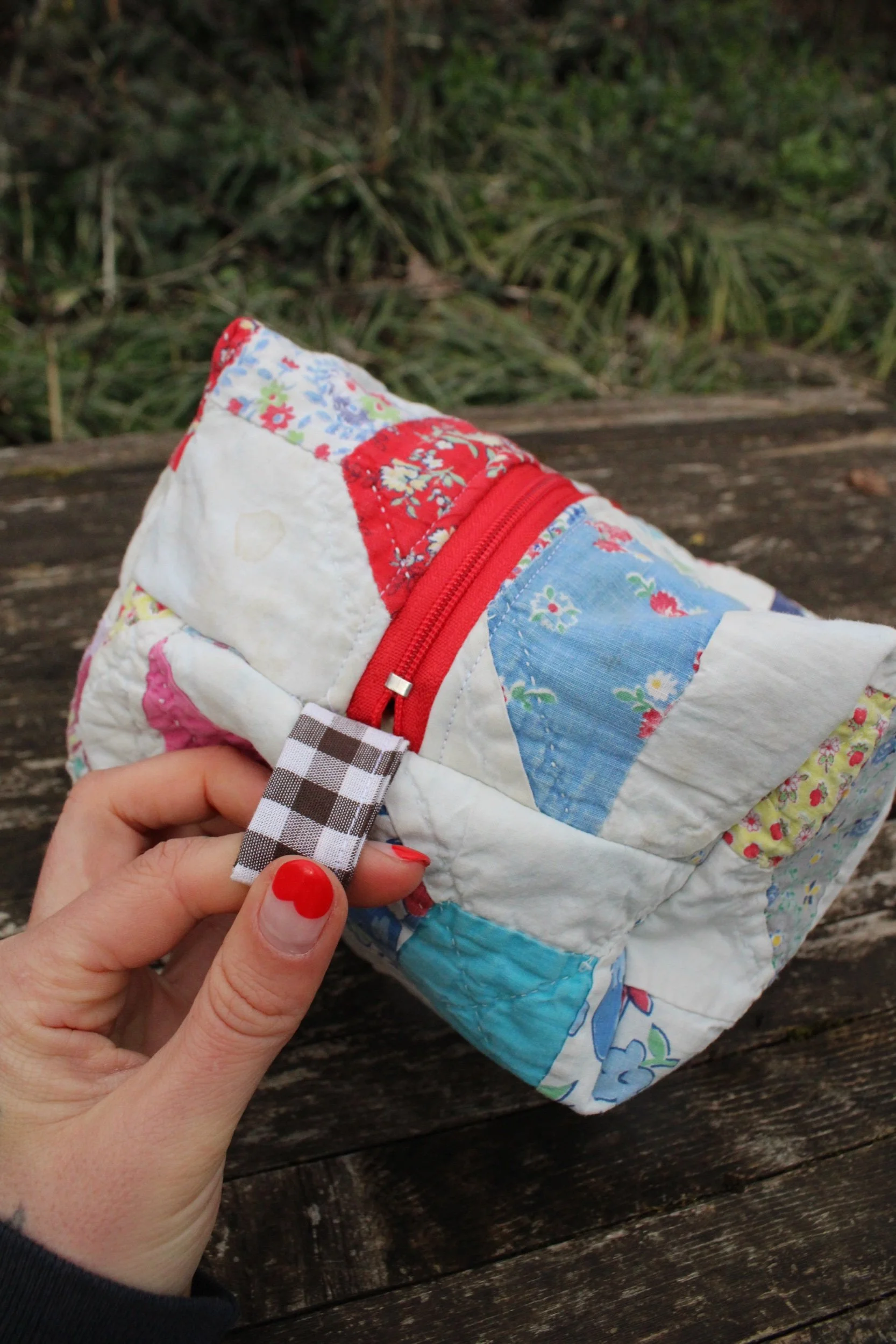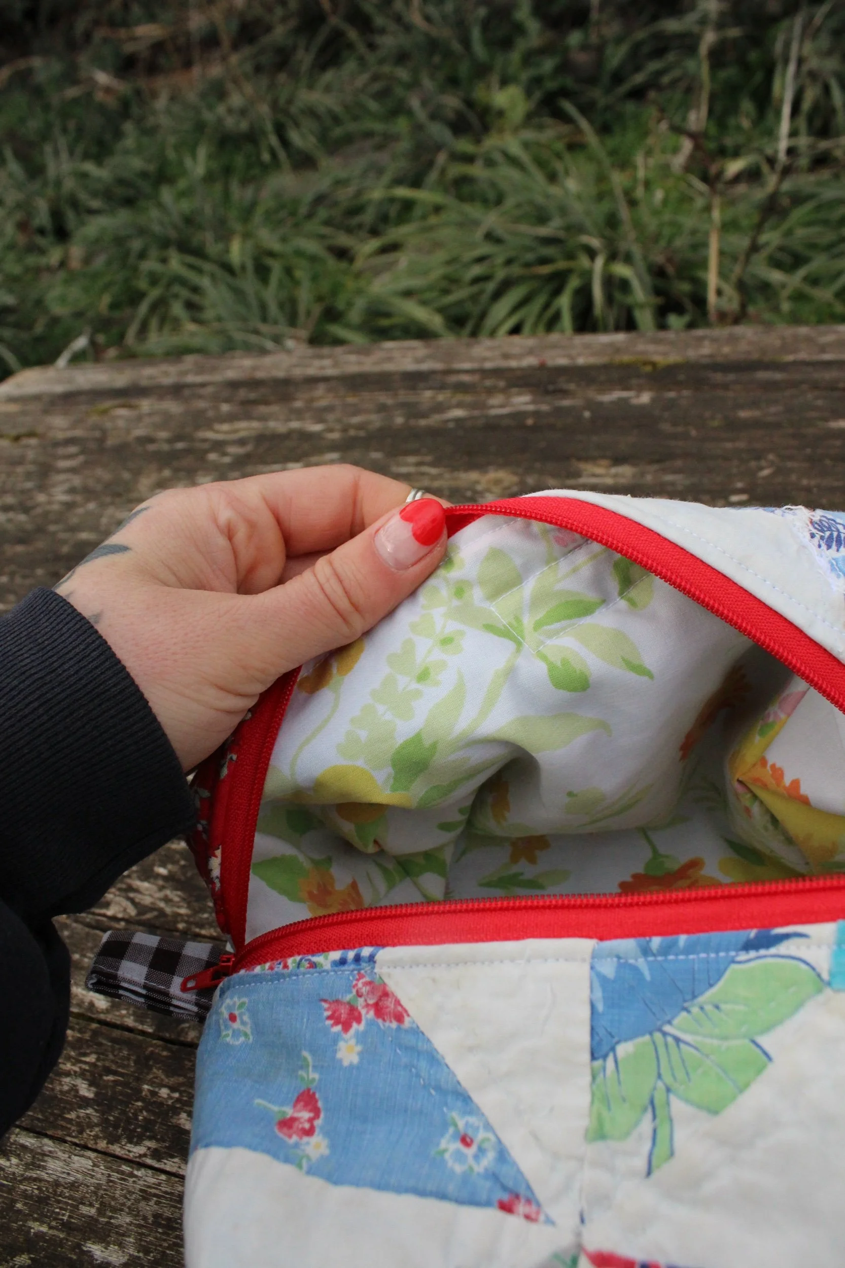 vintage quilt turned travel bag lined with vintage bed sheets and two pull tabs, with a vintage plastic zipper