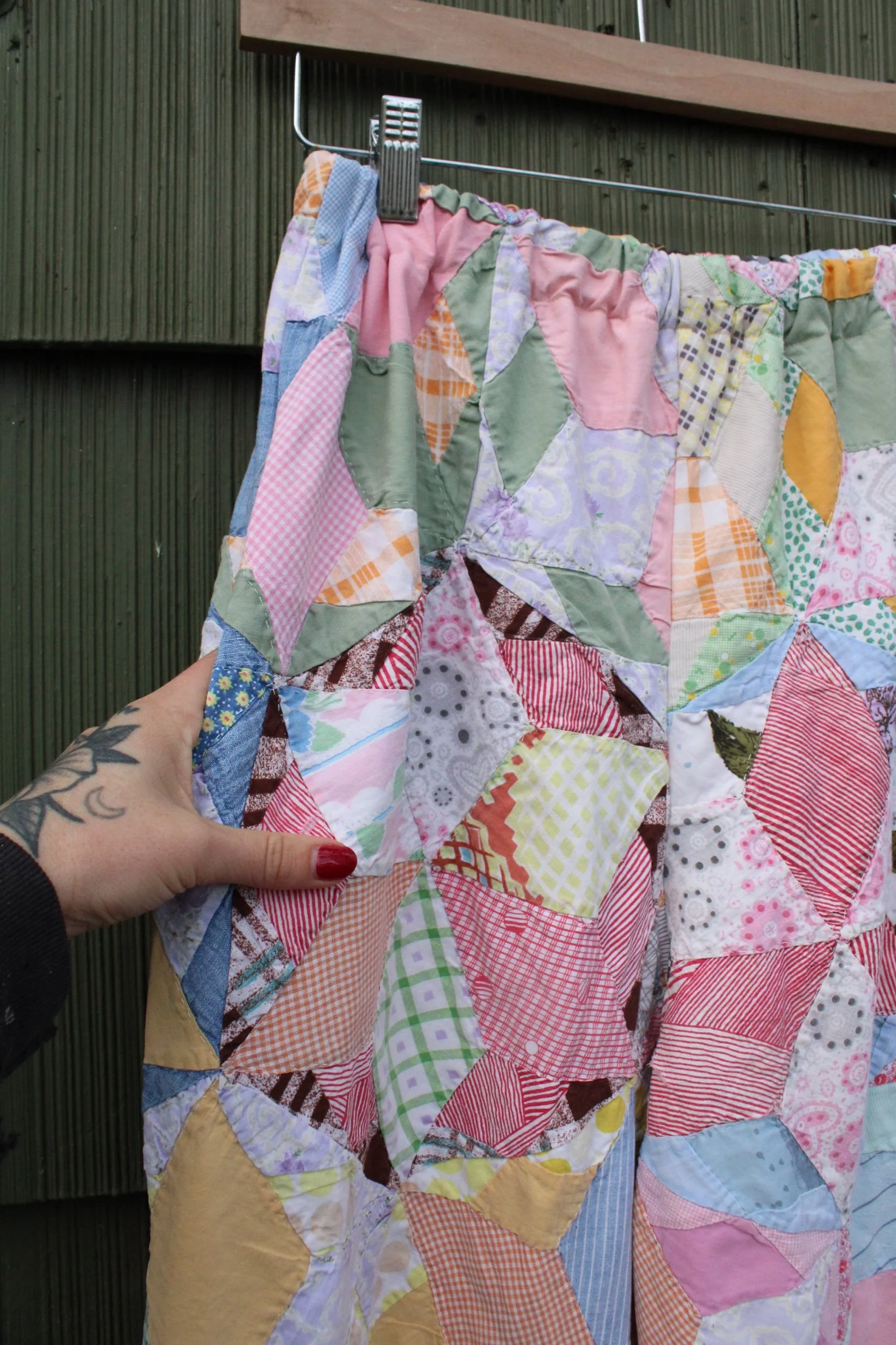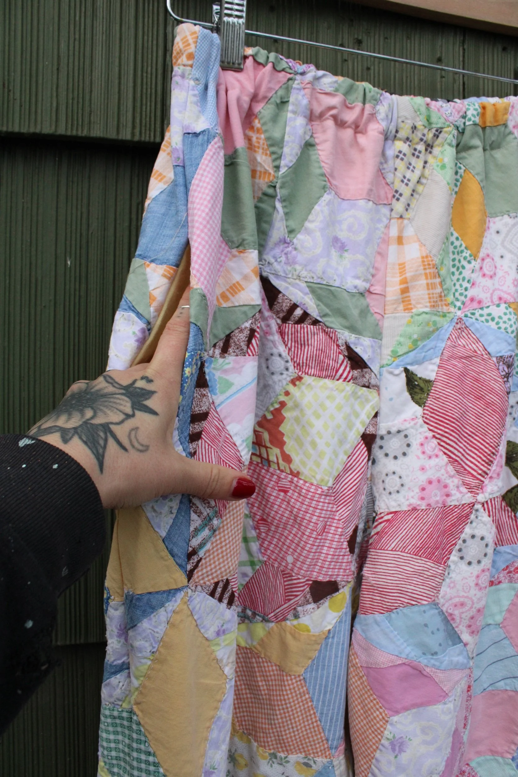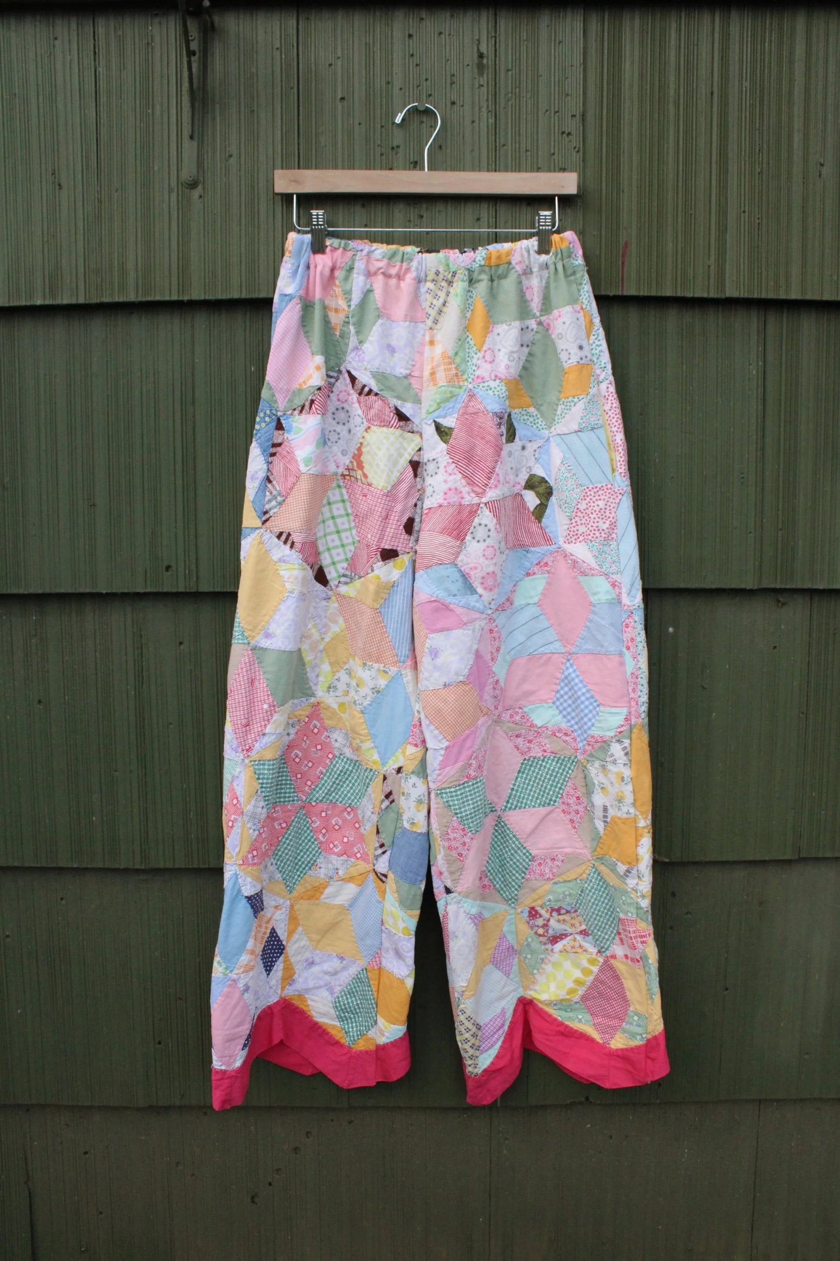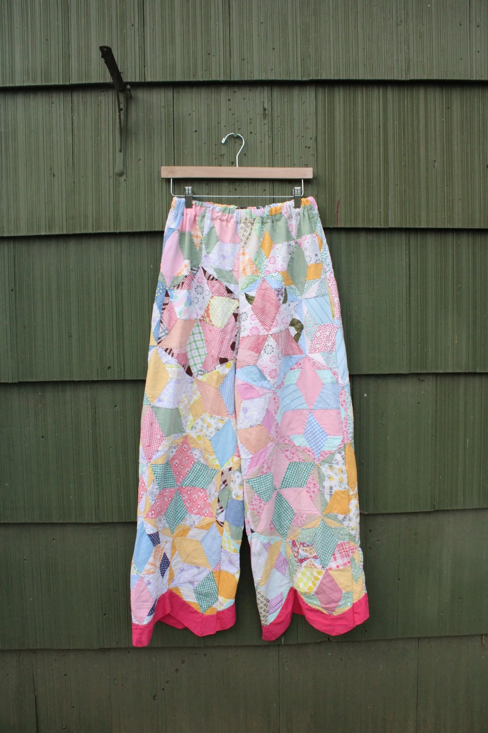 vintage thinner quilt (not lined with thick batting) turned pants utilizing the scalloped edges on the bottom, has side pockets