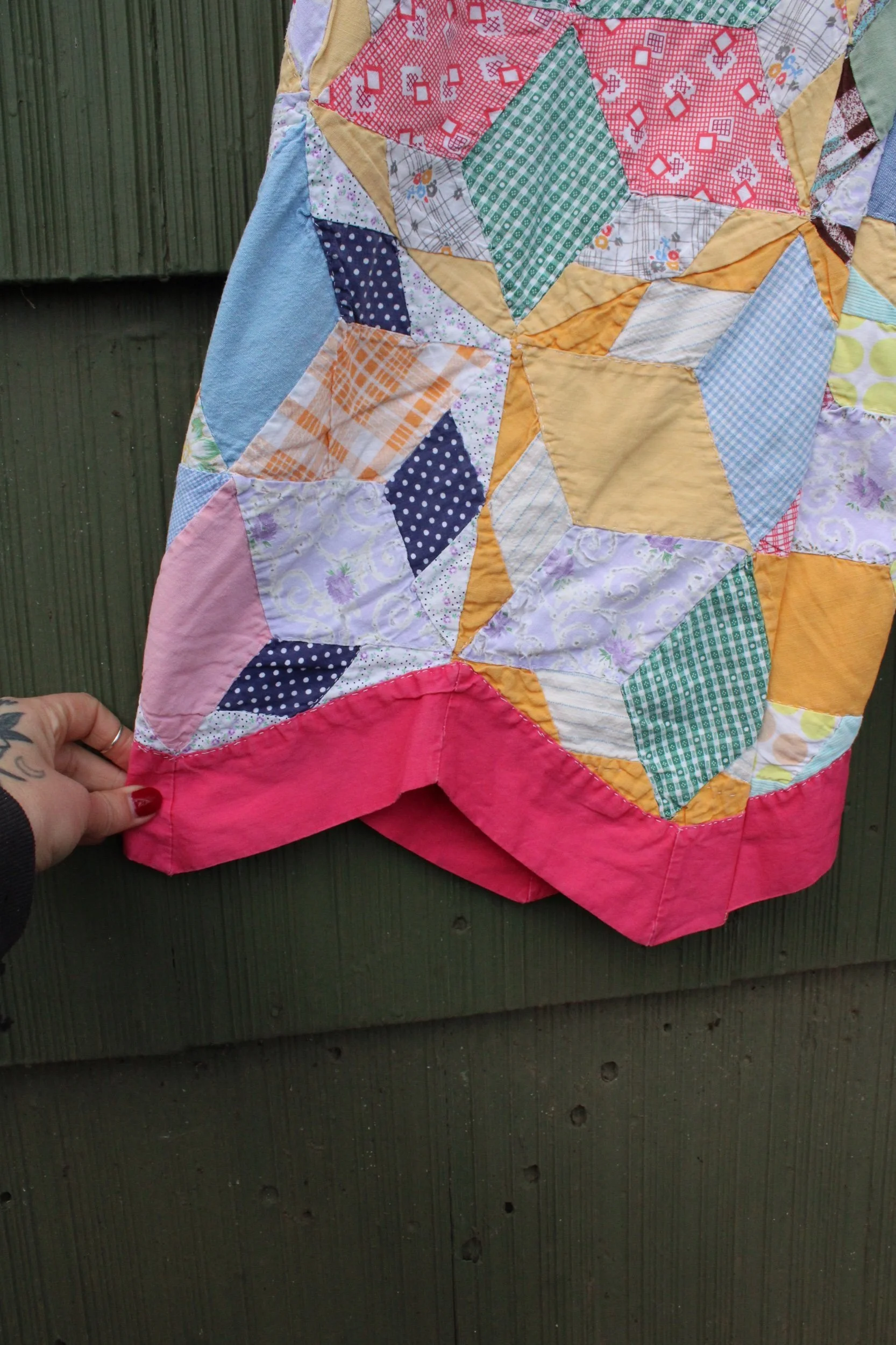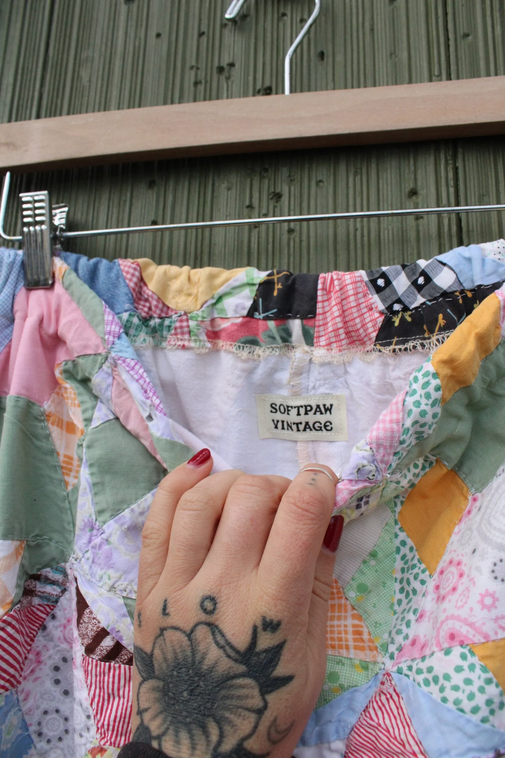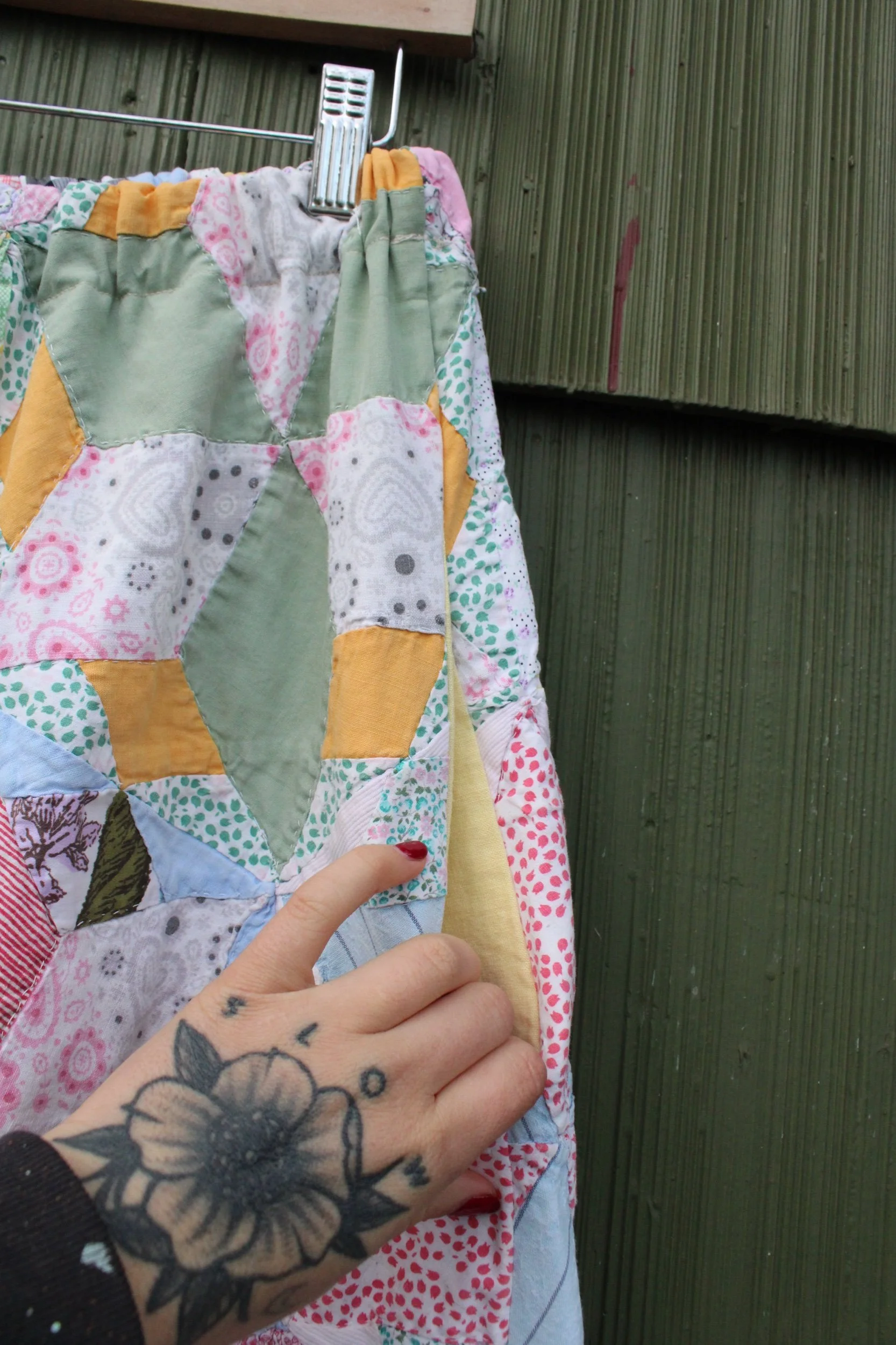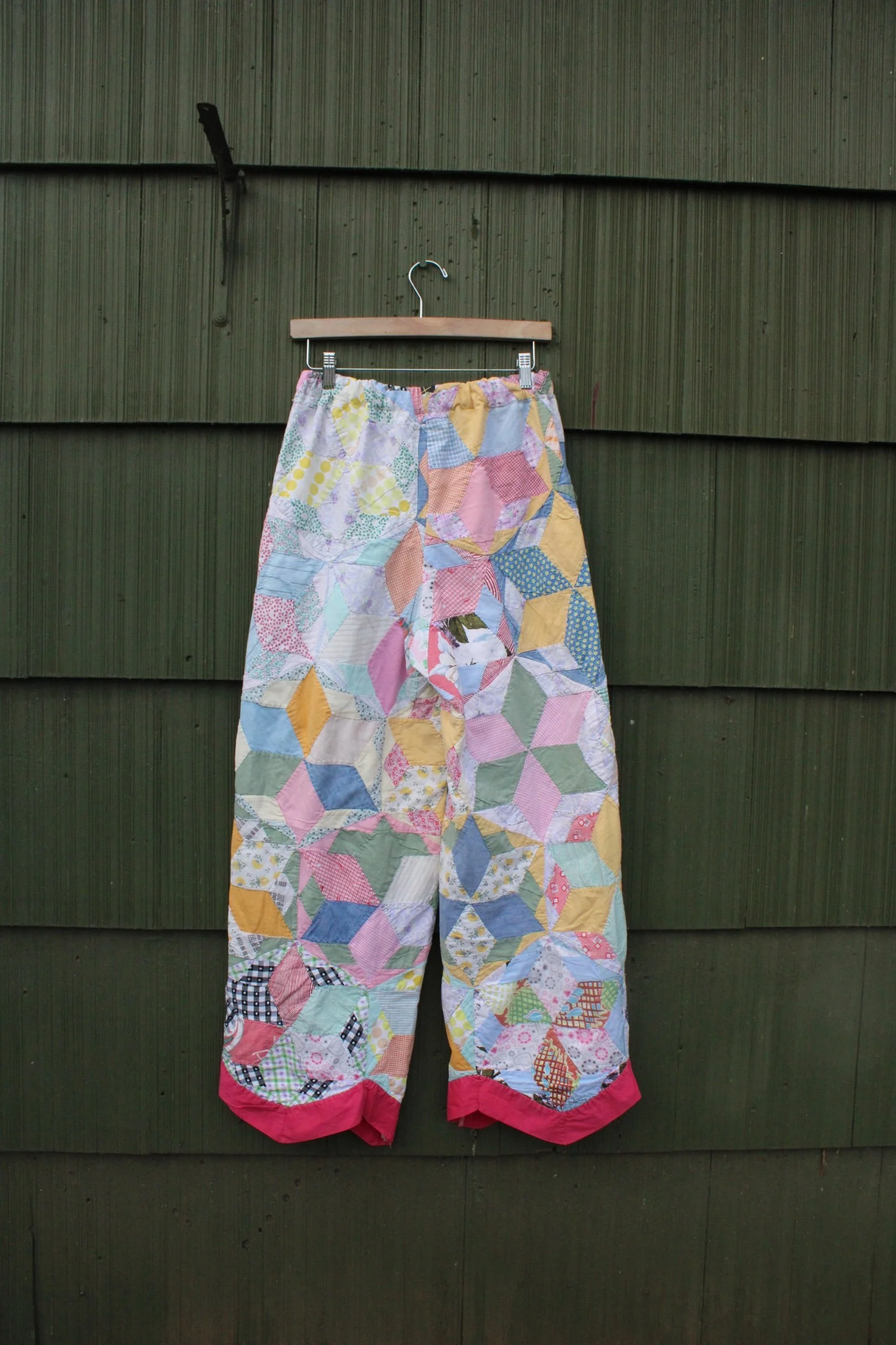 vintage thinner quilt (not lined with thick batting) turned pants utilizing the scalloped edges on the bottom, has side pockets