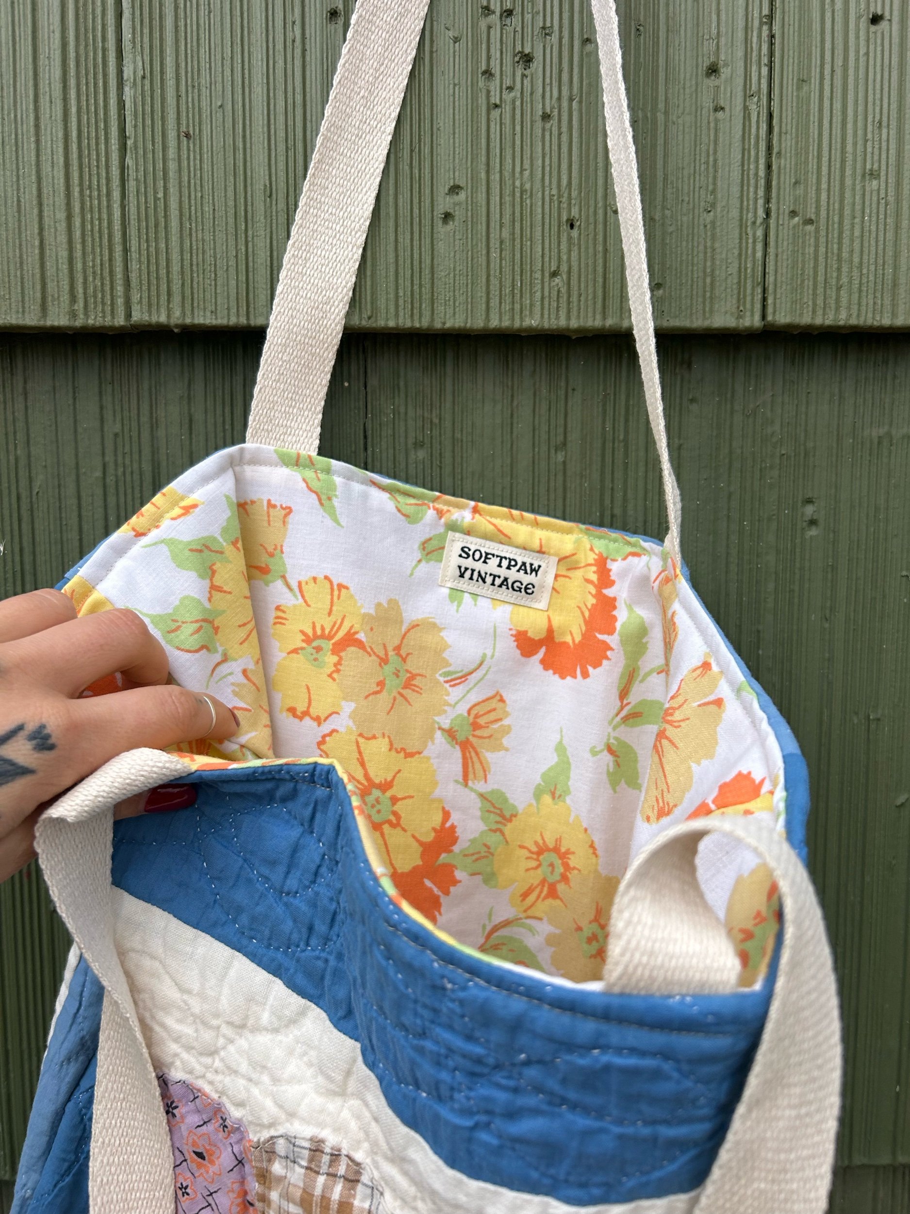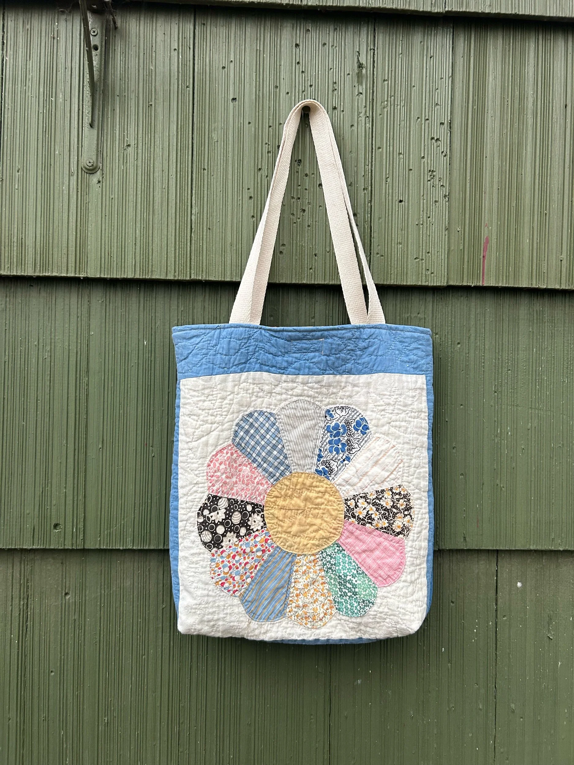 vintage Dresden quilt blocks turned tote bad lined with vintage bed sheets
